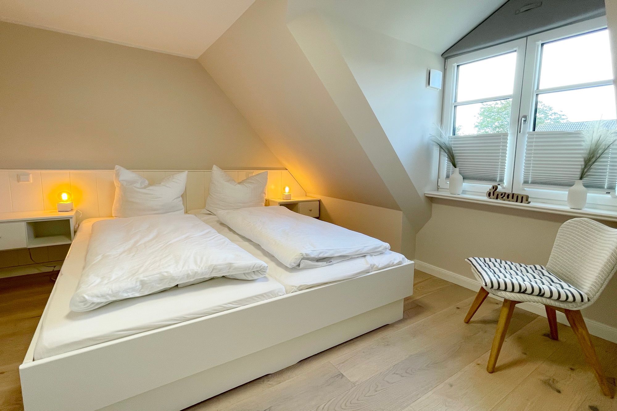 OG: 1 Schlafzimmer mit Doppelbett, 1 Schlafzimmer mit Einzelbett und ein modernes Duschbad. Zusätzlicher Raum im SB mit weiterer Schlafmöglichkeit.