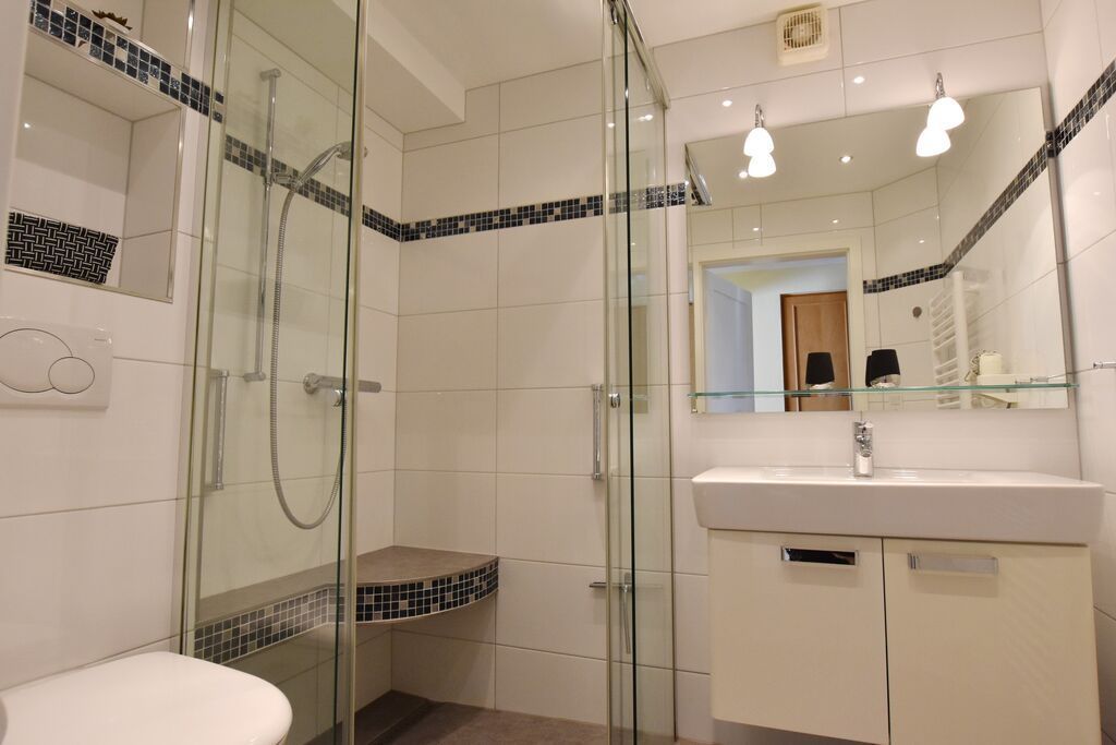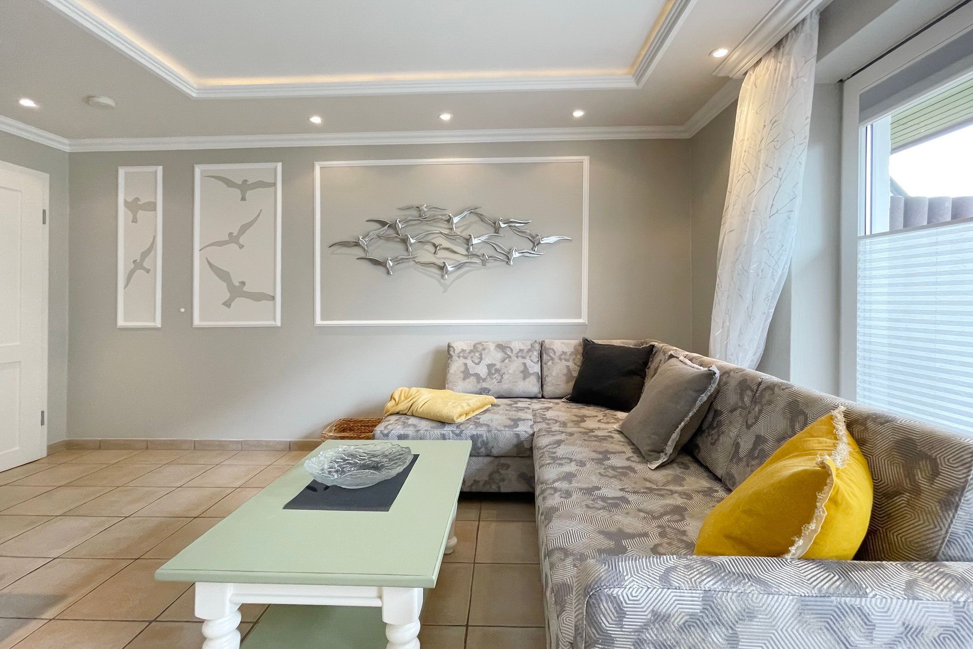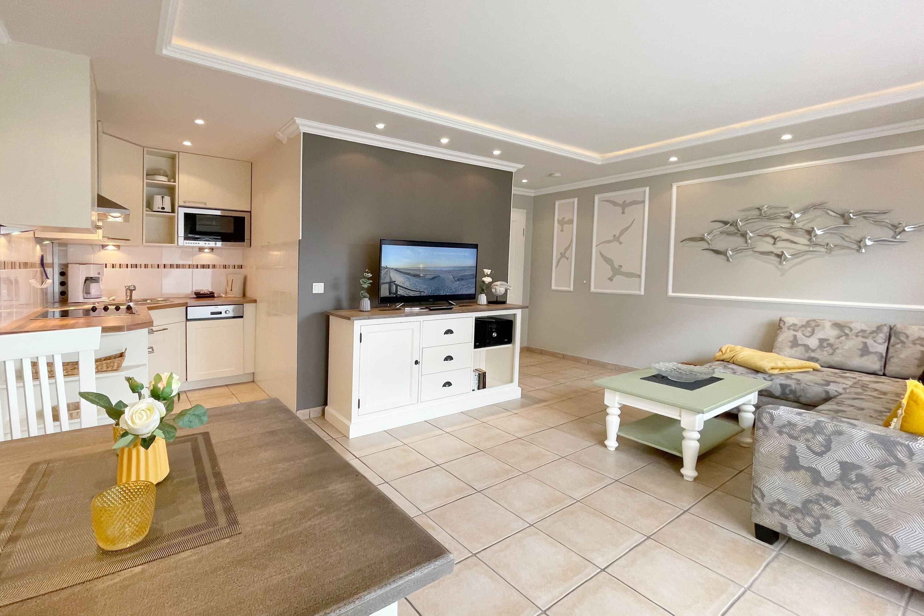 Moderne Ferienwohnung im Erdgeschoss mit Terrasse in südlicher Ausrichtung. Wohnzimmer mit gemütlicher Couch, Essecke für 2 Personen und offener Küchenzeile mit Geschirrspüler und Mikrowelle. Smart-TV und WLAN gehören hier zur Ausstattung. Schlafzimmer mit Doppelbett und zweitem TV. Duschbad mit WC und Waschbecken. Zur Ferienwohnung gehört ein PKW-Stellplatz ( Nr. 3 ) auf dem Grundstück. Im UG befinden sich für die Gäste des Hauses Waschmaschine und Trockner, Nutzung gegen geringe Gebühr. Gerne dürfen Sie hier ein gut erzogenes Haustier mitbringen. Dafür wird dann eine einmalige Haustiergebühr berechnet.
