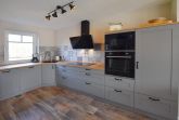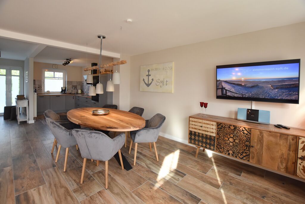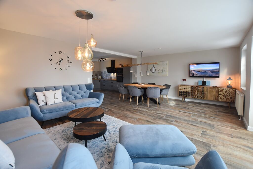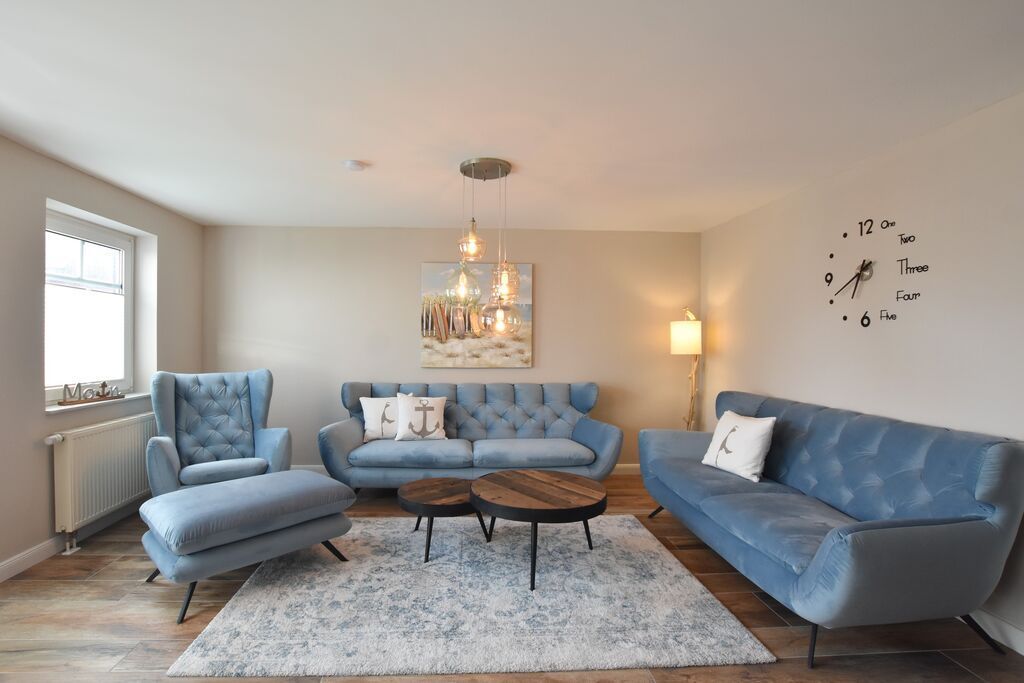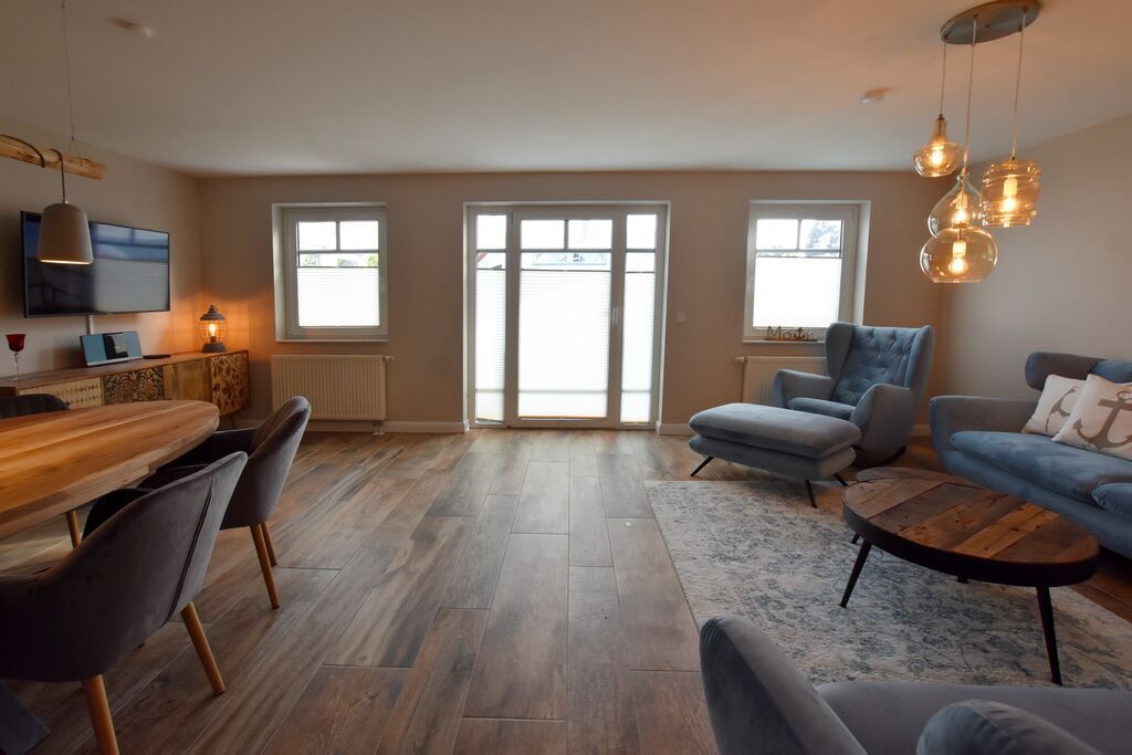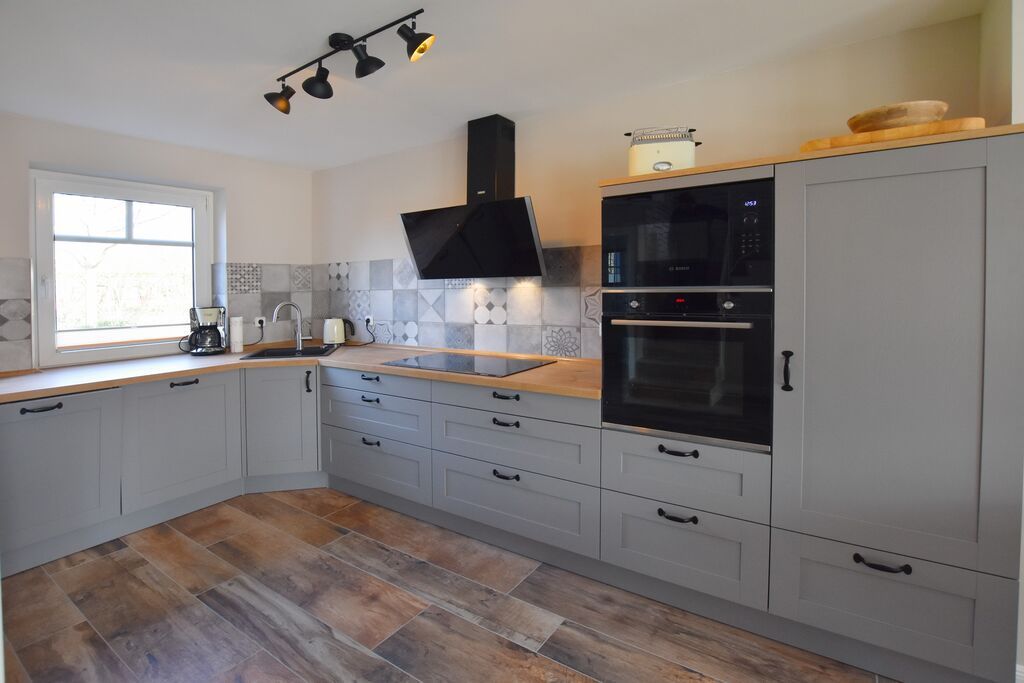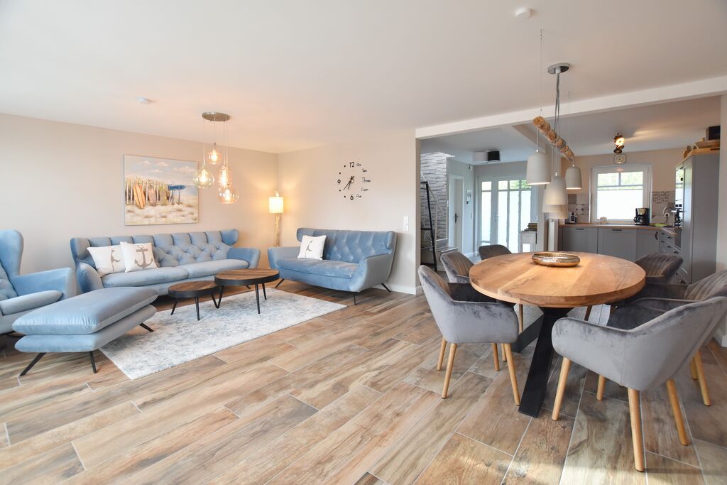 Im Wohnbereich wurden rustikale Holzfliesen verlegt, die das positive Gesamtbild des Ferienhauses abrunden. Die moderne Landhaus-Küche verfügt über ein großes 5 Platten, Induktionskochfeld, eine Microwelle, Geschirrspüler, Nespresso-Kapselmaschine und viele weitere Extras. Die Essecke, 2 Sofas, ein Schaukelsessel mit Fußhocker zum Relaxen und ein großes 50 Zoll Smart TV mit Kabel HD bieten bis zu 6 Personen genug Platz für einen erholsamen Urlaub im Ferienhaus Erika. Ein modernes Duschbad ( Regendusche und Handbrause ) mit Fussbodenheizung, Waschbecken WC und ein kleiner Abstellraum gehören ebenfalls zur Ausstattung.