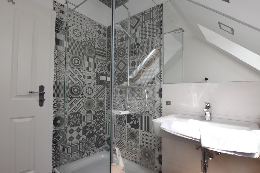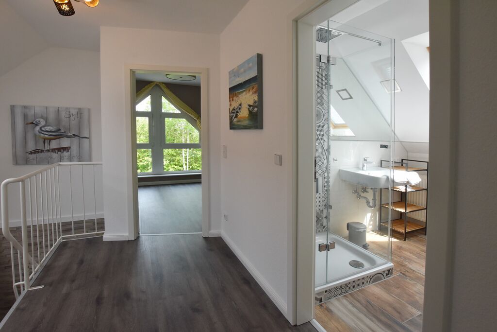 Zweites Badezimmer mit Regendusche und Handbrause , Waschbecken WC und kleiner Abstellraum.