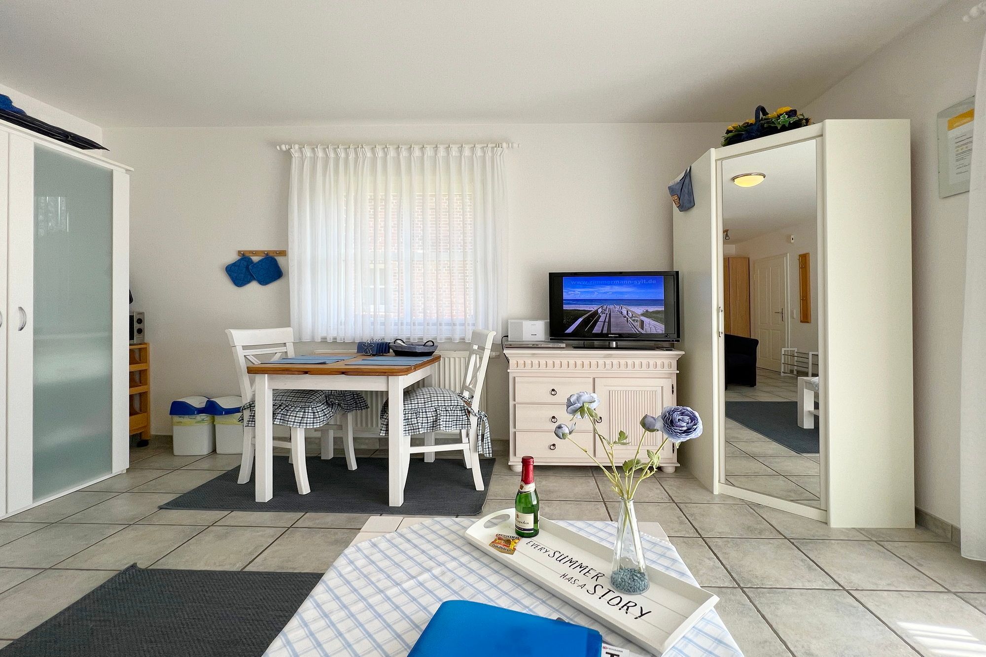 1-Zimmer-Ferienwohnung (EG) mit Terrasse, Wohn-/Schlafraum mit französischem Bett für 2 Personen, Eßecke, Pantryküche, Kleiderschrank, Fernseher, schönes helles Badezimmer mit Wanne (Duschmöglichkeit), Sauna mit im Haus b, Nichtraucher, keine Haustiere erlaubt, allergikerfreundlich,1PKW-Stellplatz, Wäsche inklusive.