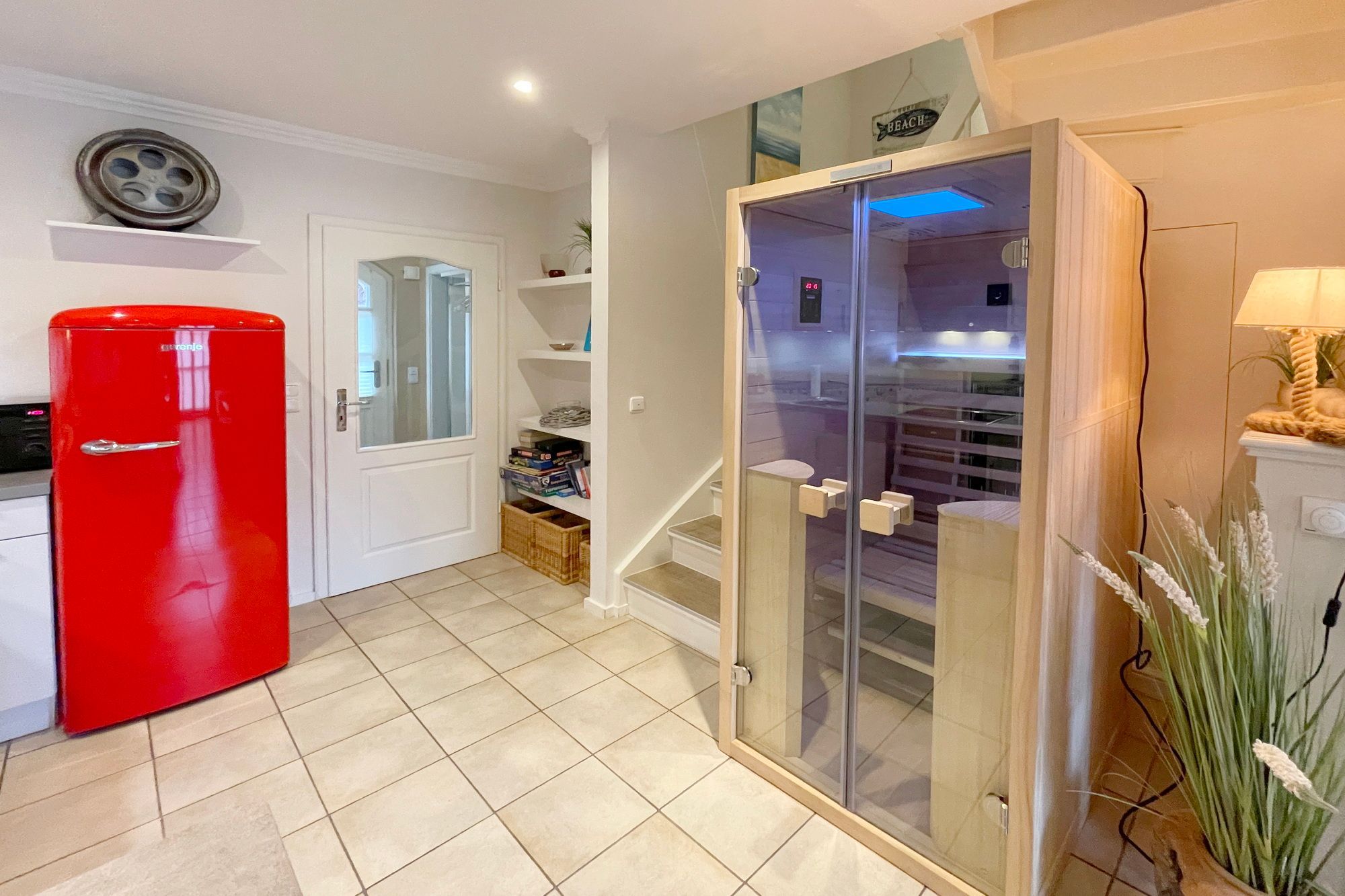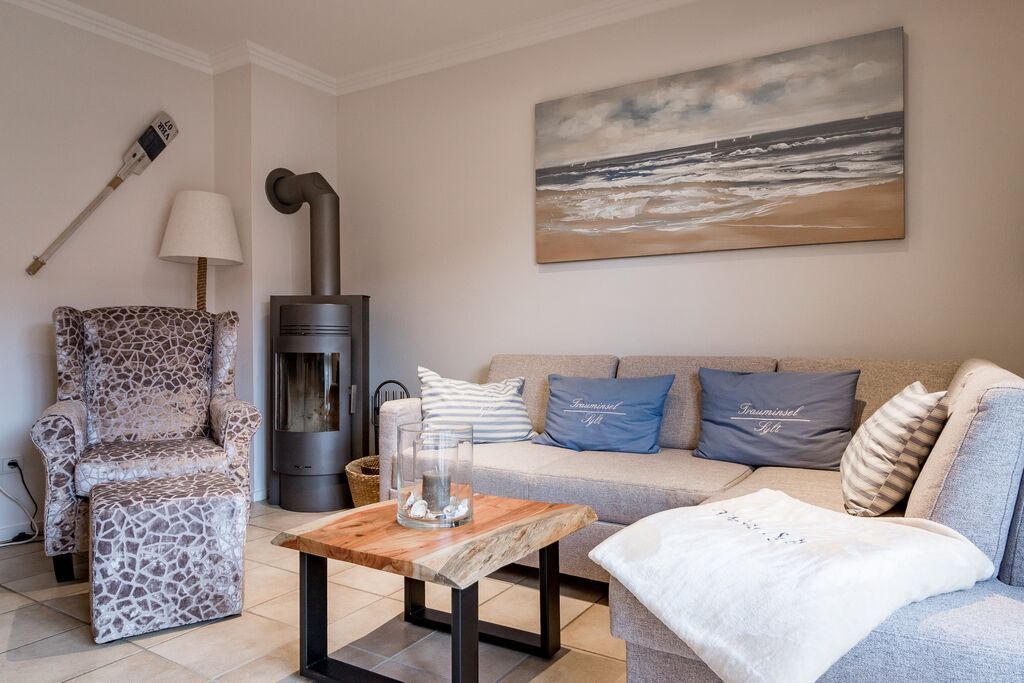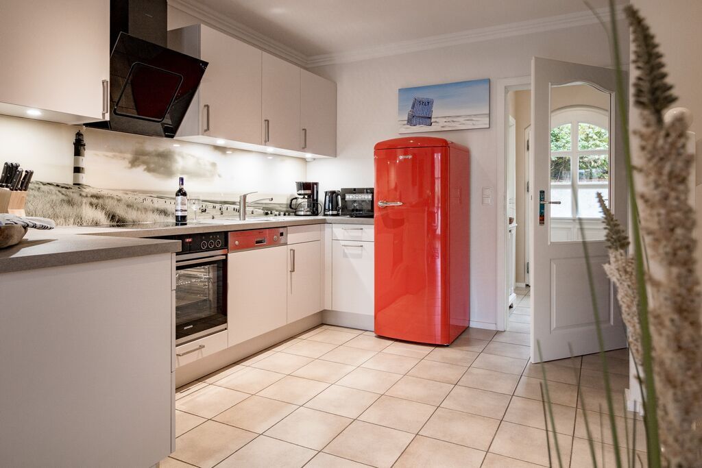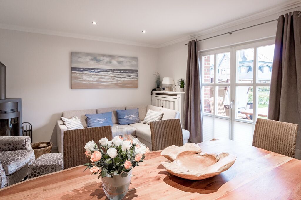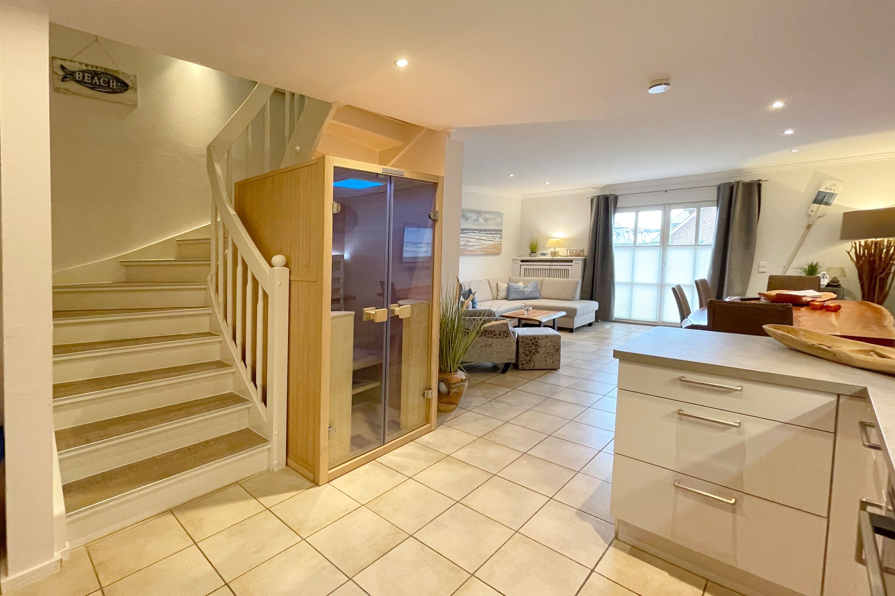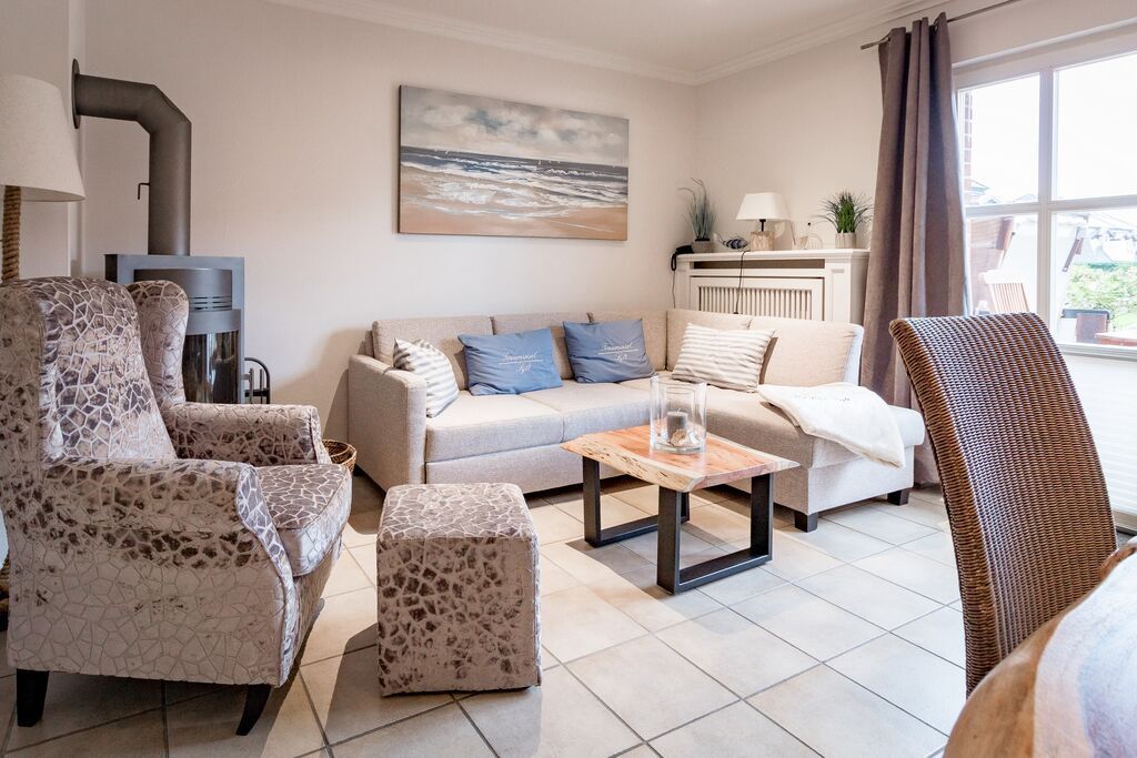 Erdgeschoss: Wohnzimmer mit Kaminofen, Infrarot-Kabine, offener Küche, Essecke und Smart-TV. 1 Duschbad, Flur und Abstellraum mit Waschmaschine und Trockner stehen zur Verfügung. Die Terrasse ist nach Süden ausgerichtet und verfügt über einen Strandkorb und Gartenmöbel. Kaminofen und Weinkühlschrank.