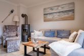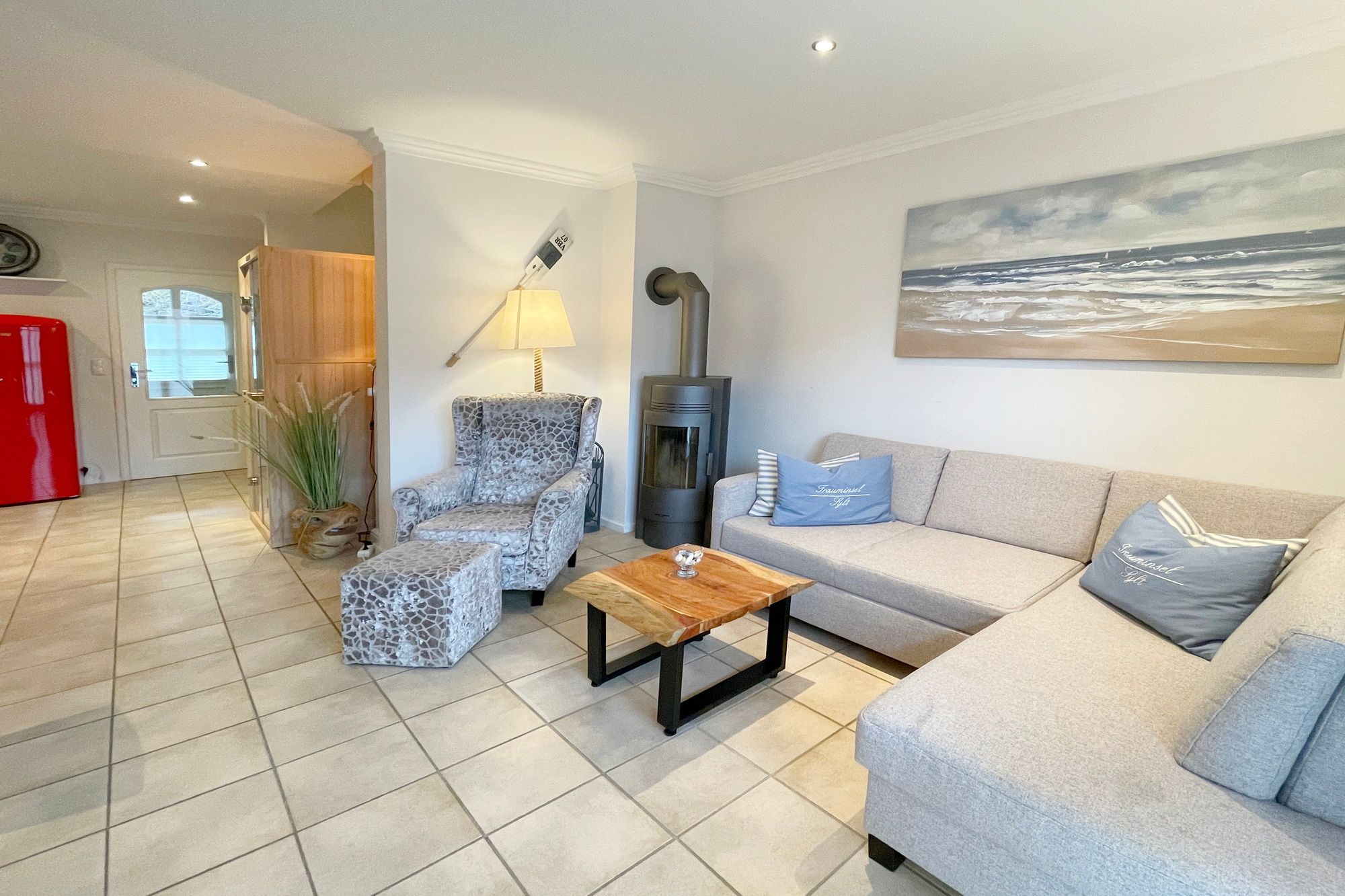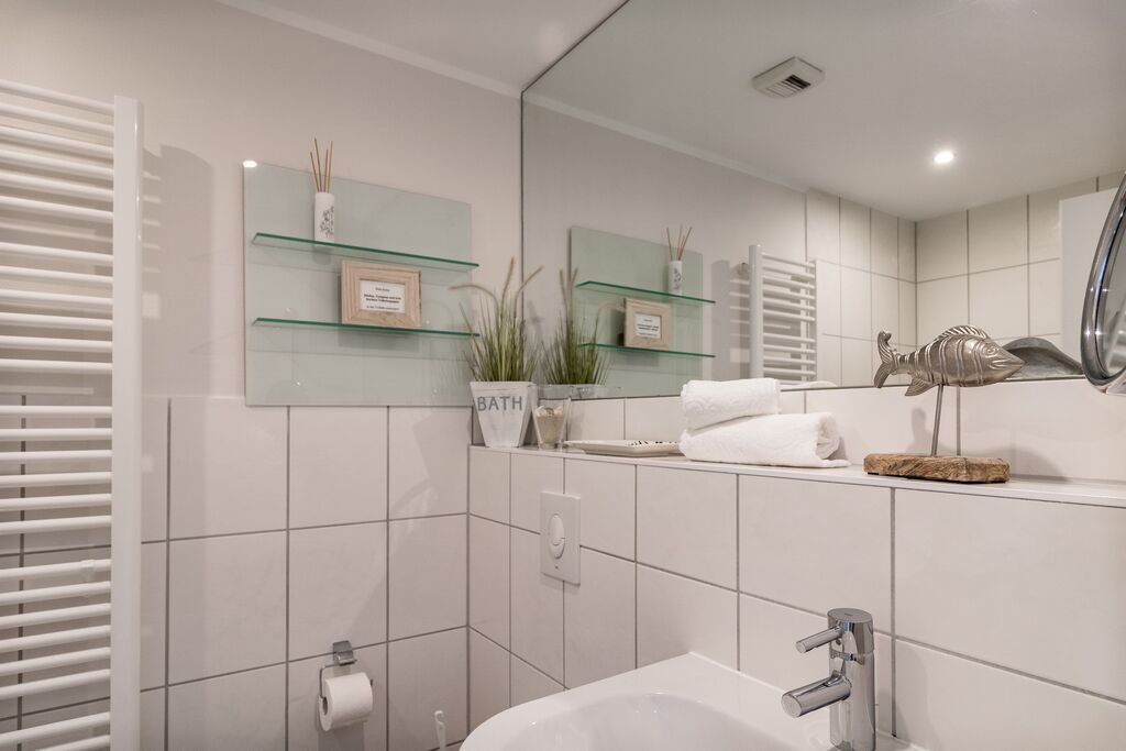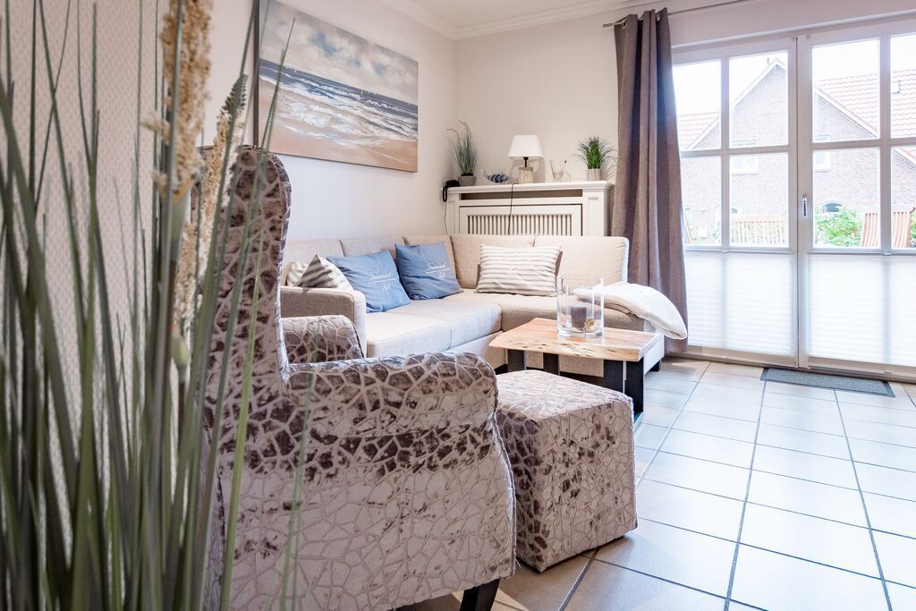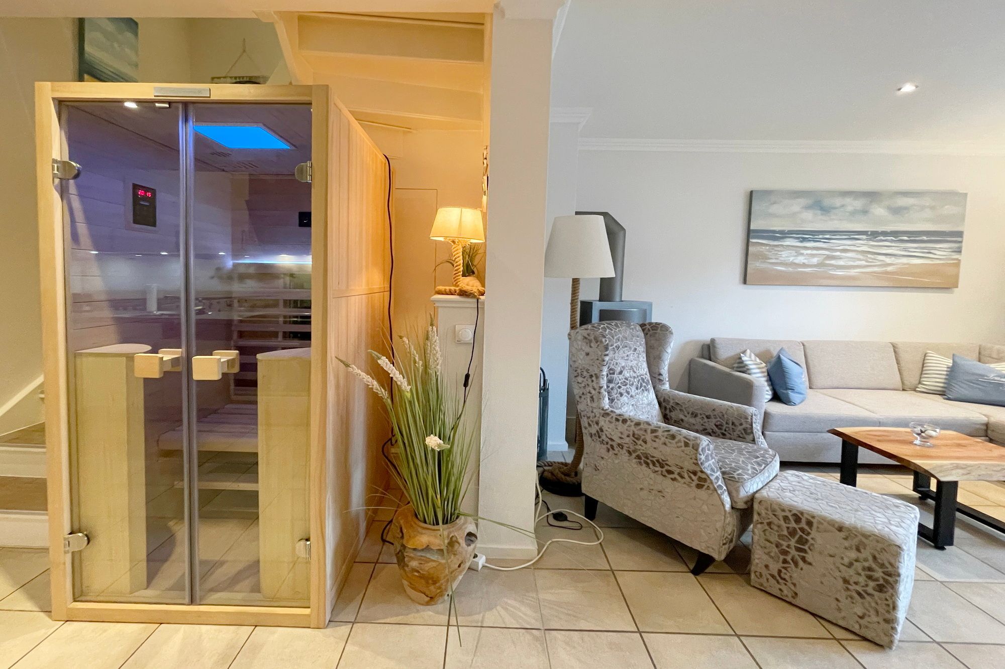 Erdgeschoss: Wohnzimmer mit Kaminofen, Infrarot-Kabine, offener Küche, Essecke und Smart-TV. 1 Duschbad, Flur und Abstellraum mit Waschmaschine und Trockner stehen zur Verfügung. Die Terrasse ist nach Süden ausgerichtet und verfügt über einen Strandkorb und Gartenmöbel. Kaminofen und Weinkühlschrank.