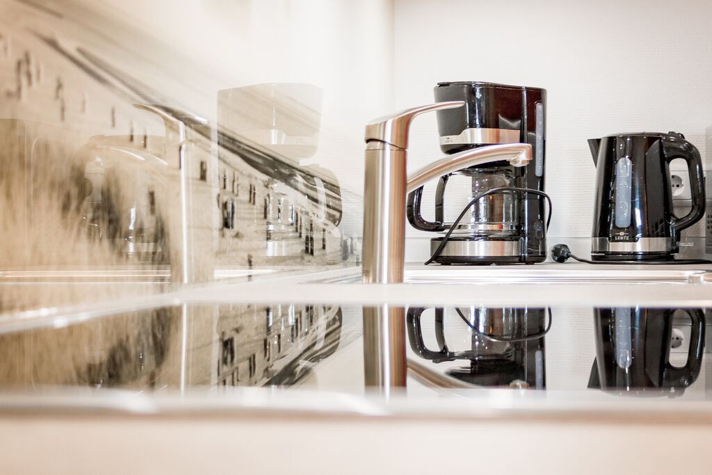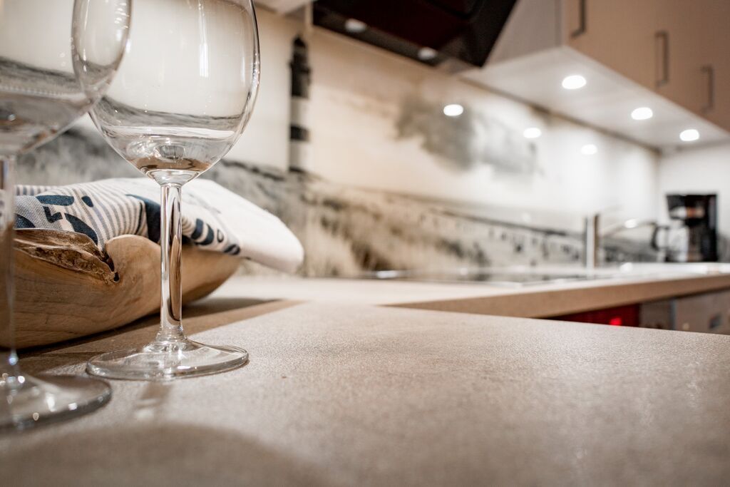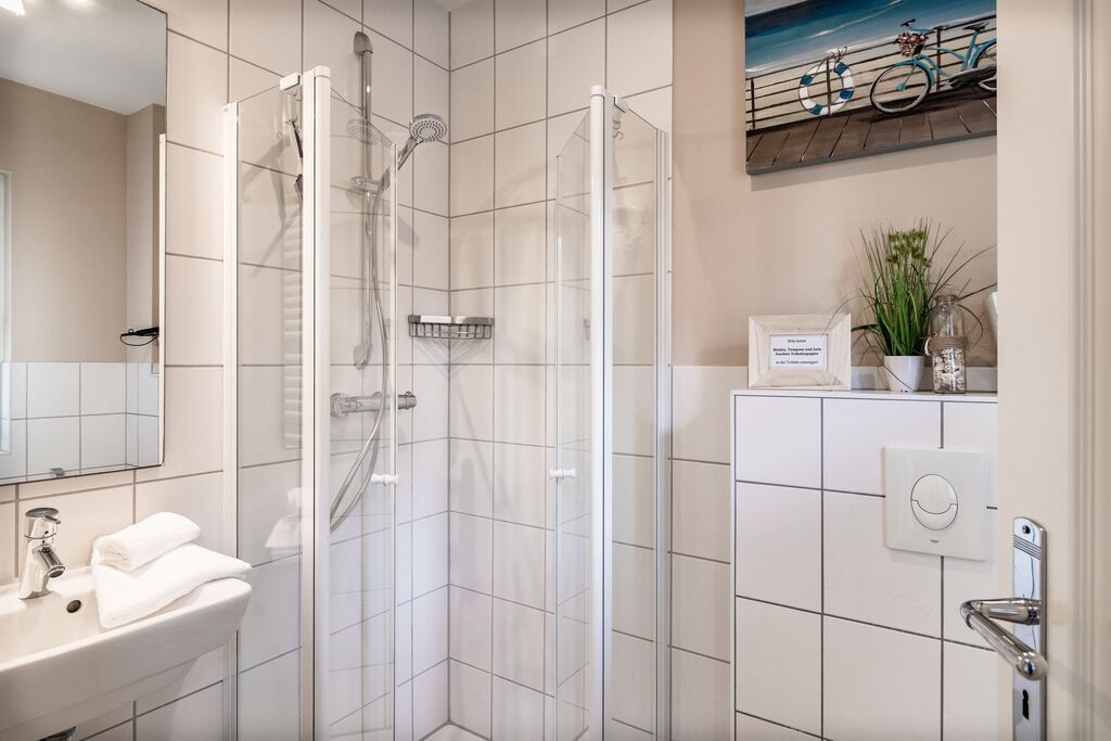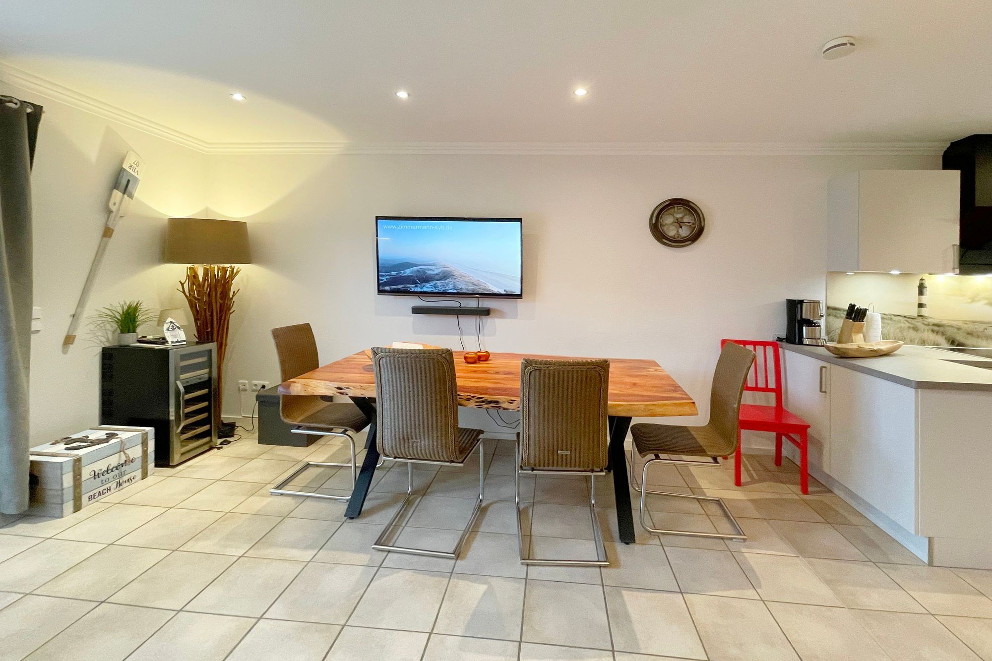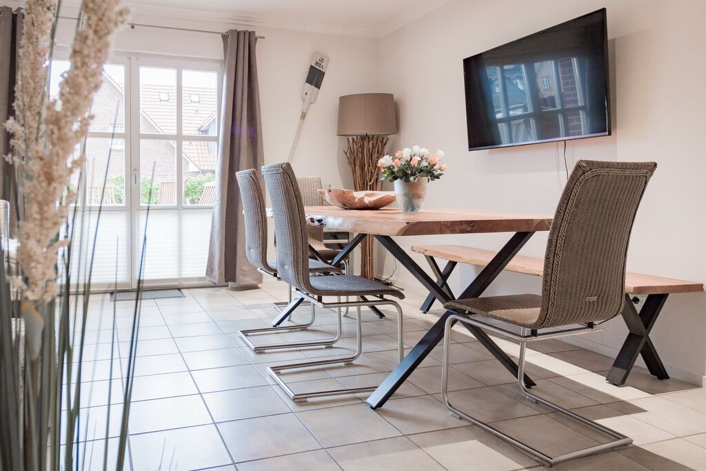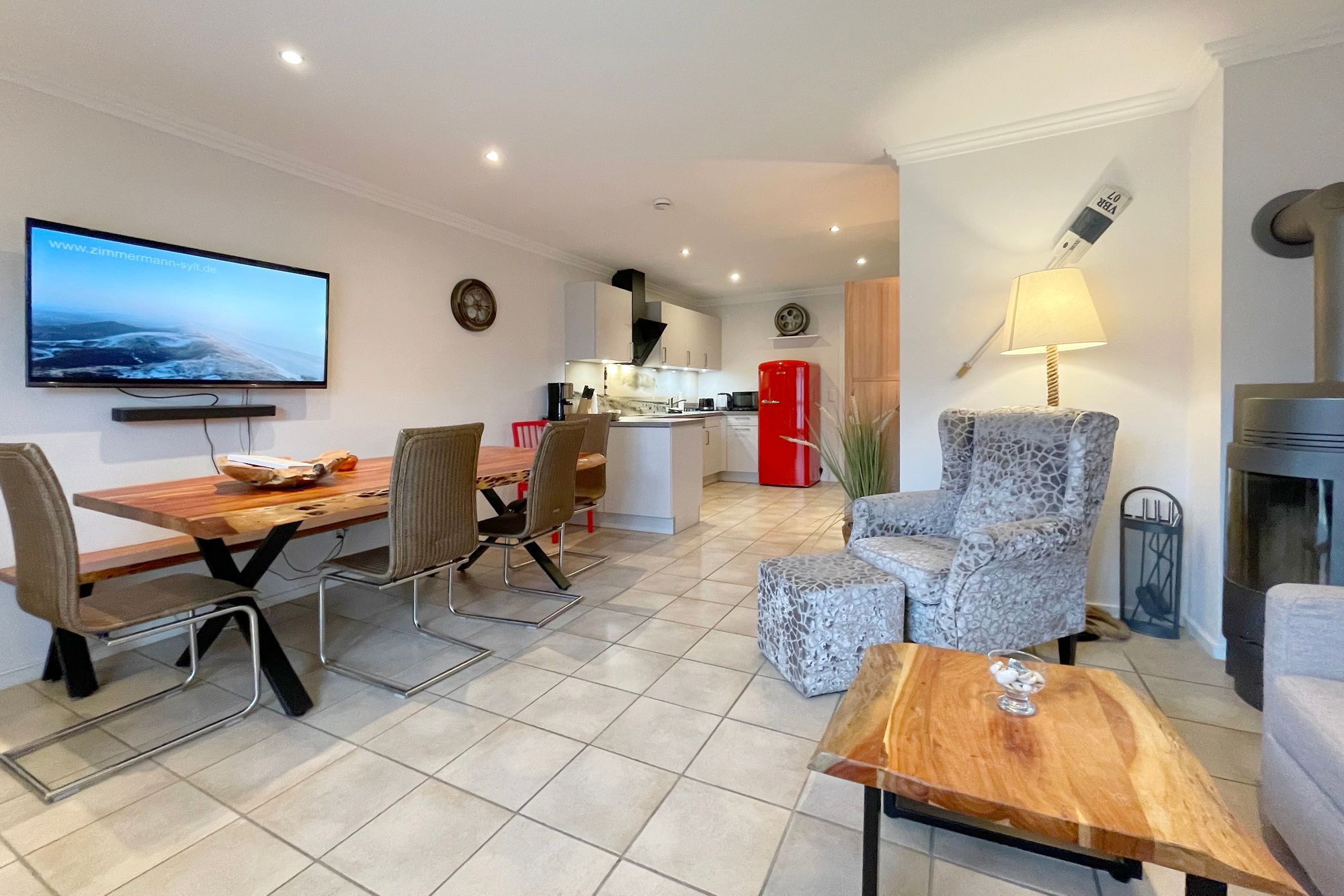 Erdgeschoss: Wohnzimmer mit Kaminofen, Infrarot-Kabine, offener Küche, Essecke und Smart-TV. 1 Duschbad, Flur und Abstellraum mit Waschmaschine und Trockner stehen zur Verfügung. Die Terrasse ist nach Süden ausgerichtet und verfügt über einen Strandkorb und Gartenmöbel. Kaminofen und Weinkühlschrank.