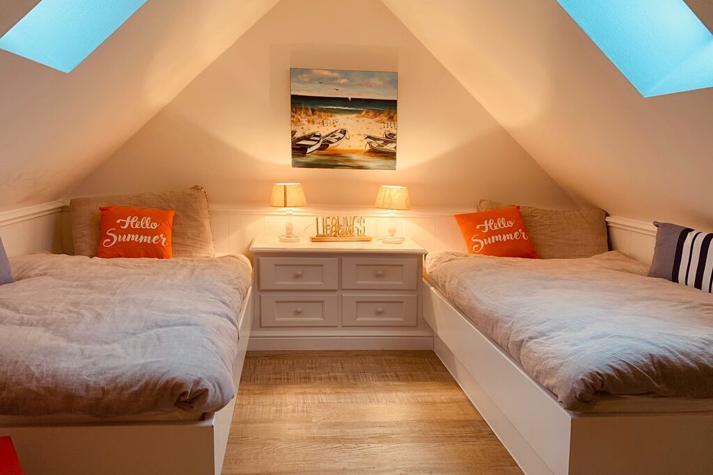 Offener Spitzboden mit 2 Einzelbetten Zum Ferienhaus gehört 1 PWK-Stellplatz ( Nr. 4 ) auf dem Grundstück.