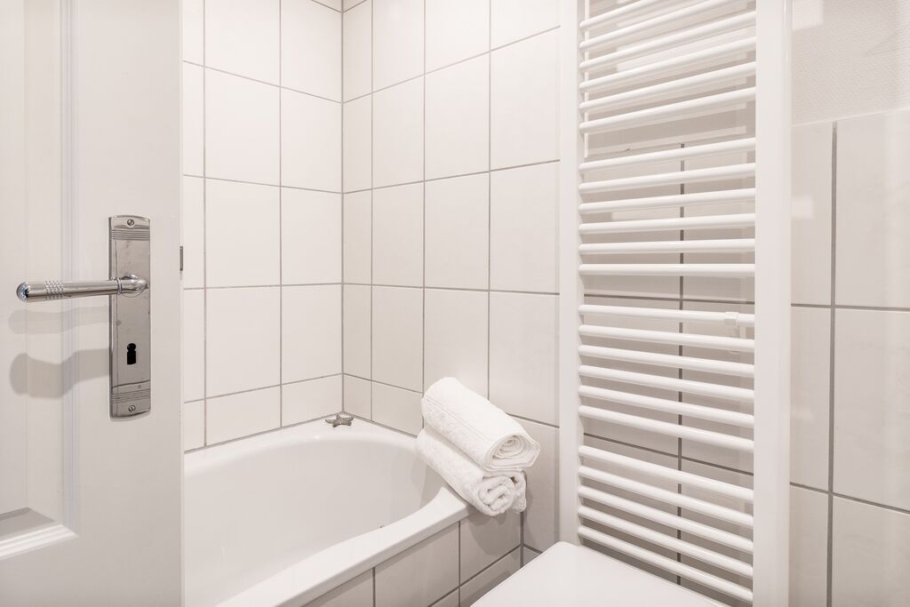 Modernes Wannenbad ( Duschmöglichkeit ), WC und Waschbecken.