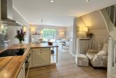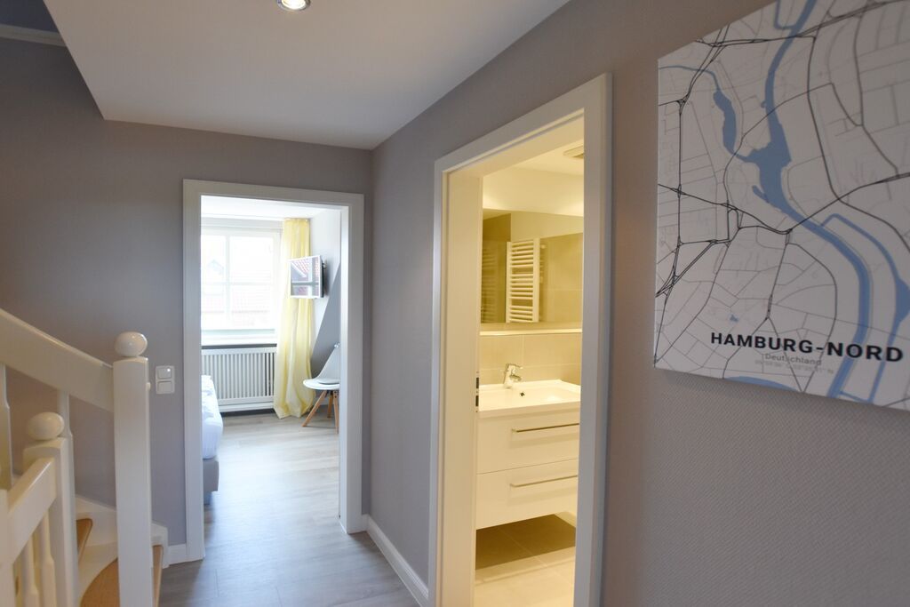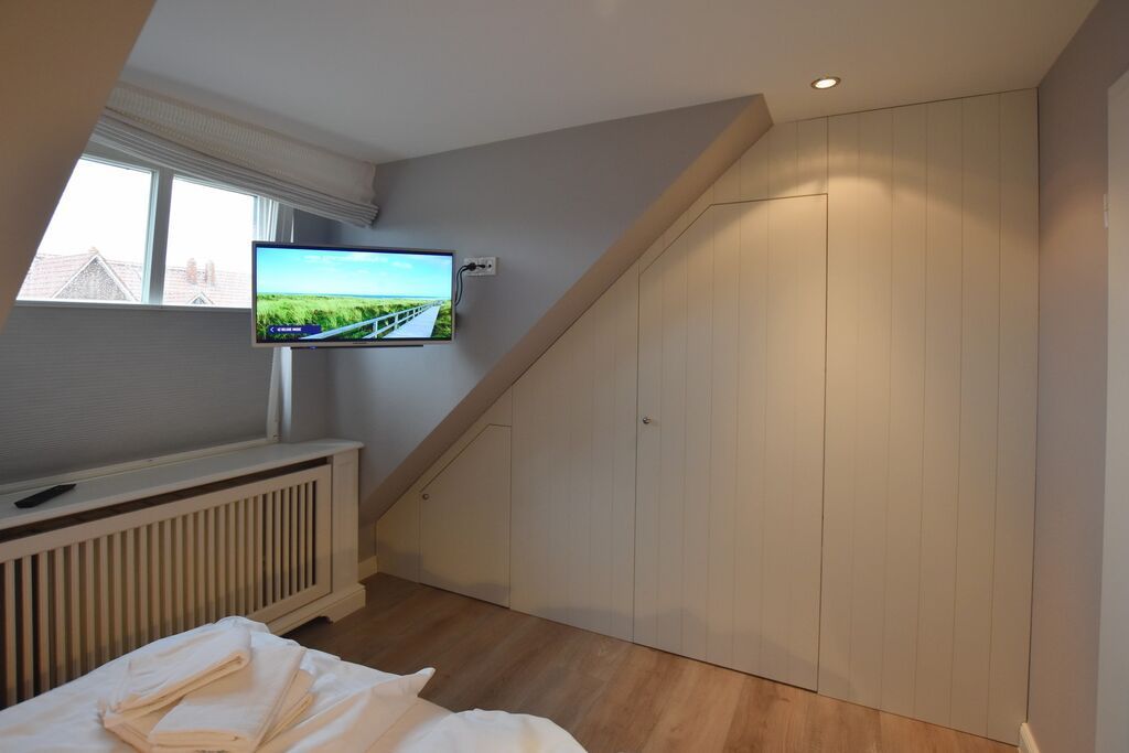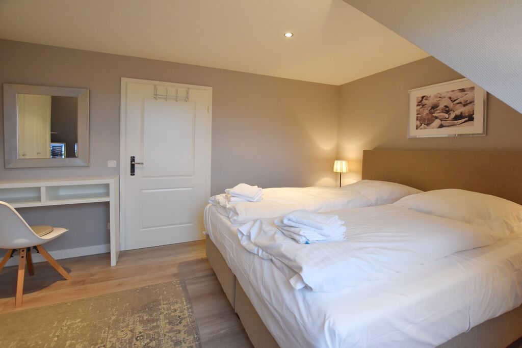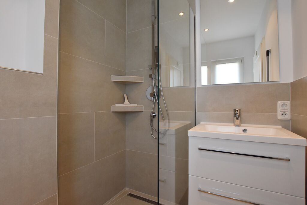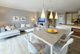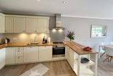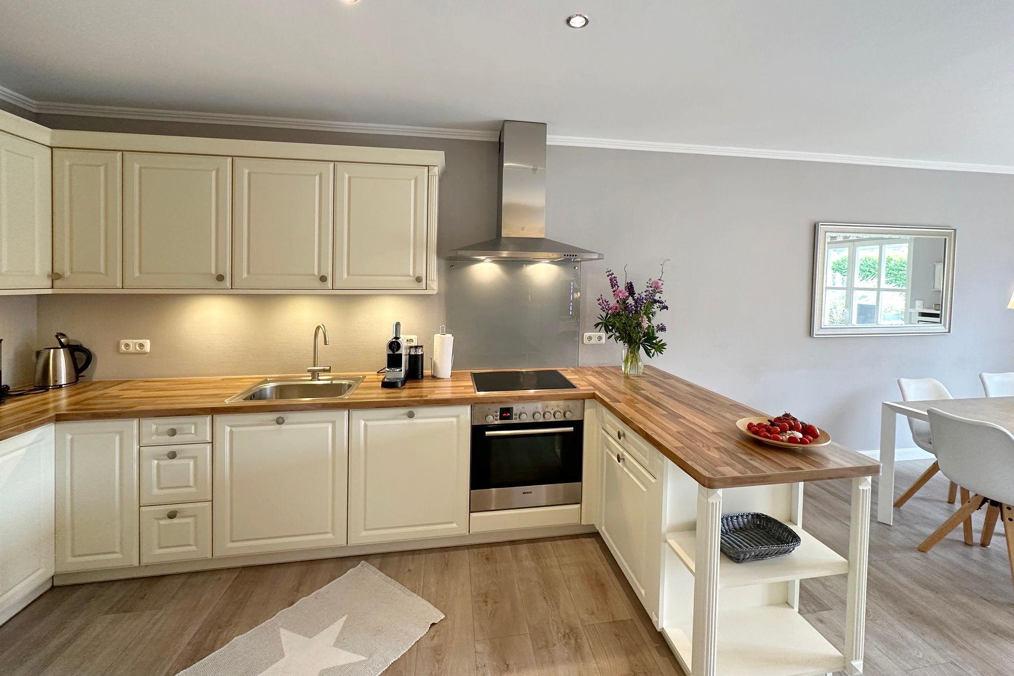 2 moderne Duschbäder ( 1x EG 1x OG ), 2 Schlafzimmer mit Doppelbett und jeweils eigenem TV und ein Wohnbereich mit Zugang zur Süd-Terrasse, eine offene. moderne Landhausküche und Esstisch mit Platz für bis zu 4 Personen.