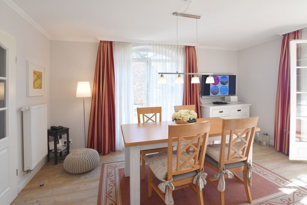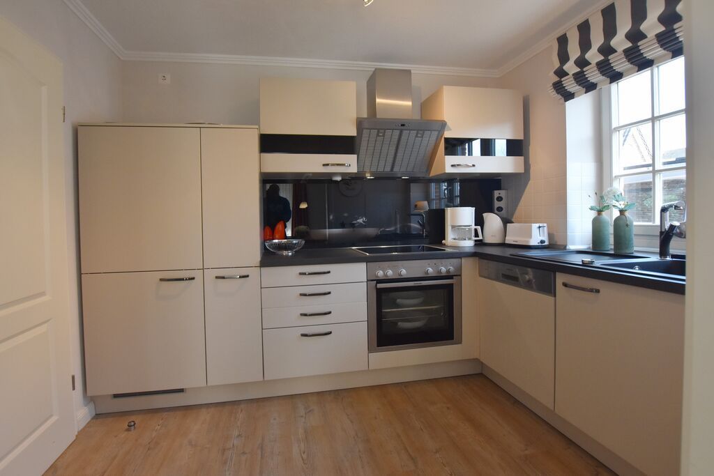 Wohnzimmer mit Ecksofa und Sessel, Esstisch mit 4 Stühlen und TV und Blue-Ray-Player. Direkter Zugang zur großen möblierten Gartenterrasse nach Süden mit Strandkorb und eingewachsenem Garten. Separate Küche mit 4er-Cerankochfeld, Geschirrspüler und allem Komfort wie z.B. Mikrowelle und Backofen.