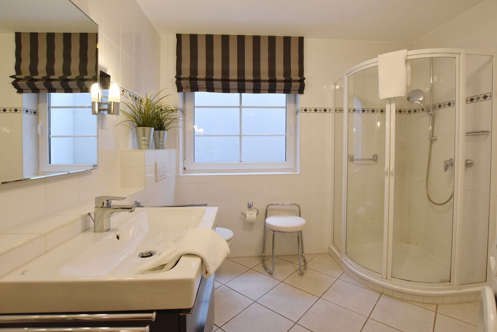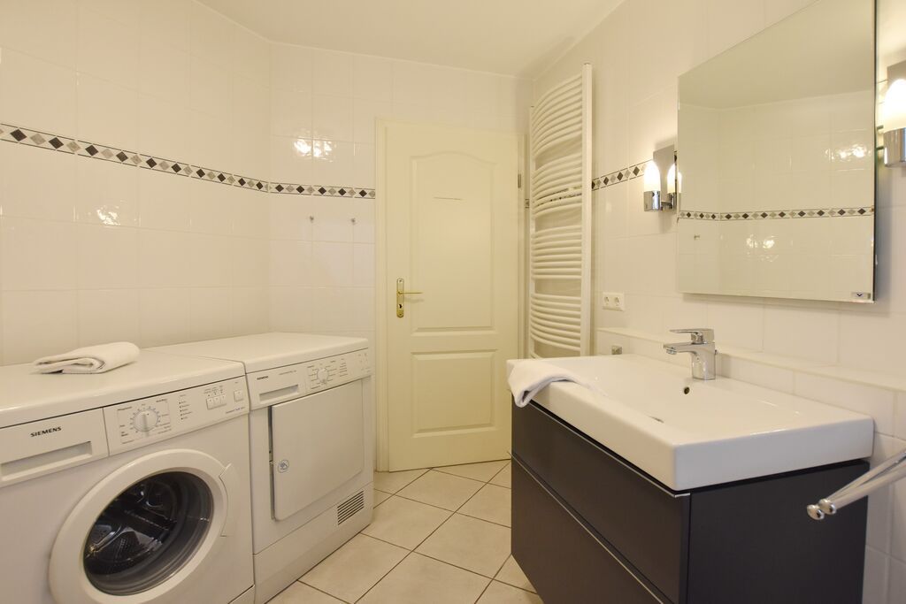 Badezimmer (Duschbad) mit Dusche, WC, Handtuchwärmer, Föhn, Waschmaschine, Trockner und Tageslicht.