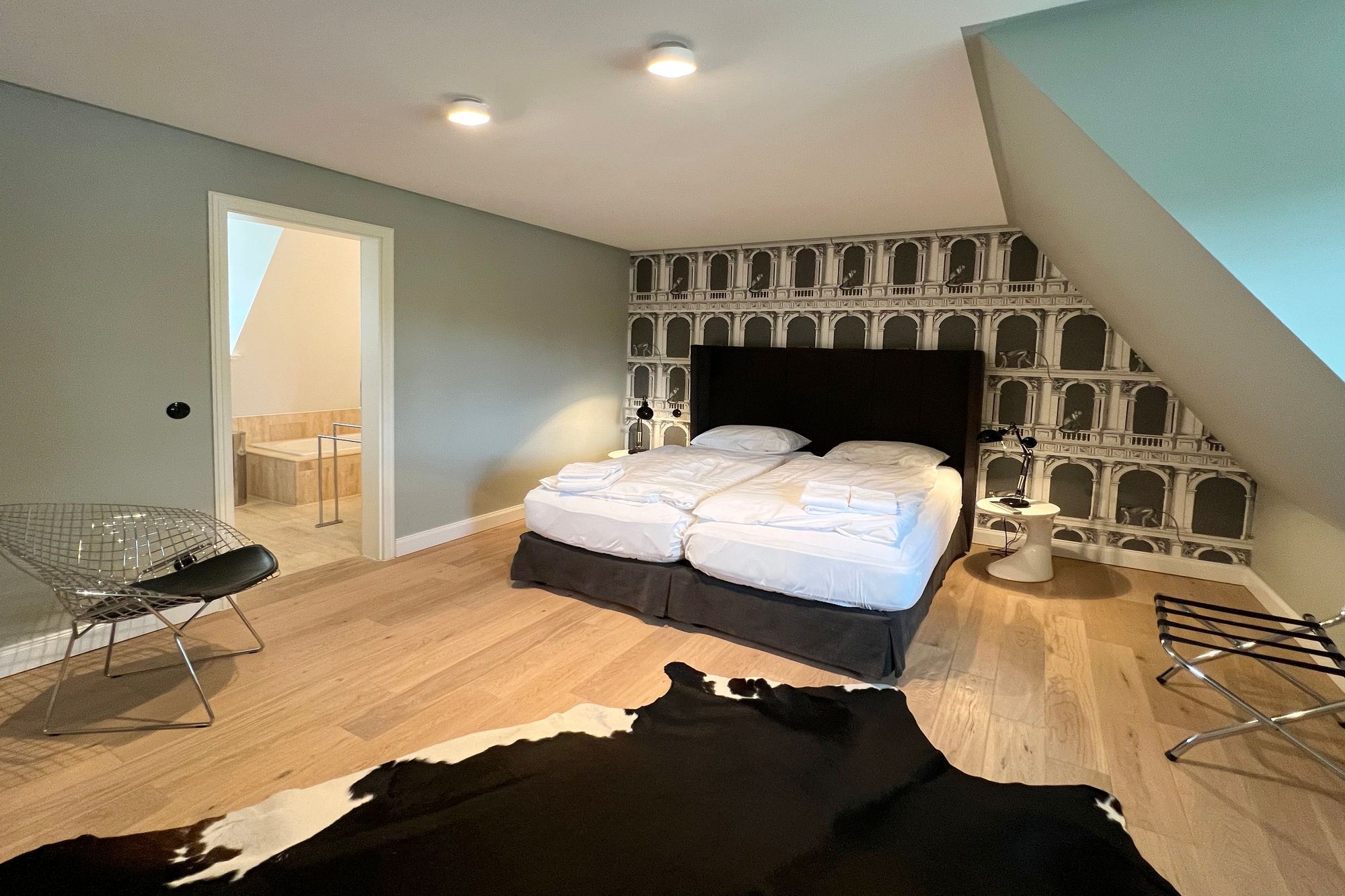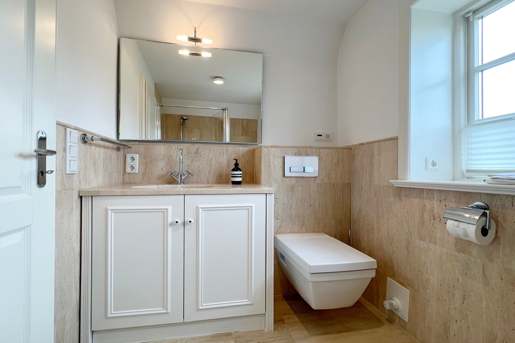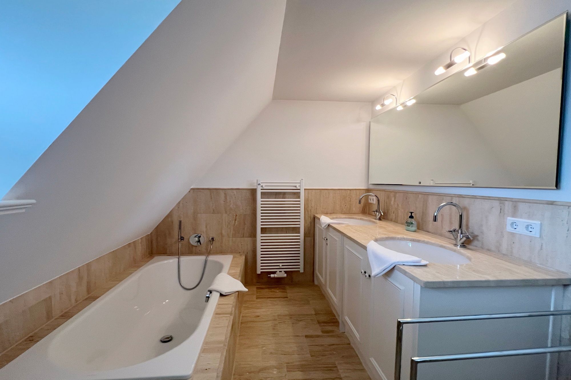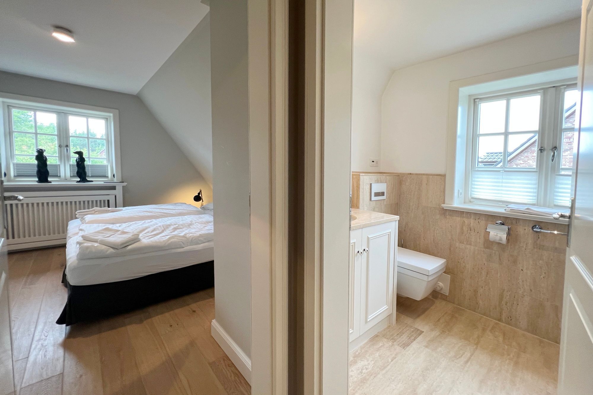 Im Obergeschoss befinden sich insgesamt 3 Schlafzimmer mit Doppelbetten sowie 2 moderne Badezimmer. Eines der Bäder verfügt über eine Badewanne, Dusche und WC, das andere über eine Dusche und WC. Auf dem eingewachsenen Grundstück stehen Ihnen 2 PKW-Stellplätze zur Verfügung.