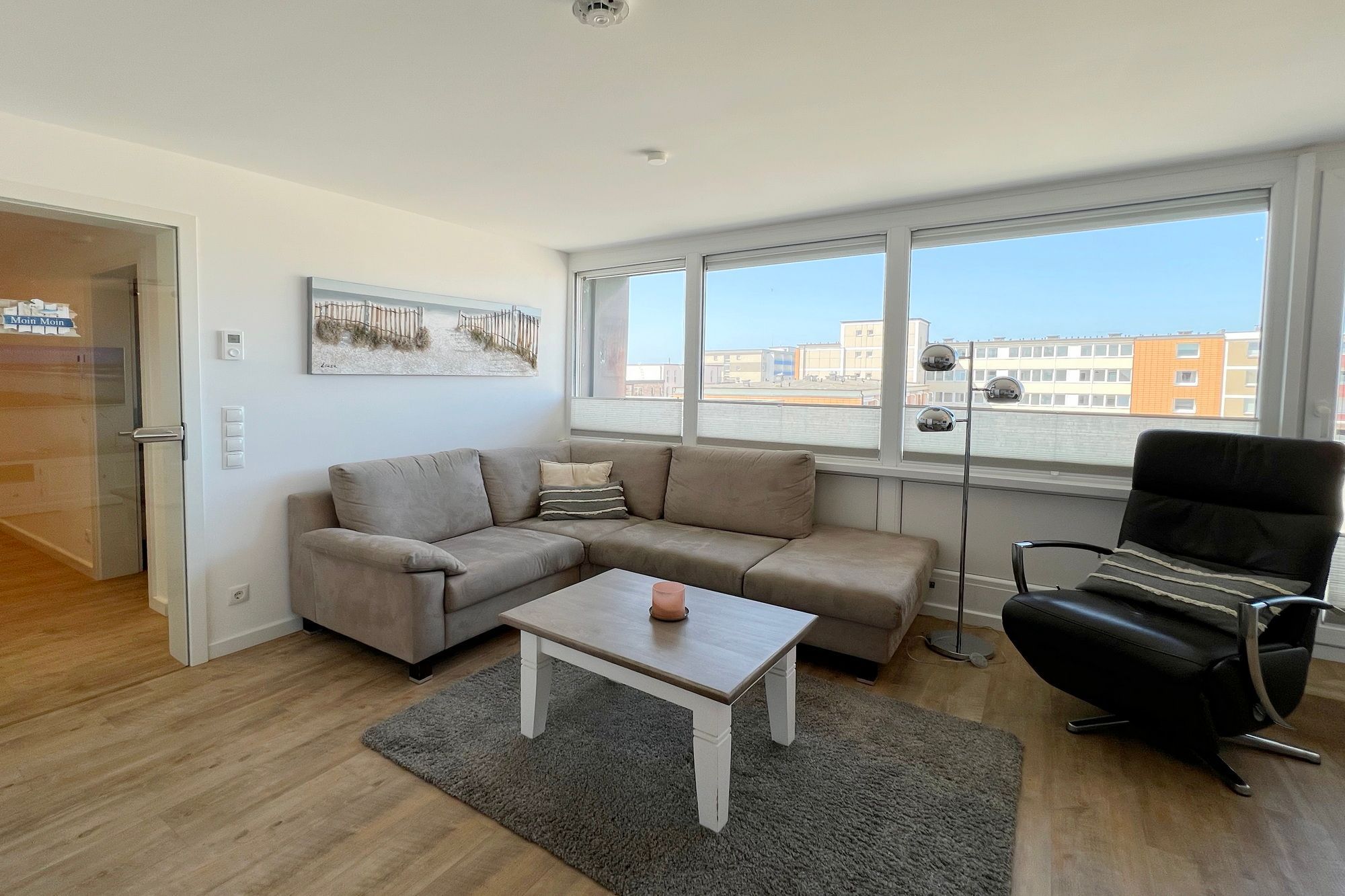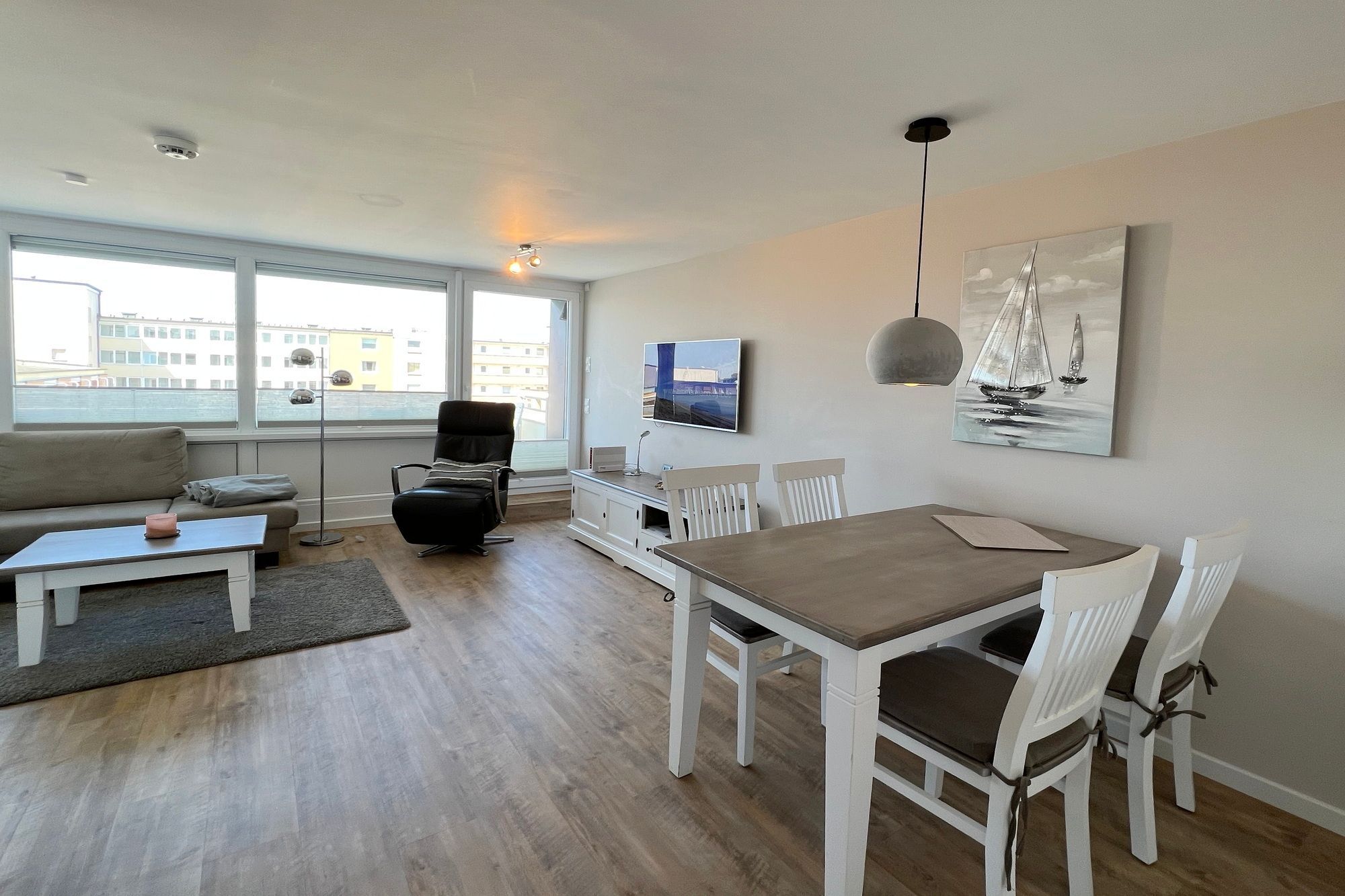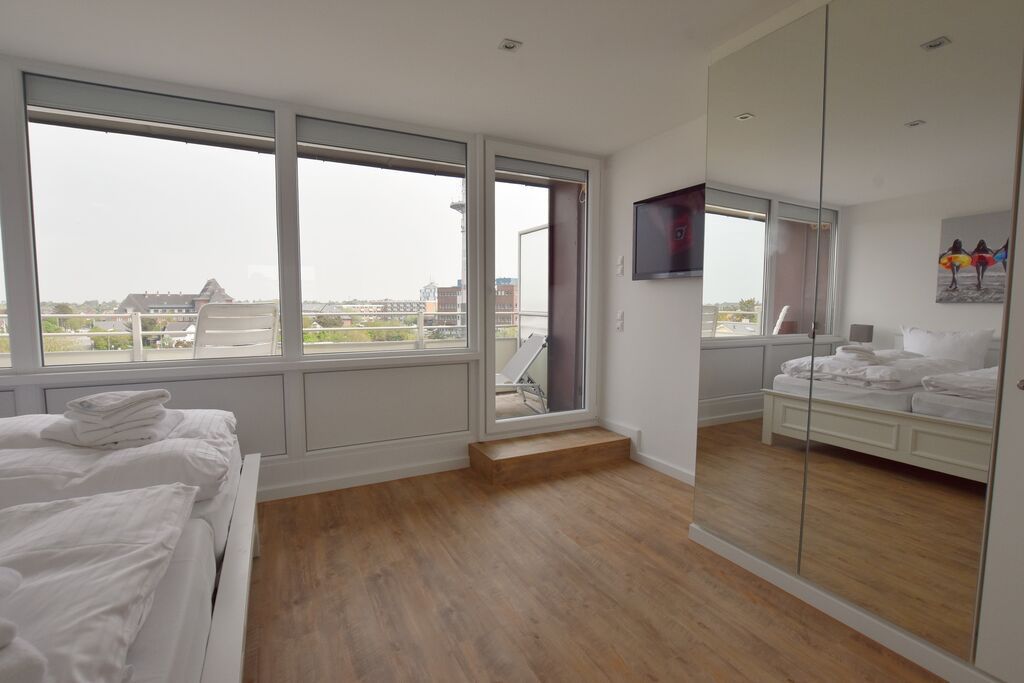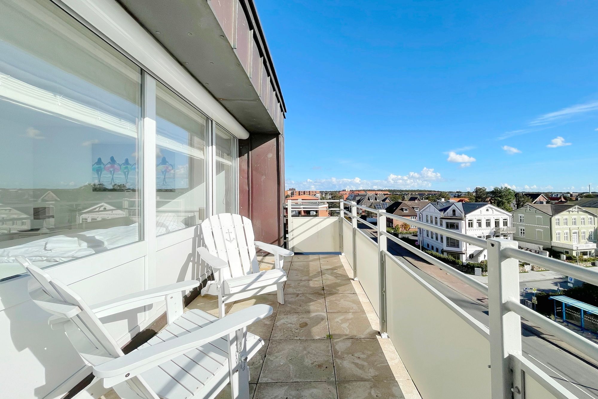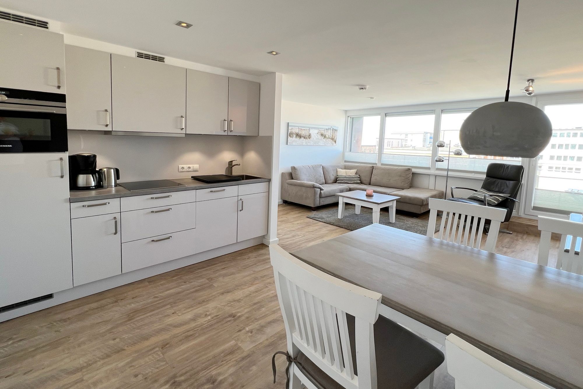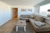 Penthouse-Ferienwohnung im Haus Germania. Modernes Wohnzimmer mit offener Küchezeile, Essecke, Couch zum Relaxen und West-Balkon mit kleinem Meerblick. Schlafzimmer mit Doppelbett und zweitem Balkon nach Osten. Zweites Schlafzimmer mit 2 Einzelbetten, Flur und Duschbad ( mit Oberlicht ) mit WC und Waschbecken. Alle Räume befinden sich auf einer Ebene. Es steht Ihnen ein Fahrstuhl und ein eigener PKW-Stellplatz ( Nr. 35 ) zur Verfügung.