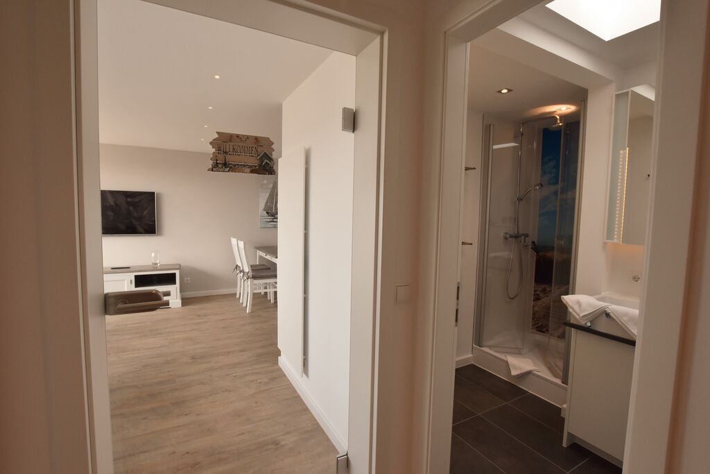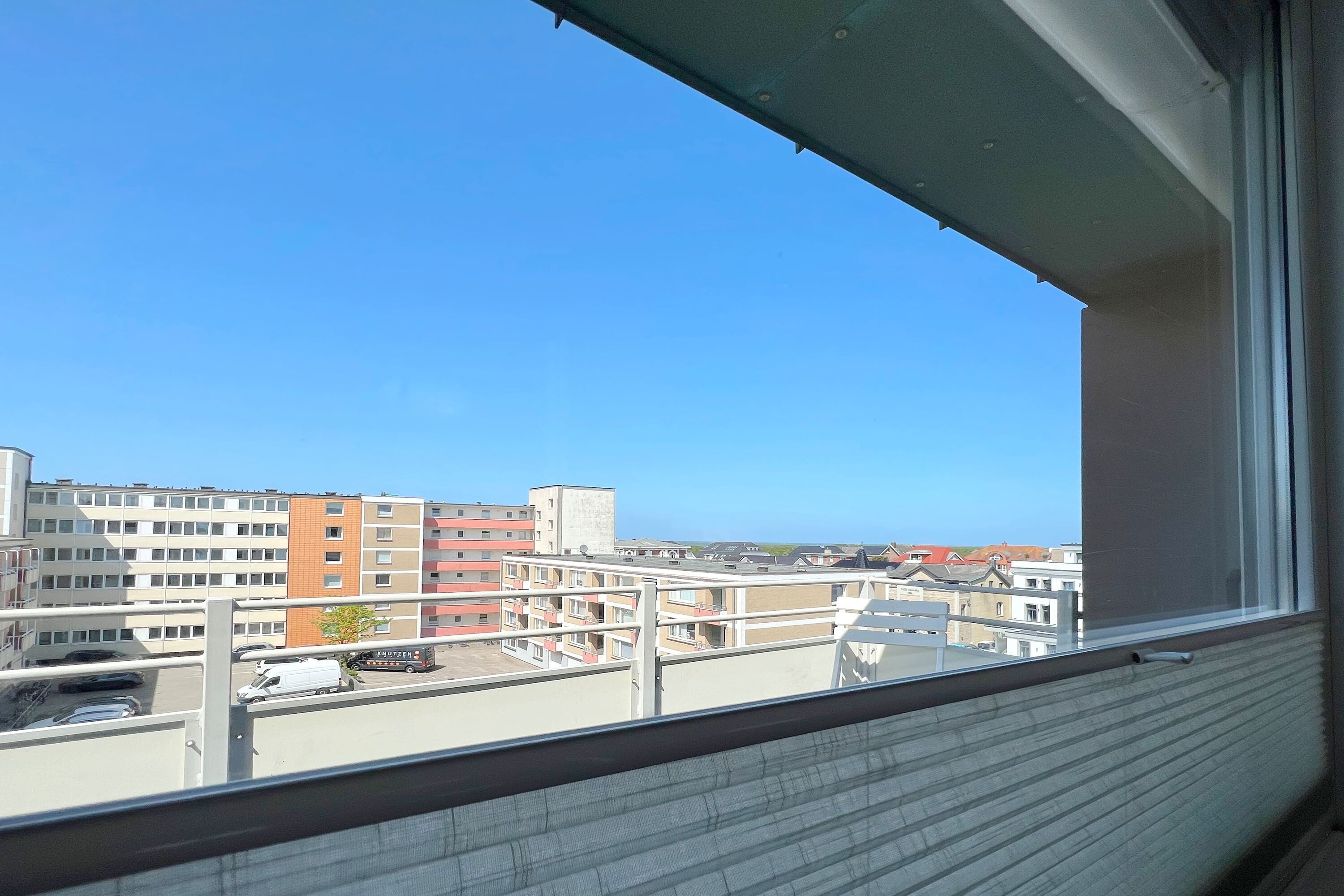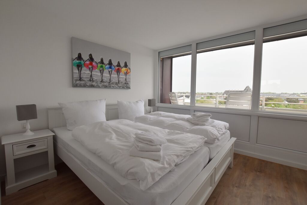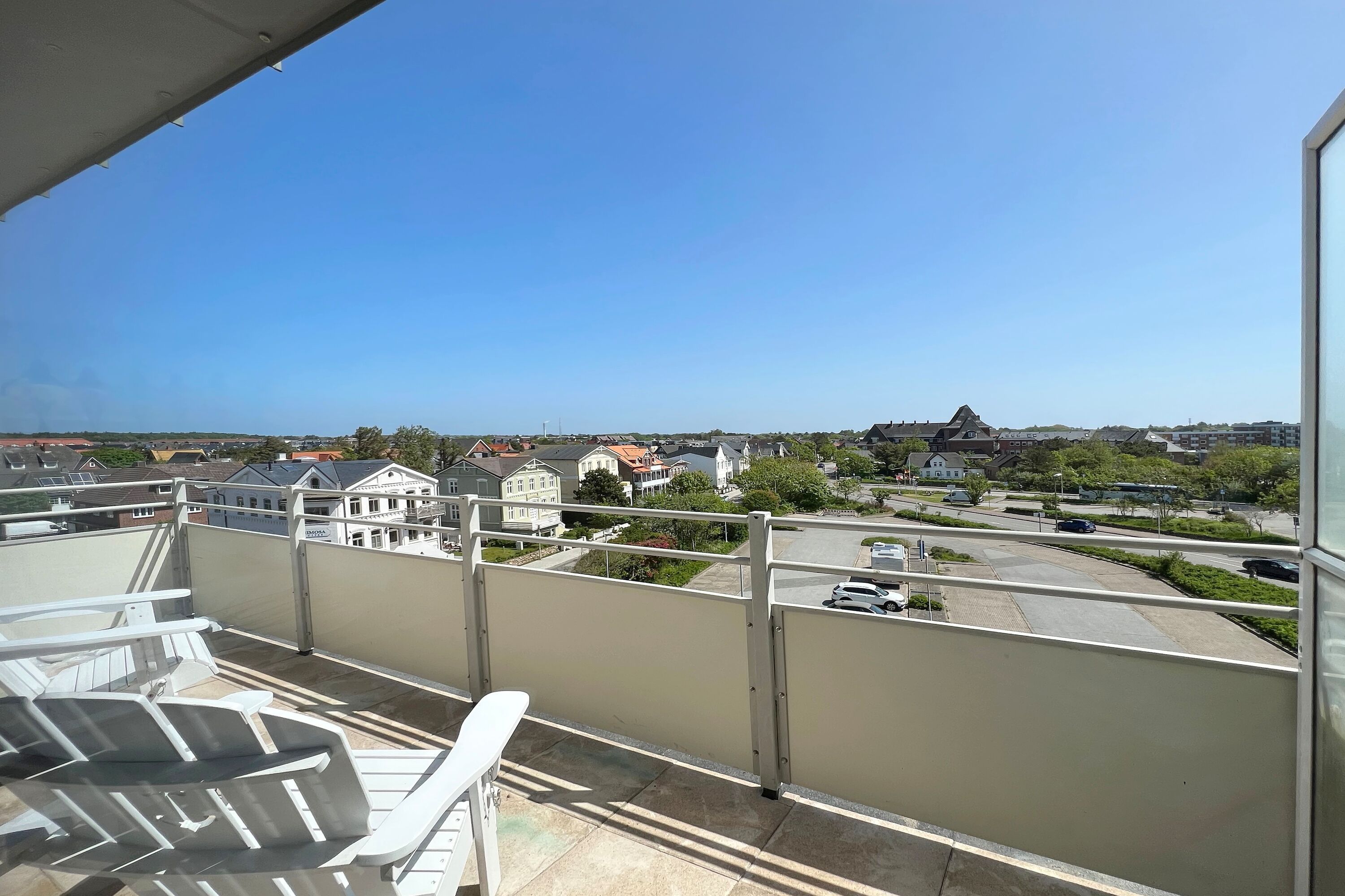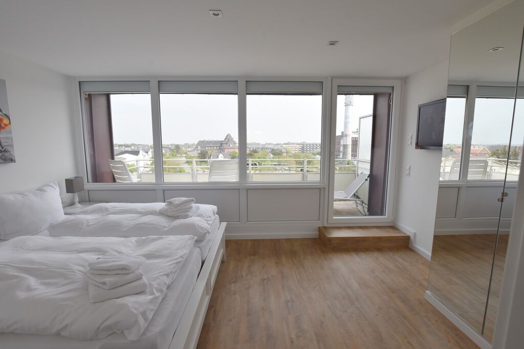 Penthouse-Ferienwohnung im Haus Germania. Modernes Wohnzimmer mit offener Küchezeile, Essecke, Couch zum Relaxen und West-Balkon mit kleinem Meerblick. Schlafzimmer mit Doppelbett und zweitem Balkon nach Osten. Zweites Schlafzimmer mit 2 Einzelbetten, Flur und Duschbad ( mit Oberlicht ) mit WC und Waschbecken. Alle Räume befinden sich auf einer Ebene. Es steht Ihnen ein Fahrstuhl und ein eigener PKW-Stellplatz ( Nr. 35 ) zur Verfügung.
