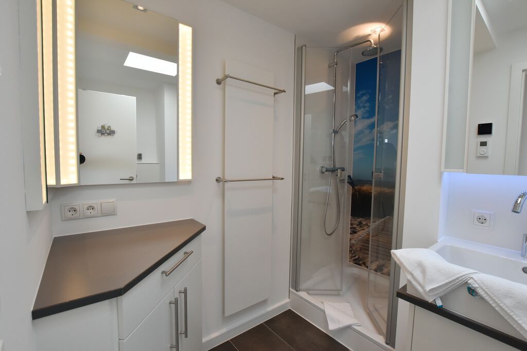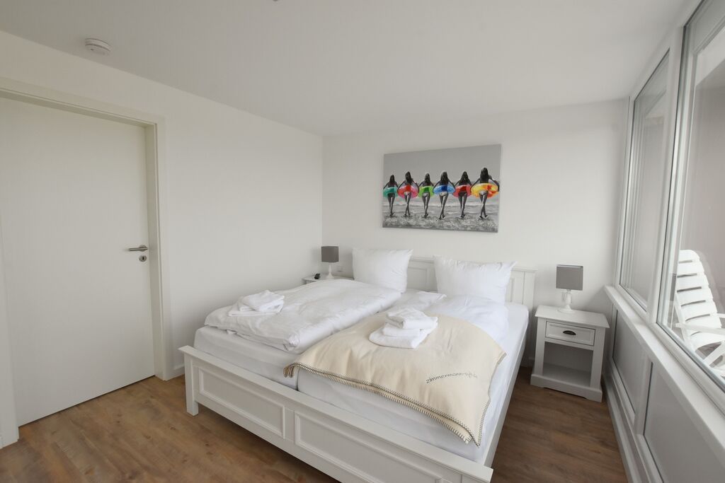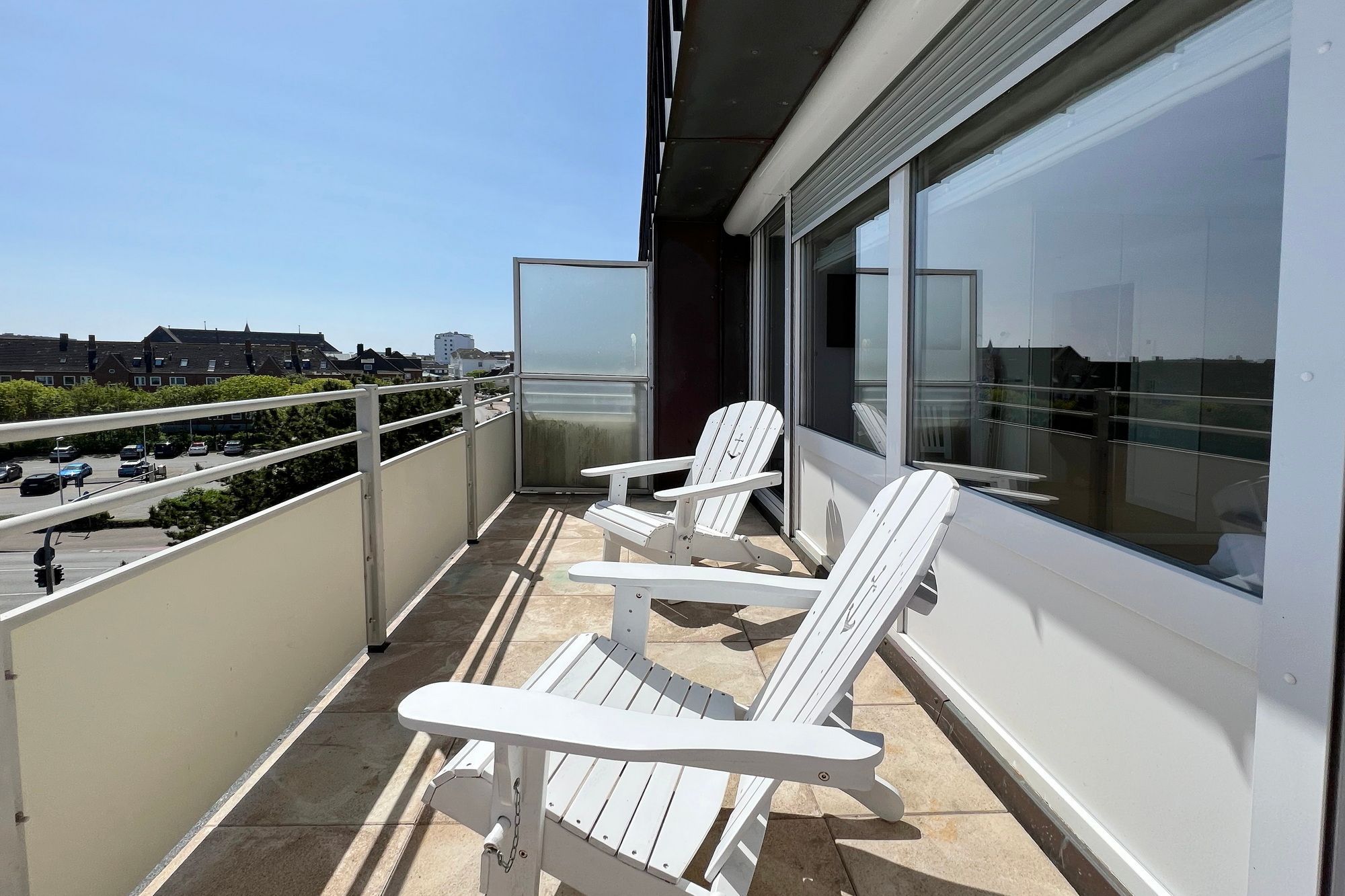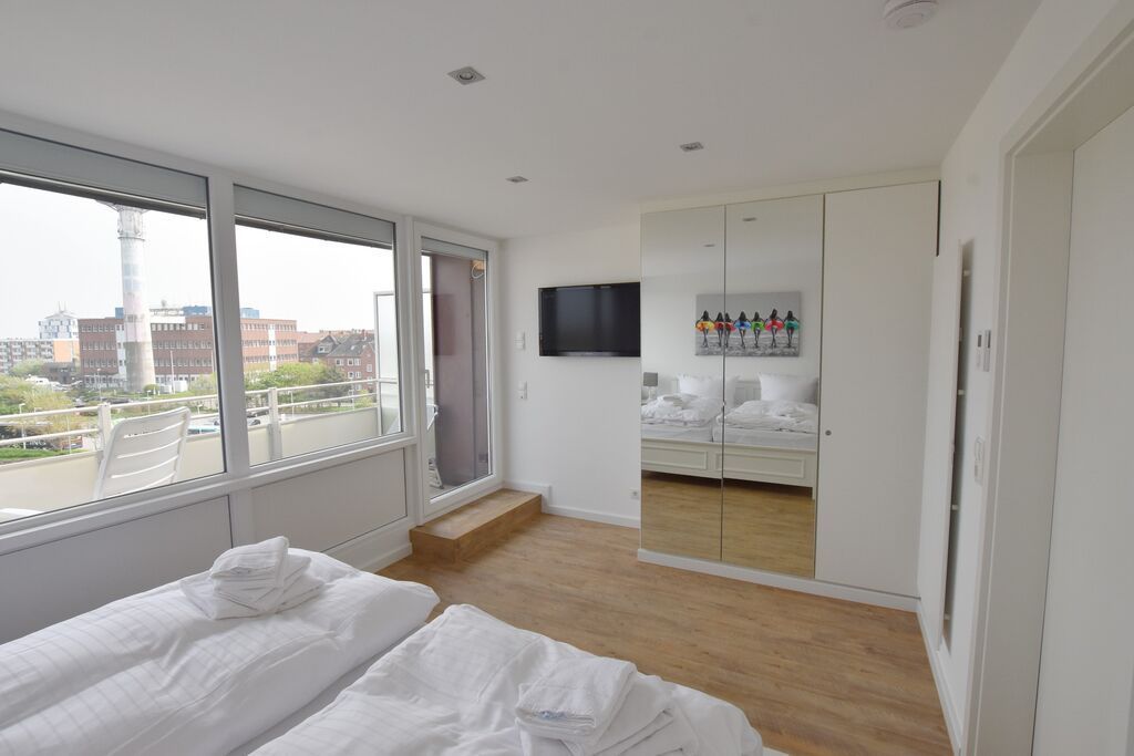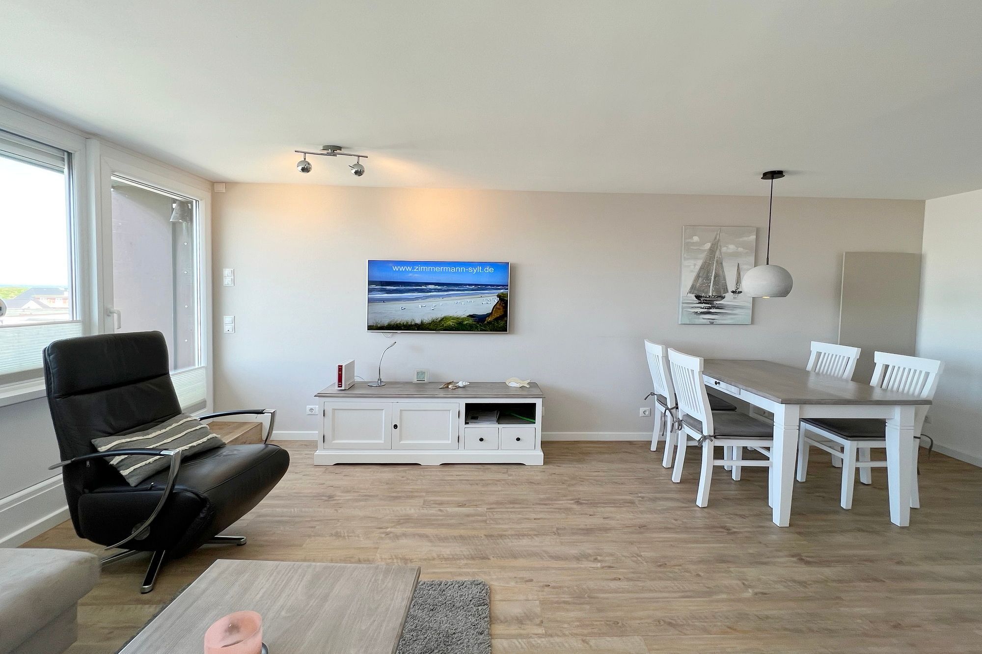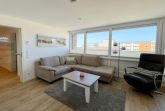 Penthouse-Ferienwohnung im Haus Germania. Modernes Wohnzimmer mit offener Küchezeile, Essecke, Couch zum Relaxen und West-Balkon mit kleinem Meerblick. Schlafzimmer mit Doppelbett und zweitem Balkon nach Osten. Zweites Schlafzimmer mit 2 Einzelbetten, Flur und Duschbad ( mit Oberlicht ) mit WC und Waschbecken. Alle Räume befinden sich auf einer Ebene. Es steht Ihnen ein Fahrstuhl und ein eigener PKW-Stellplatz ( Nr. 35 ) zur Verfügung.