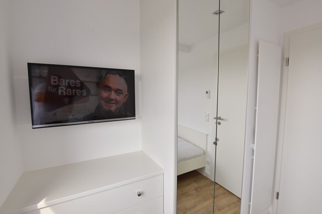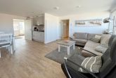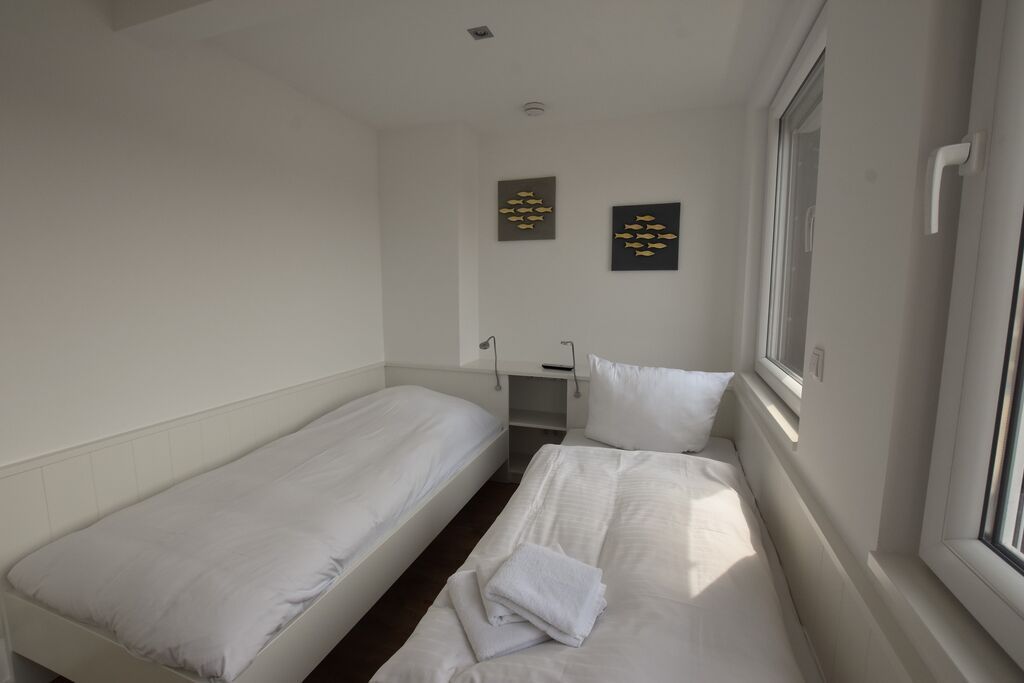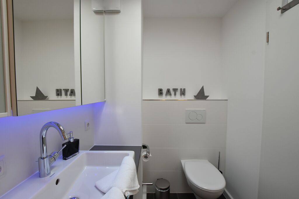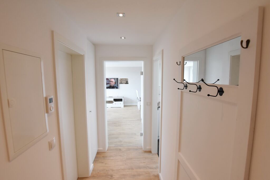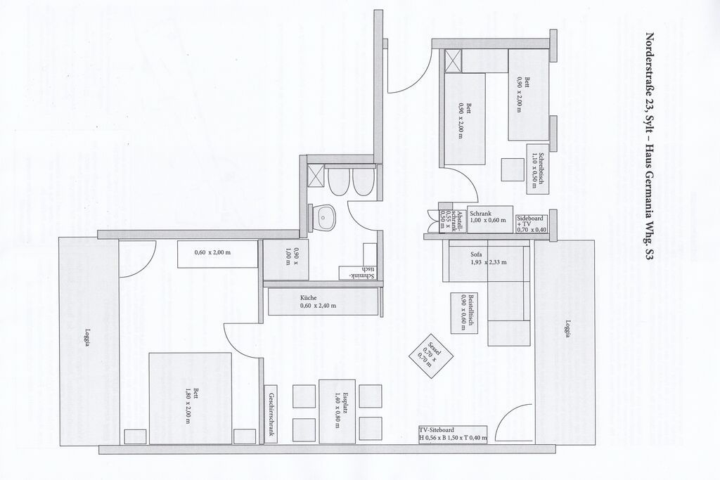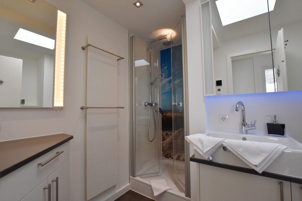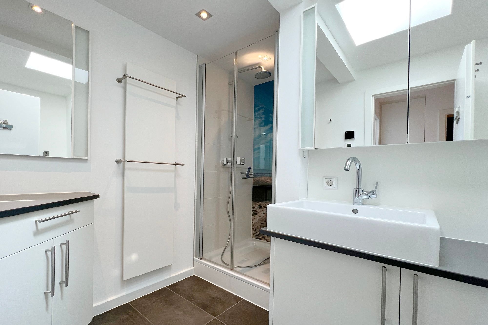 Penthouse-Ferienwohnung im Haus Germania. Modernes Wohnzimmer mit offener Küchezeile, Essecke, Couch zum Relaxen und West-Balkon mit kleinem Meerblick. Schlafzimmer mit Doppelbett und zweitem Balkon nach Osten. Zweites Schlafzimmer mit 2 Einzelbetten, Flur und Duschbad ( mit Oberlicht ) mit WC und Waschbecken. Alle Räume befinden sich auf einer Ebene. Es steht Ihnen ein Fahrstuhl und ein eigener PKW-Stellplatz ( Nr. 35 ) zur Verfügung.