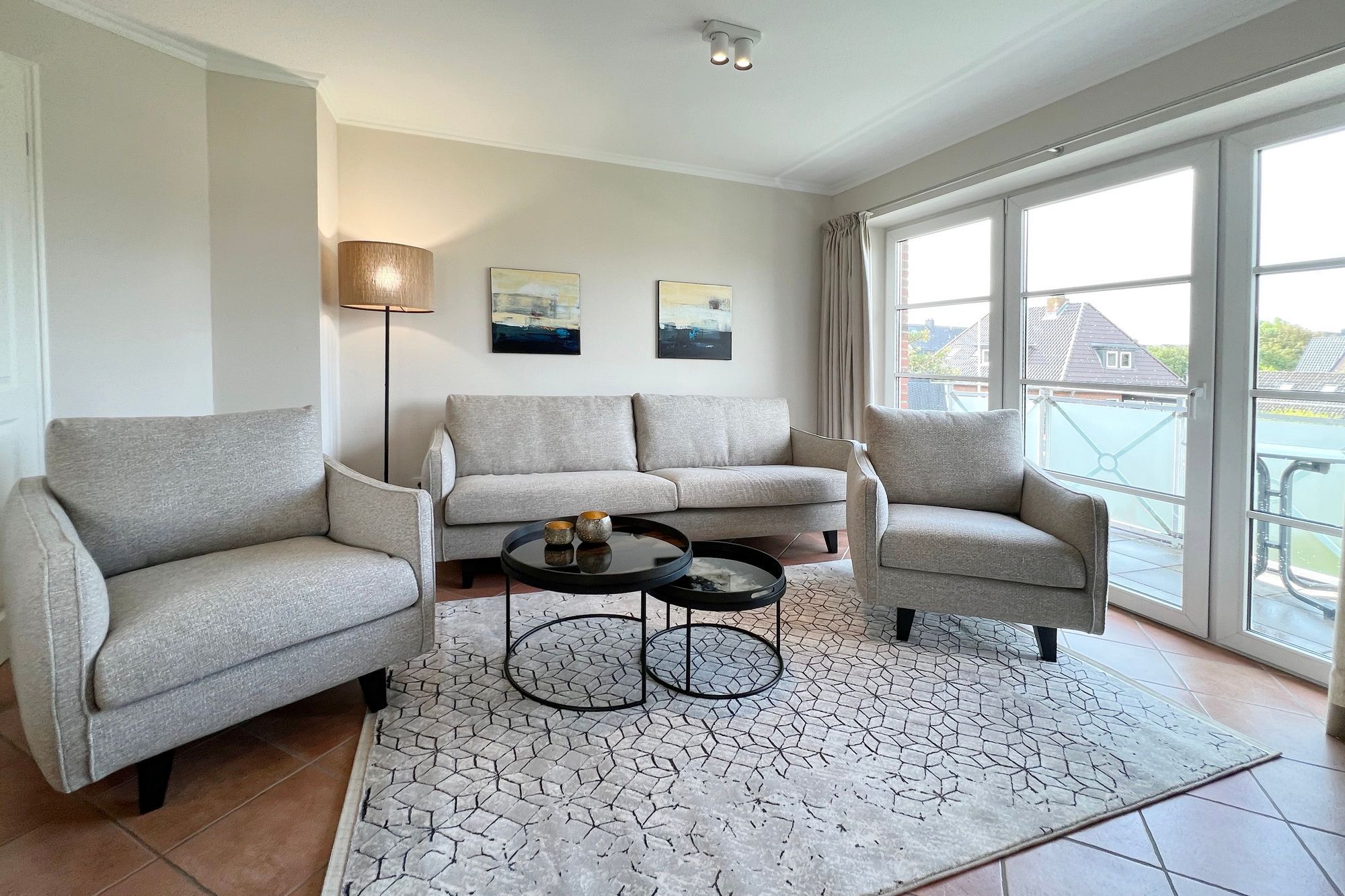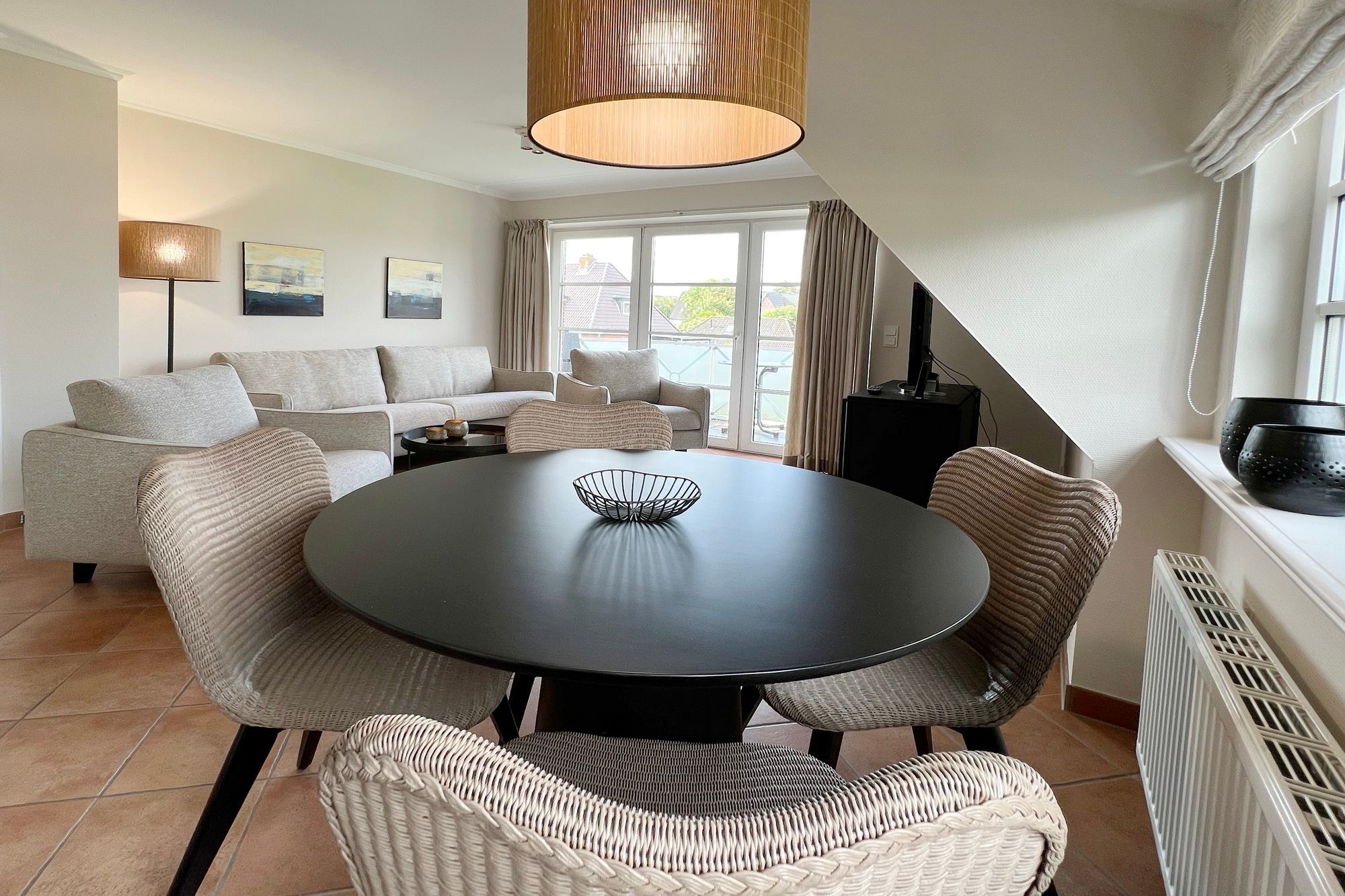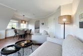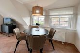 2-Zimmer-Ferienwohnung (OG), Wohnzimmer mit Balkon, Sitzgruppe und Eßecke, Smart TV, separate Küche mit Cerankochfeld, Spülmaschine, Backofen und Mikrowelle, Badezimmer mit Wanne und Dusche, WC und Waschbecken, Schlafzimmer mit Doppelbett