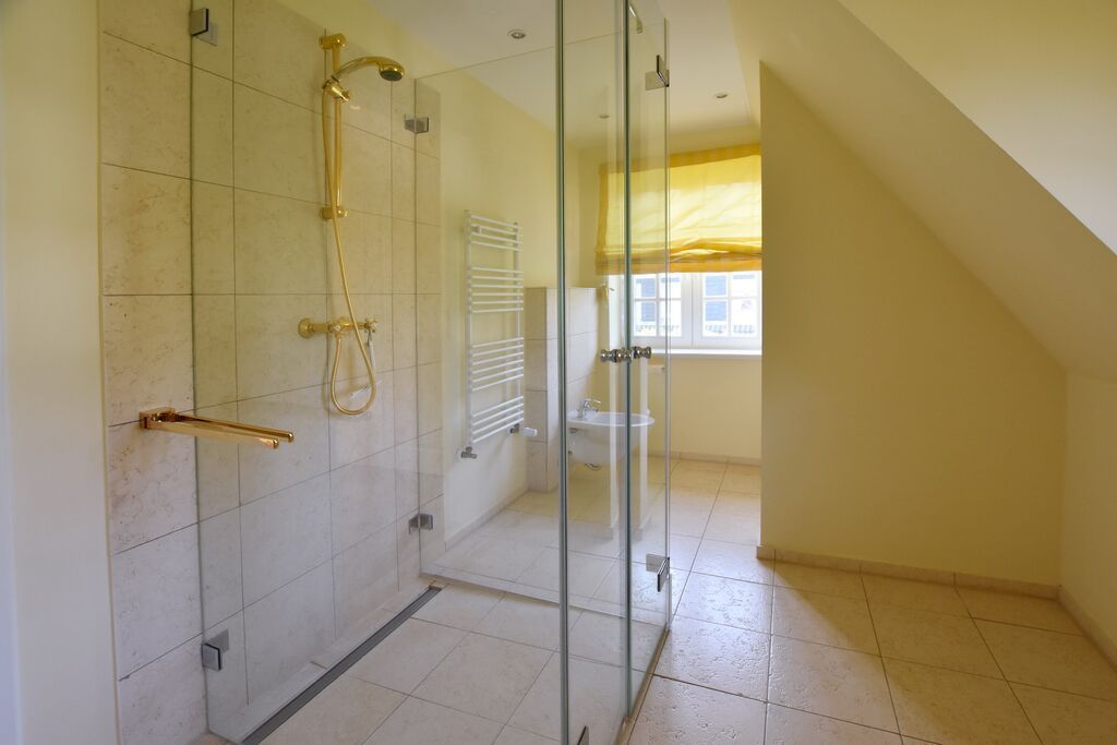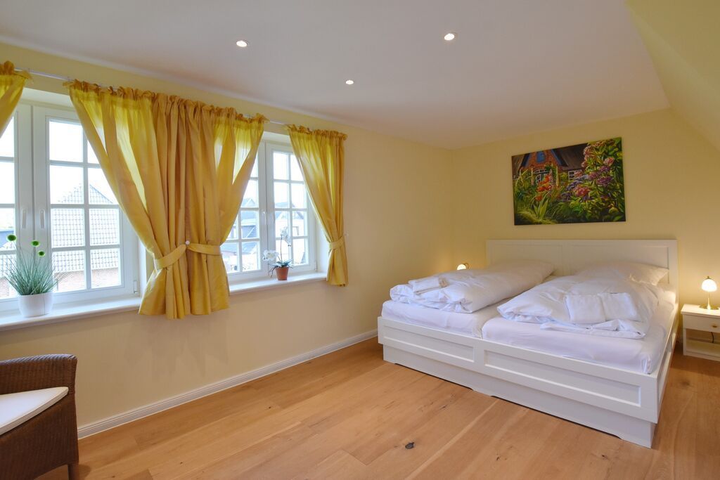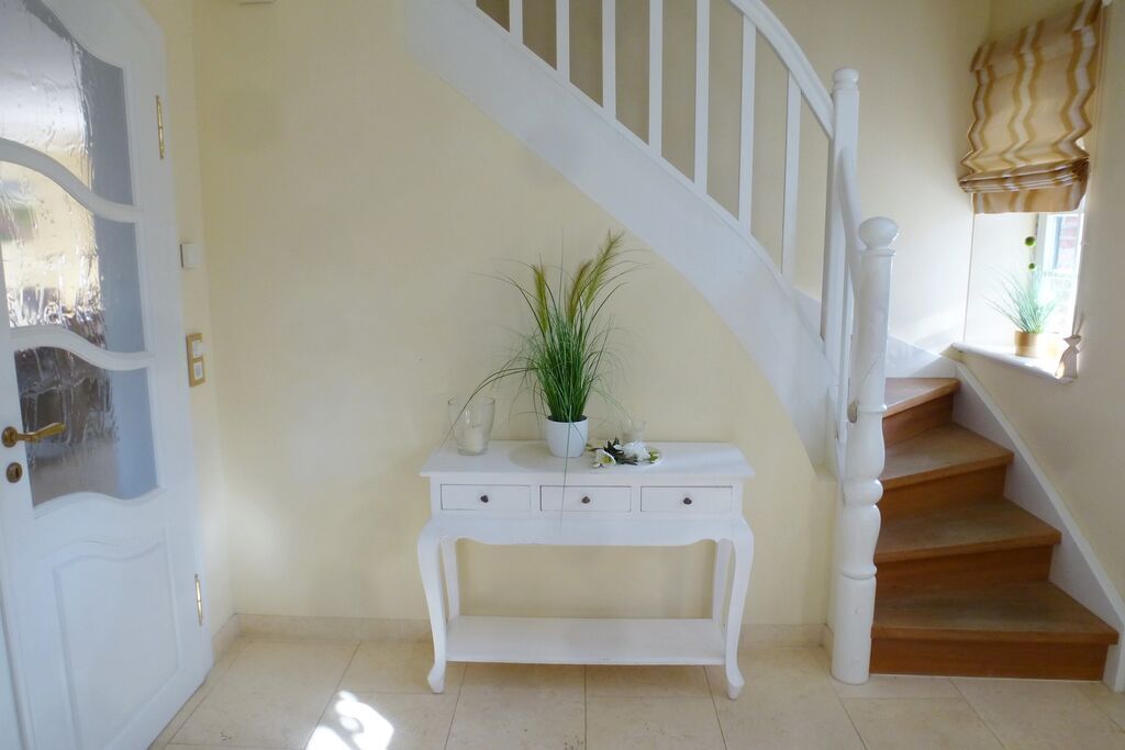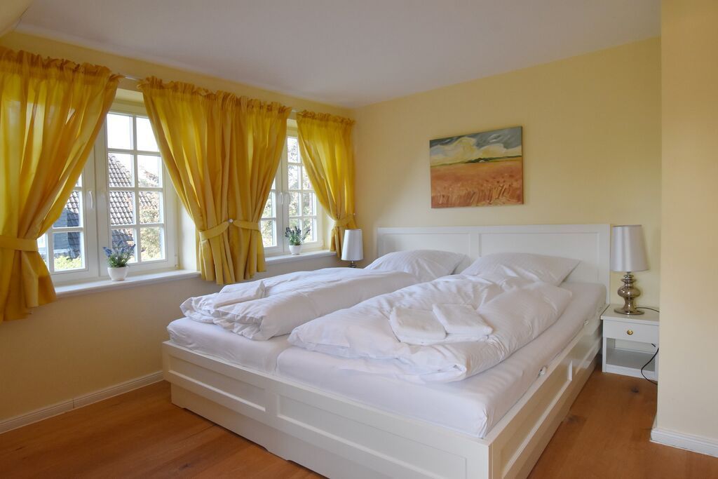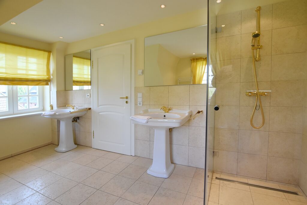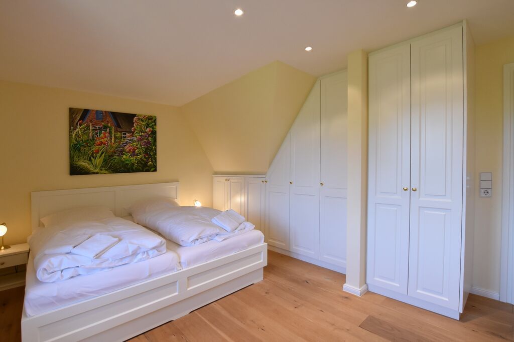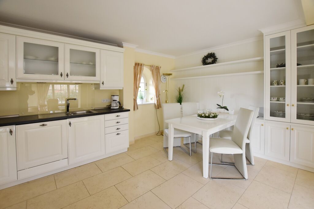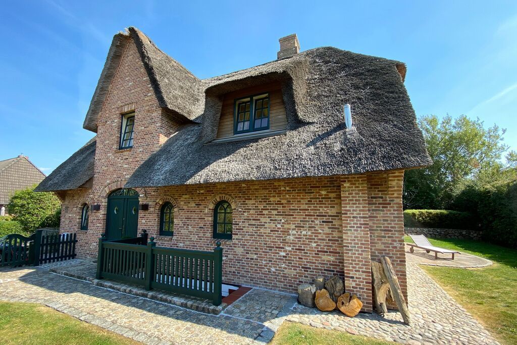 Exklusive Haushälfte unter Reet in ruhiger Ortslage auf eingewachsenem Grundstück EG: grosser heller Wohn-Essbereich mit offener Küche, Flur, Gäste-WC und Zugang zum Garten mit Terrasse in süd-östlicher Ausrichtung OG: 2 Schlafzimmer mit Doppelbett und jeweils mit Bad en suite.