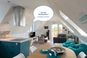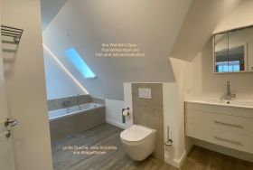 Ankommen und Wohlfühlen - die ca. 140qm große, sonnige 4-Zimmer-Nichtraucherwohnung im 1. OG besticht nicht nur durch die tolle Raumaufteilung sondern auch mit dem Familienbett im größten der 3 Schlafräume - mit 2,80 m Breite hat es für entspannten Schlaf alles einzelne Lattenroste und Matratzen. Diese Komfort-Wohnung bietet - nicht zuletzt durch die 2 Bäder - die perfekte Grundlage für Ihren Wohlfühl-Urlaub mit skandinavischem Flair mit bis zu 8 Personen. Neben dem Doppelzimmer mit Leseecke und kleinem Arbeitsplatz gibt es noch ein 2-Bettzimmer; die hier befindlichen Einzelbetten lassen sich auch prima als Doppelbett zusammenschieben.