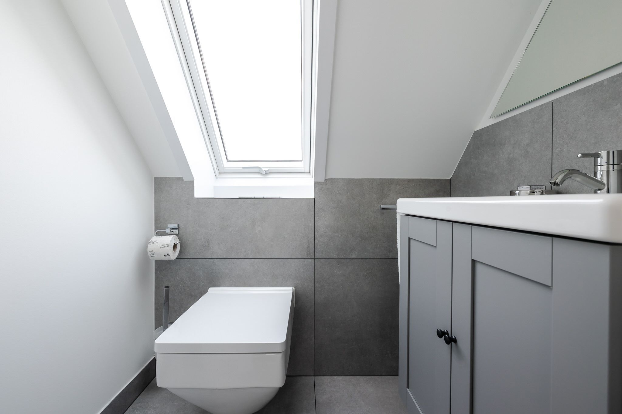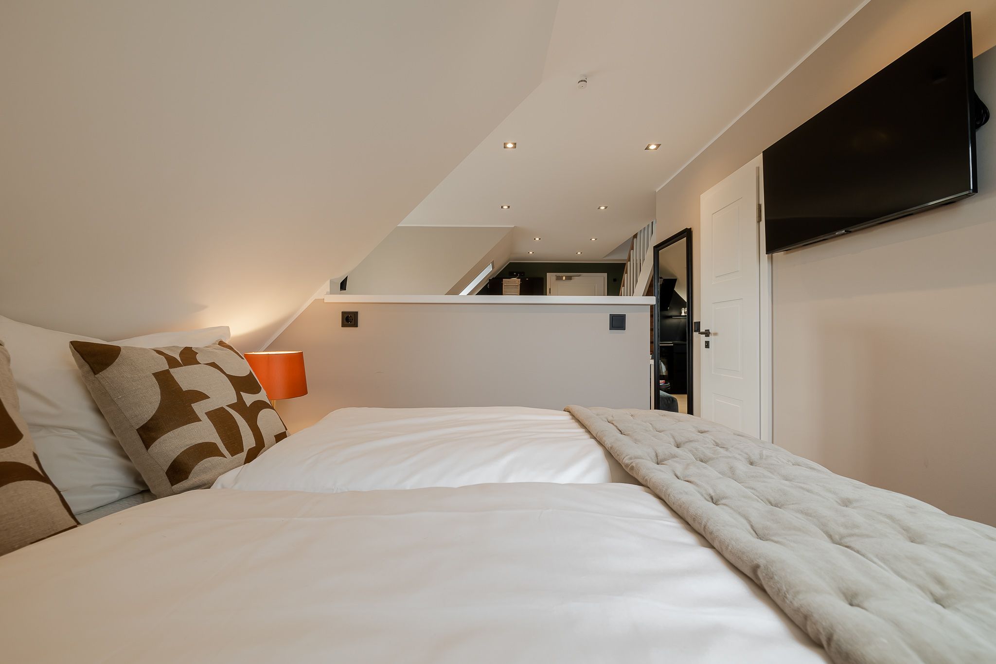 Auf der oberen Etage der Maisonette Wohnung befindet sich ein zusätzlicher Wohn- und Arbeitsbereich mit Schreibtisch und Sofa sowie ein weiteres WC-Badezimmer.
