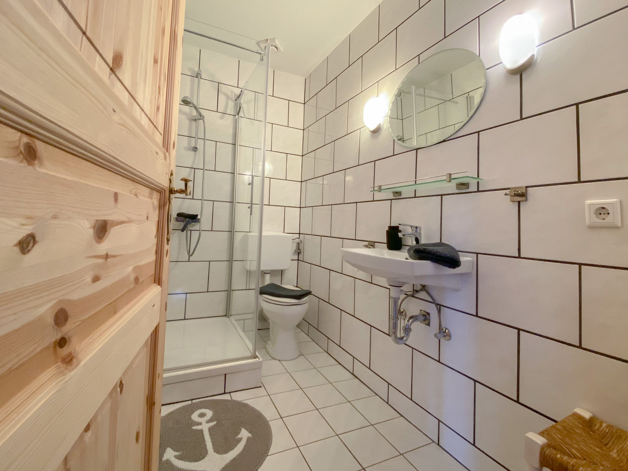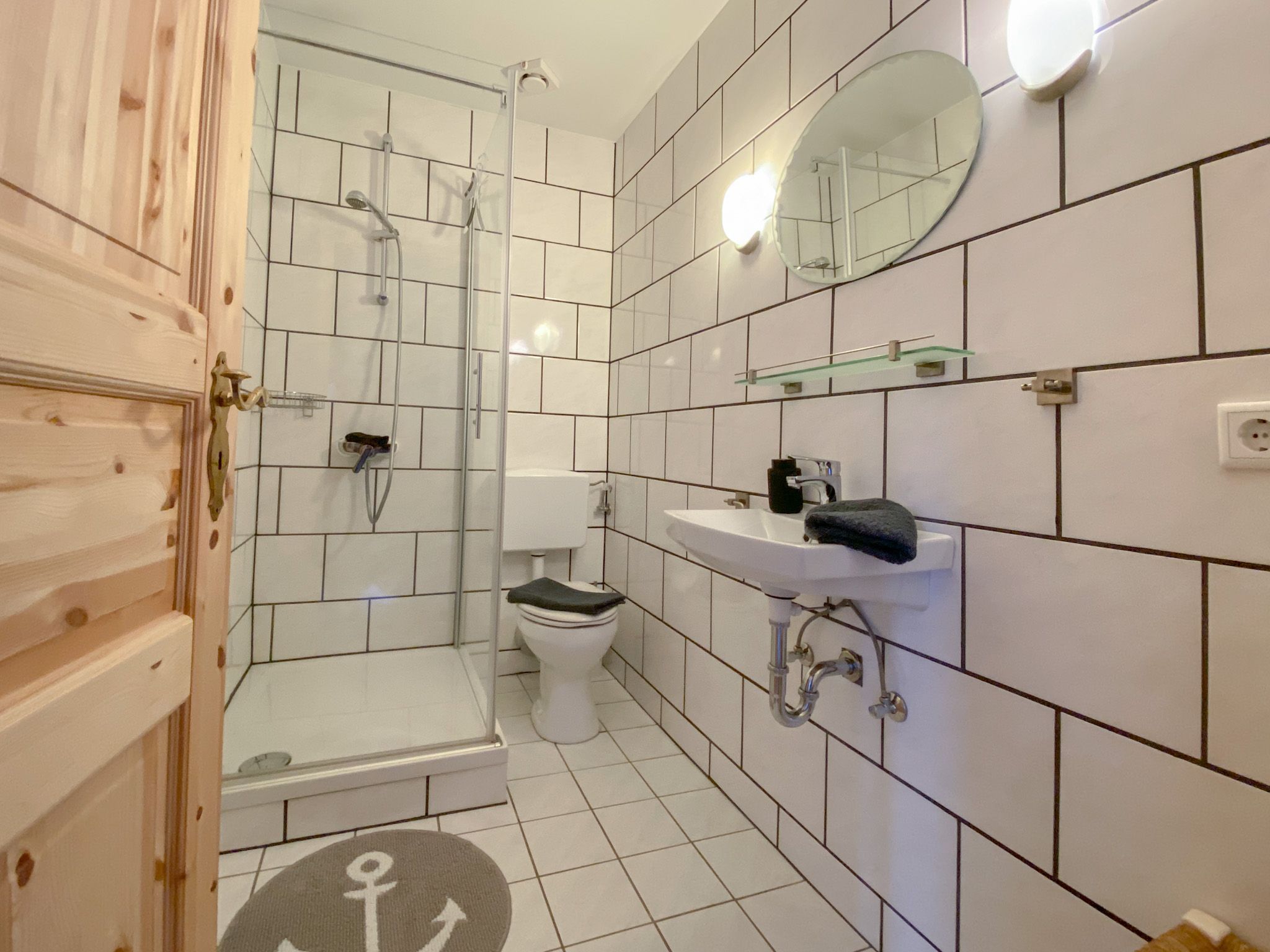 Das Badezimmer hält neben einer Dusche mit Echtglasfront, WC und Waschbecken auch einen