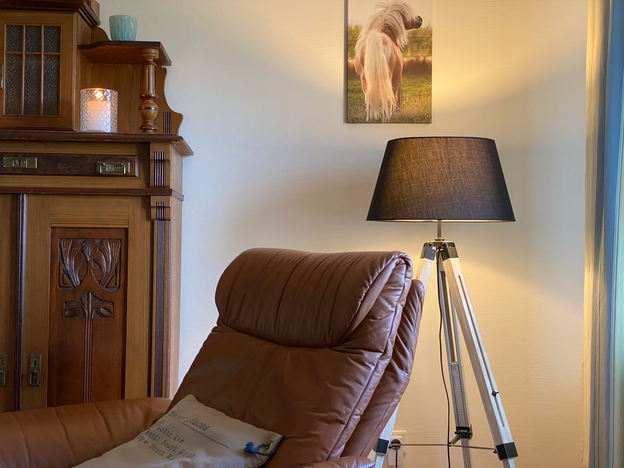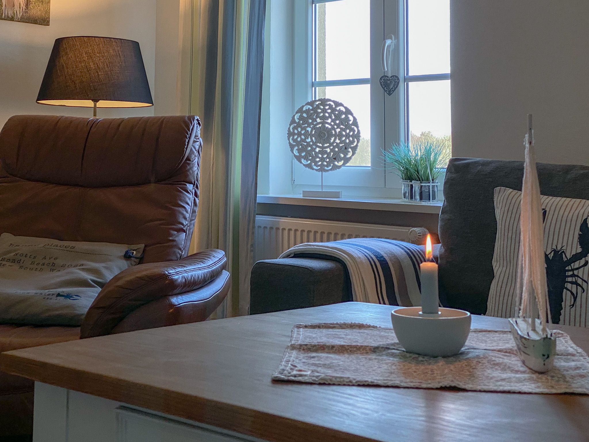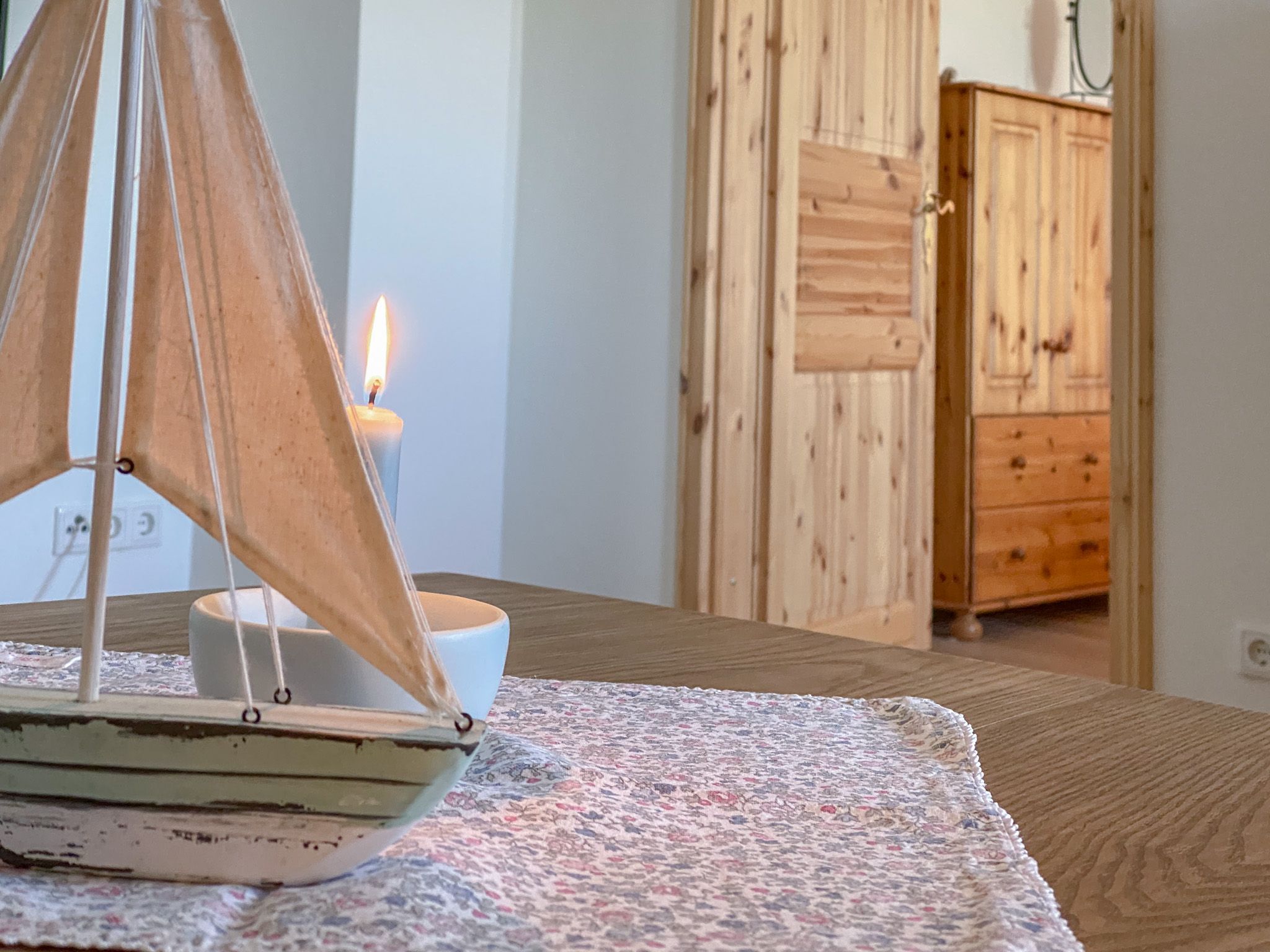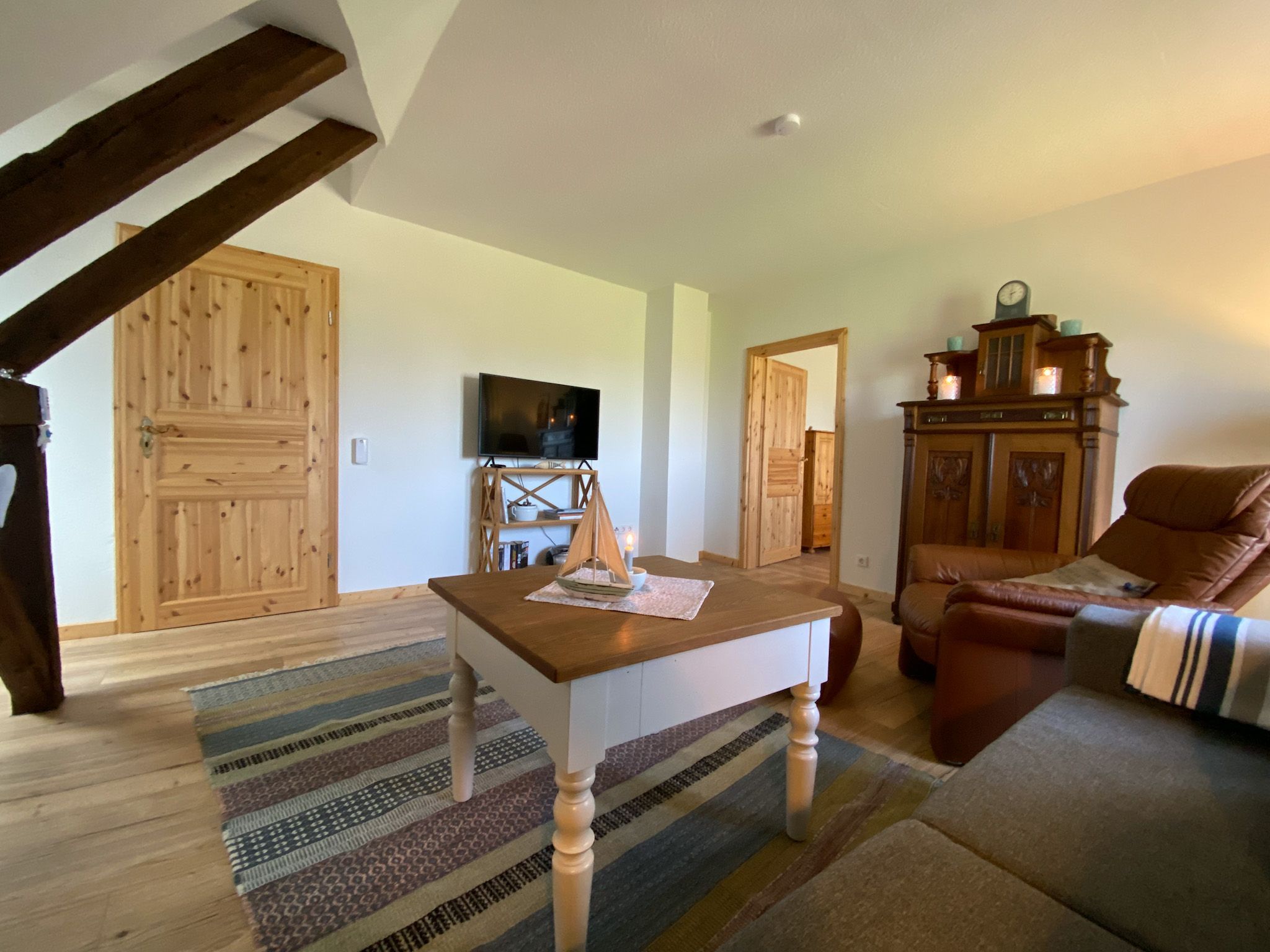 Ihr betretet die Wohnung hin zum Wohnzimmer im gemütlichen Landhausstil, mit einer durch