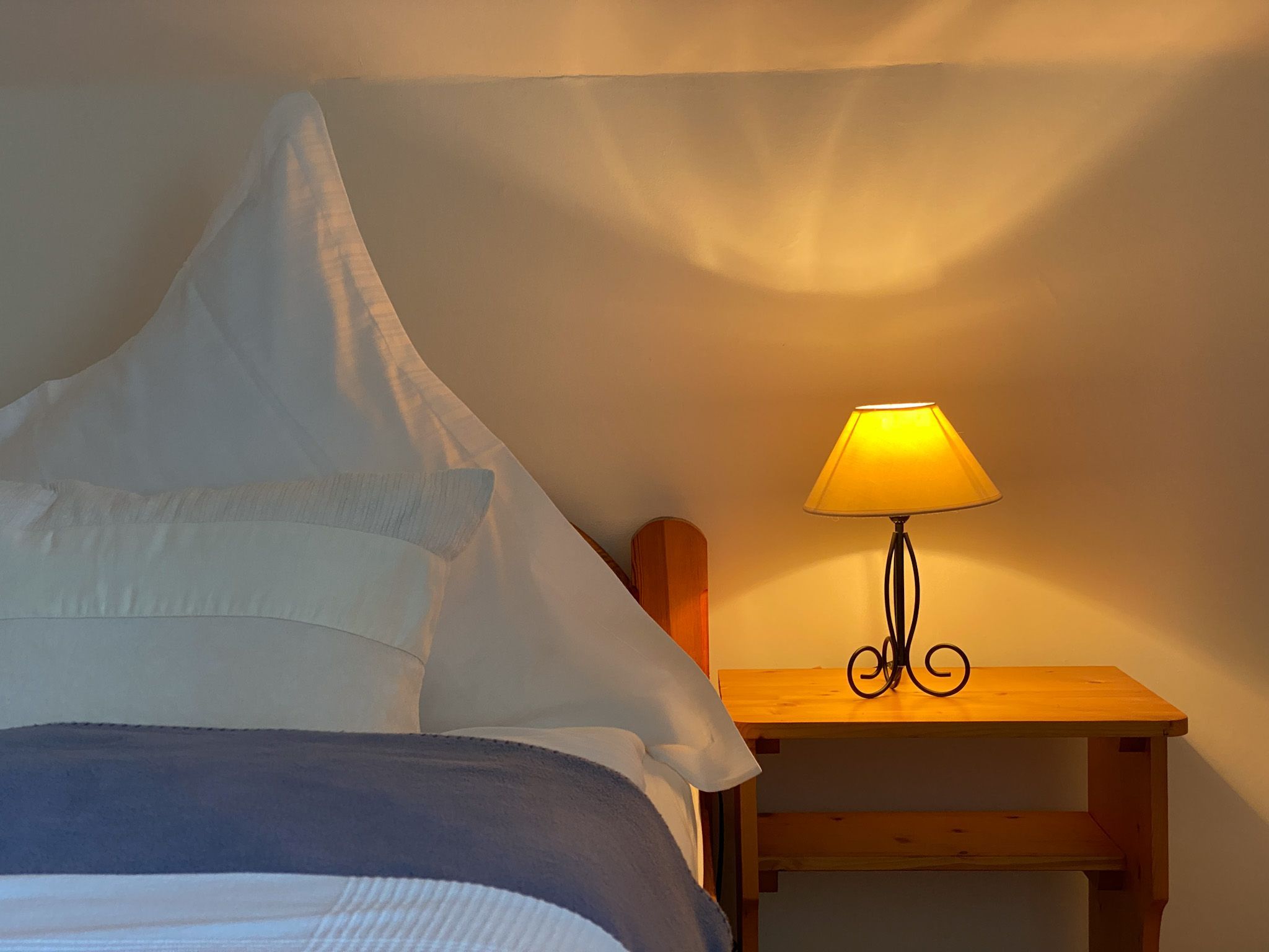 Das Schlafzimmer besticht mit frisch bezogenem Bett(falls gebucht), klarer und ordentlicher Raumstruktur und