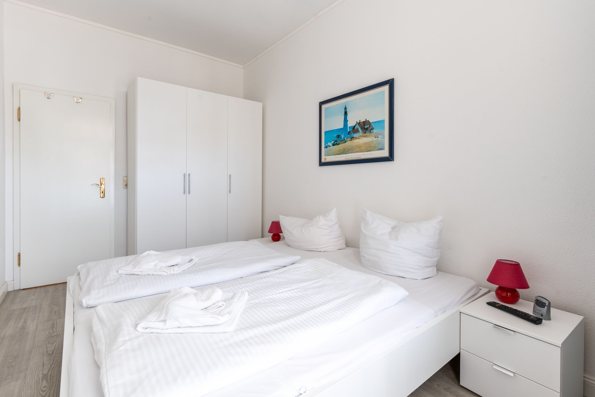 Das Schlafzimmer bietet ein 1,80 m breites gemütliches Doppelbett, Kleiderschrank, TV und Zugang zu einem weiteren kleinen Balkon.