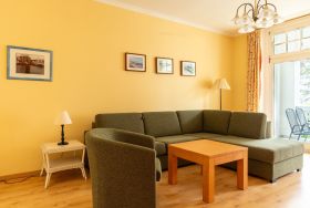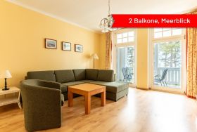 Vom Wohnzimmer aus erreichen Sie die beiden möblierten Balkone mit traumhaften Blick auf die Ostsee. Die Couch im Wohnbereich lässt sich mit wenigen Handgriffen zu einem Schlafplatz für 2 Personen ausklappen. Auf der Couch können Sie entspannt eine Urlaubstag vor dem Flat TV ausklingen lassen.