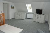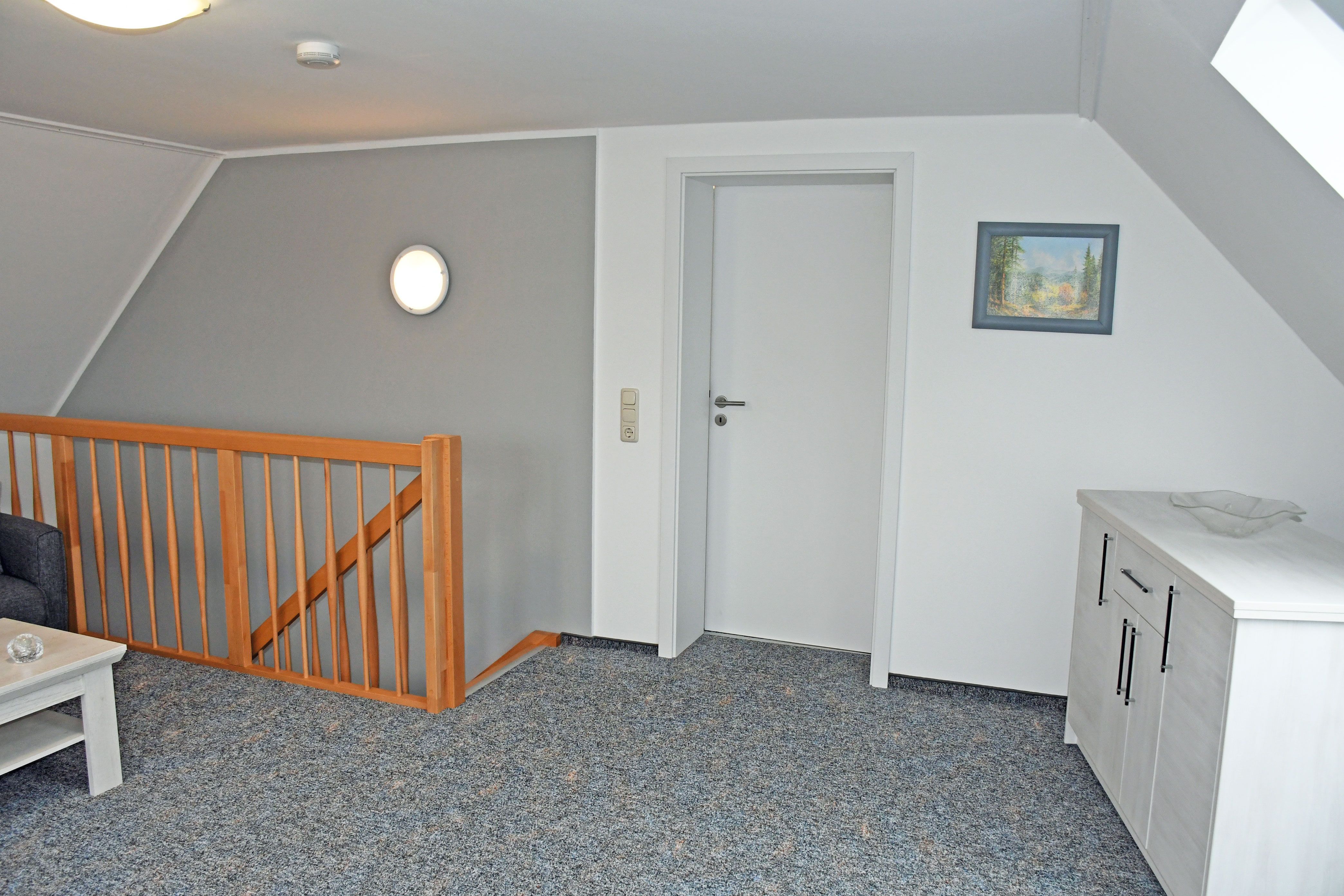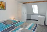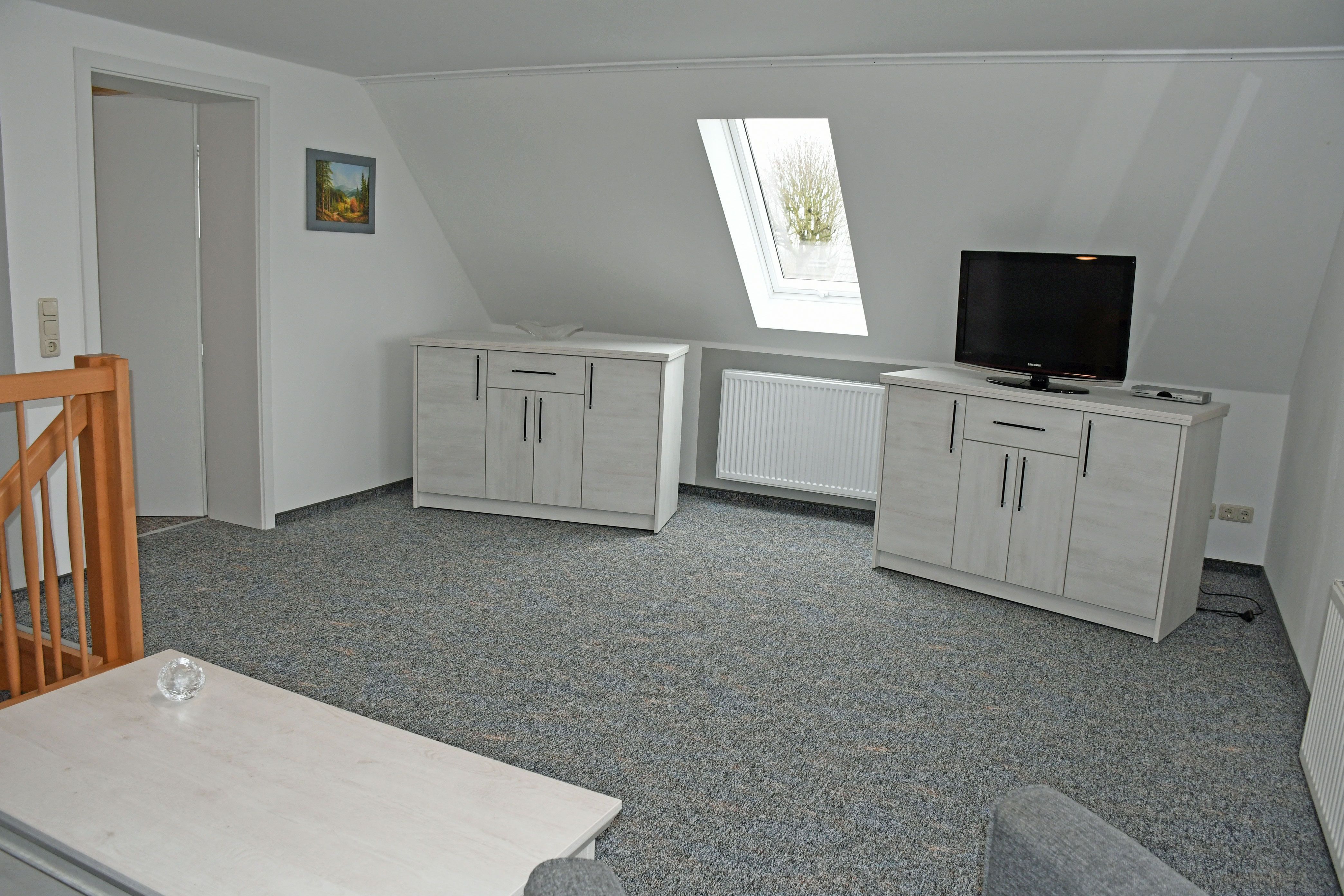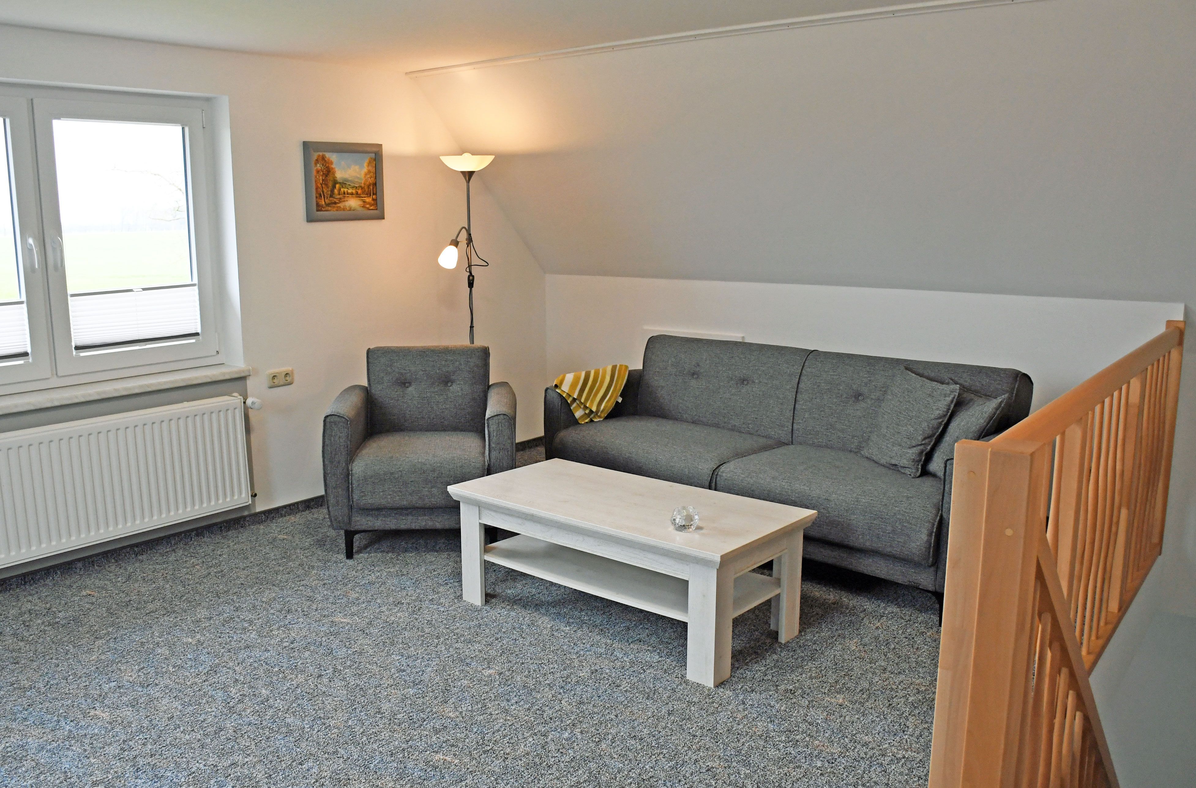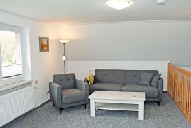 In dem im OG liegende großzügigen Wohnraum befinden sich eine Sitzcouch mit Tisch und Sessel, Leselampe und Flachbild-TV. Das im Obergeschoss befindliche Schlafzimmer ist mit einem bequemen Doppelbett mit Nachttischen und Leselampen sowie ein Kleiderschrank ausgestattet.
