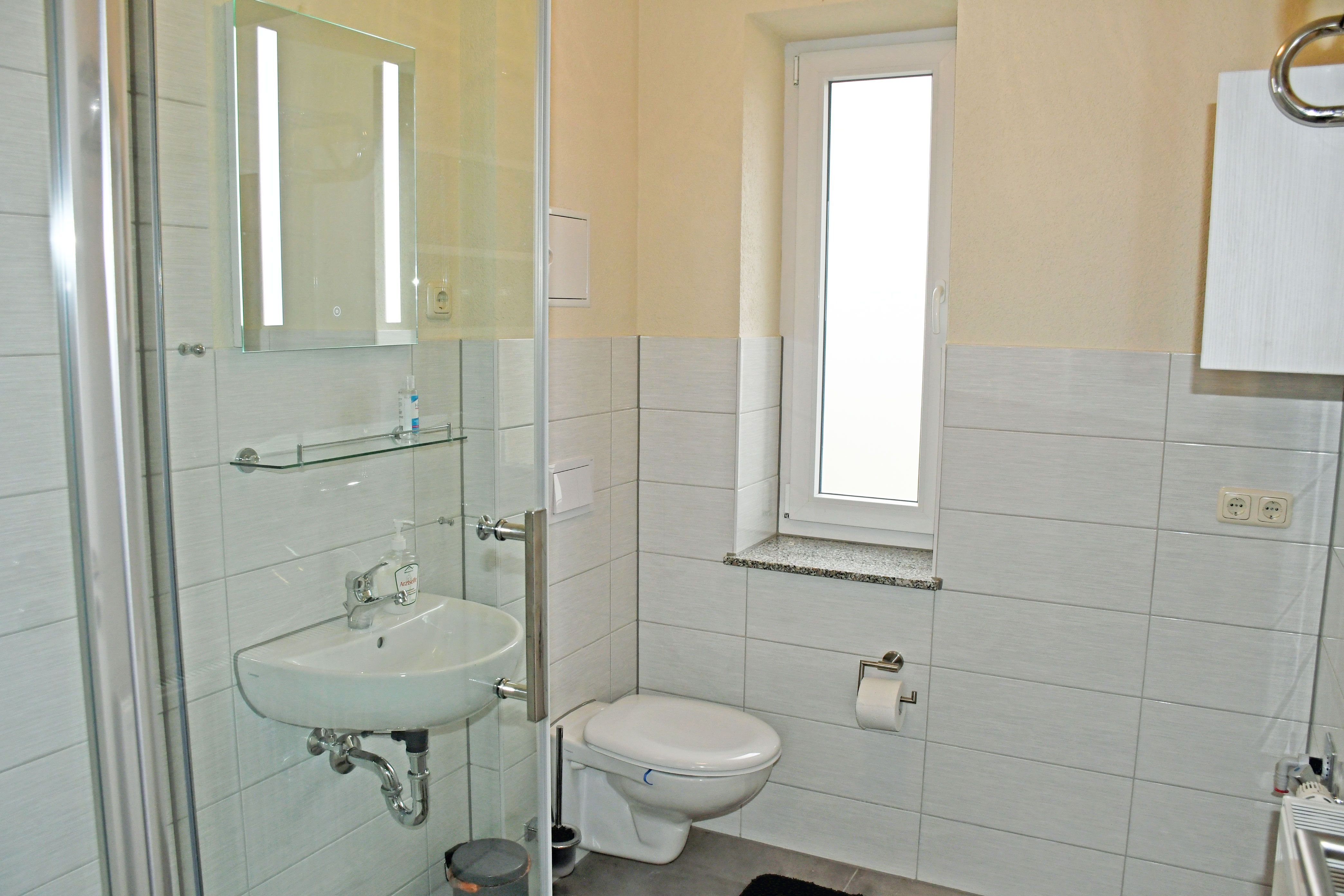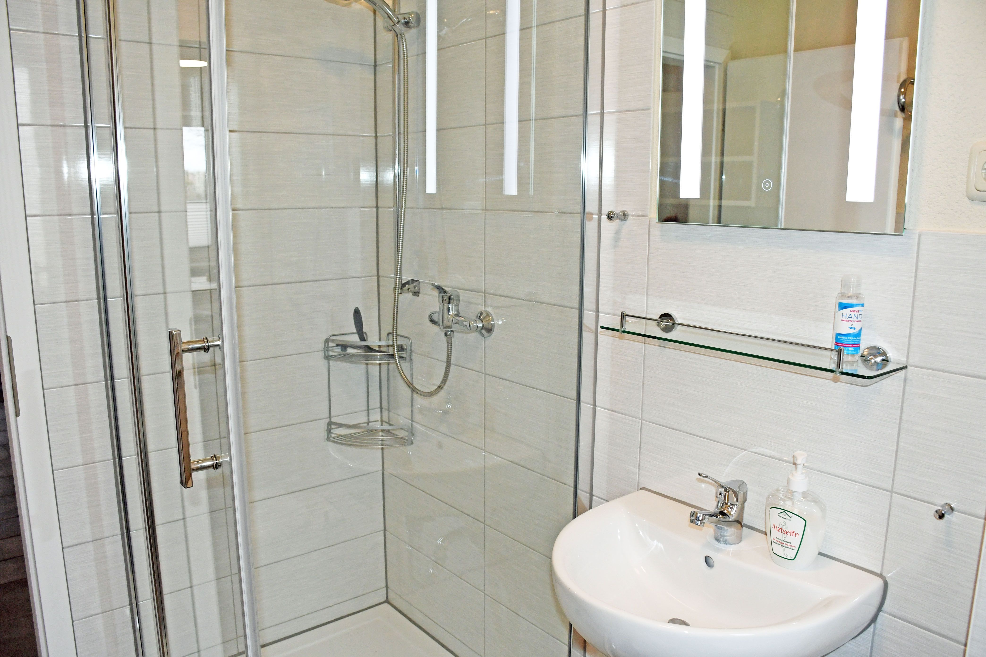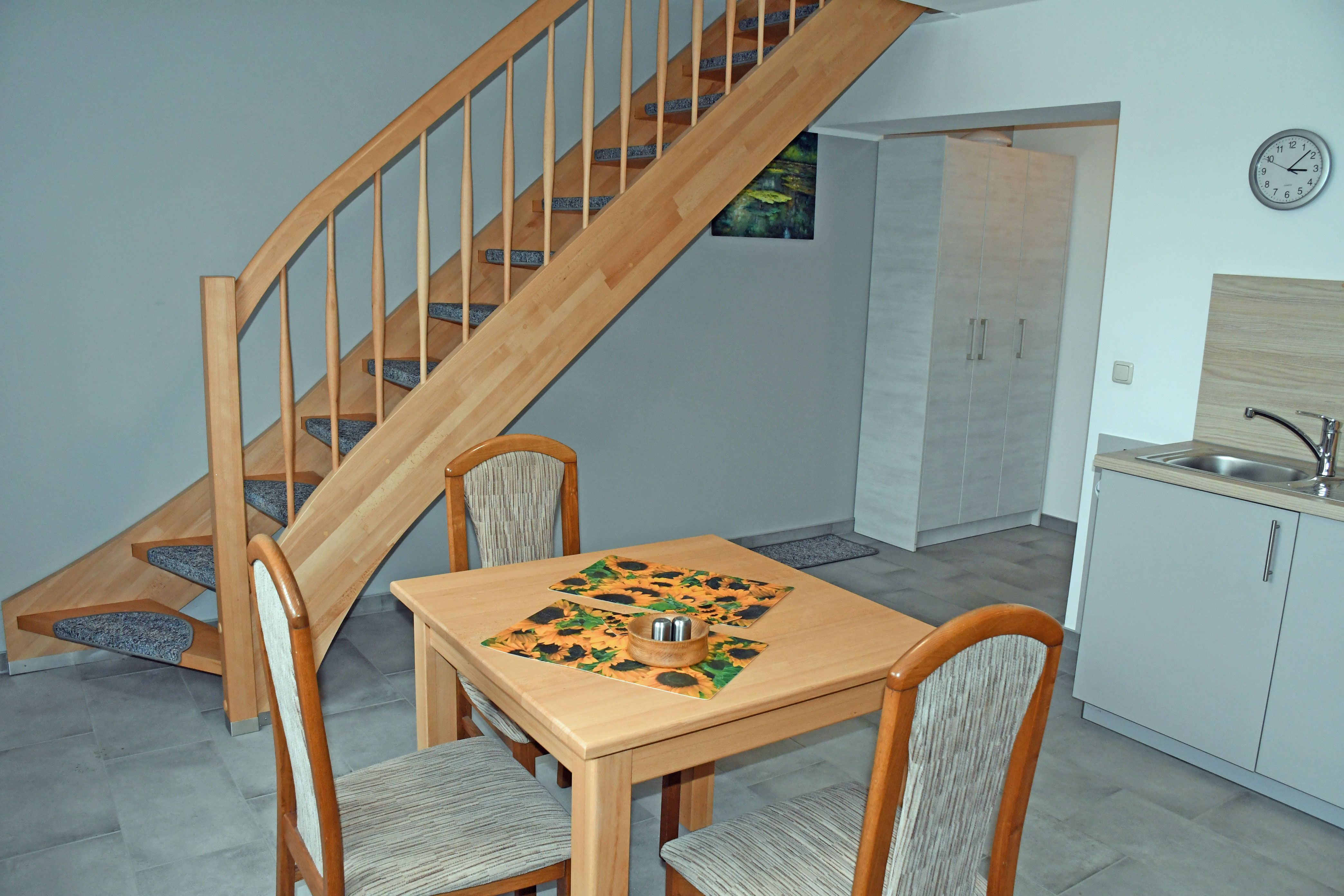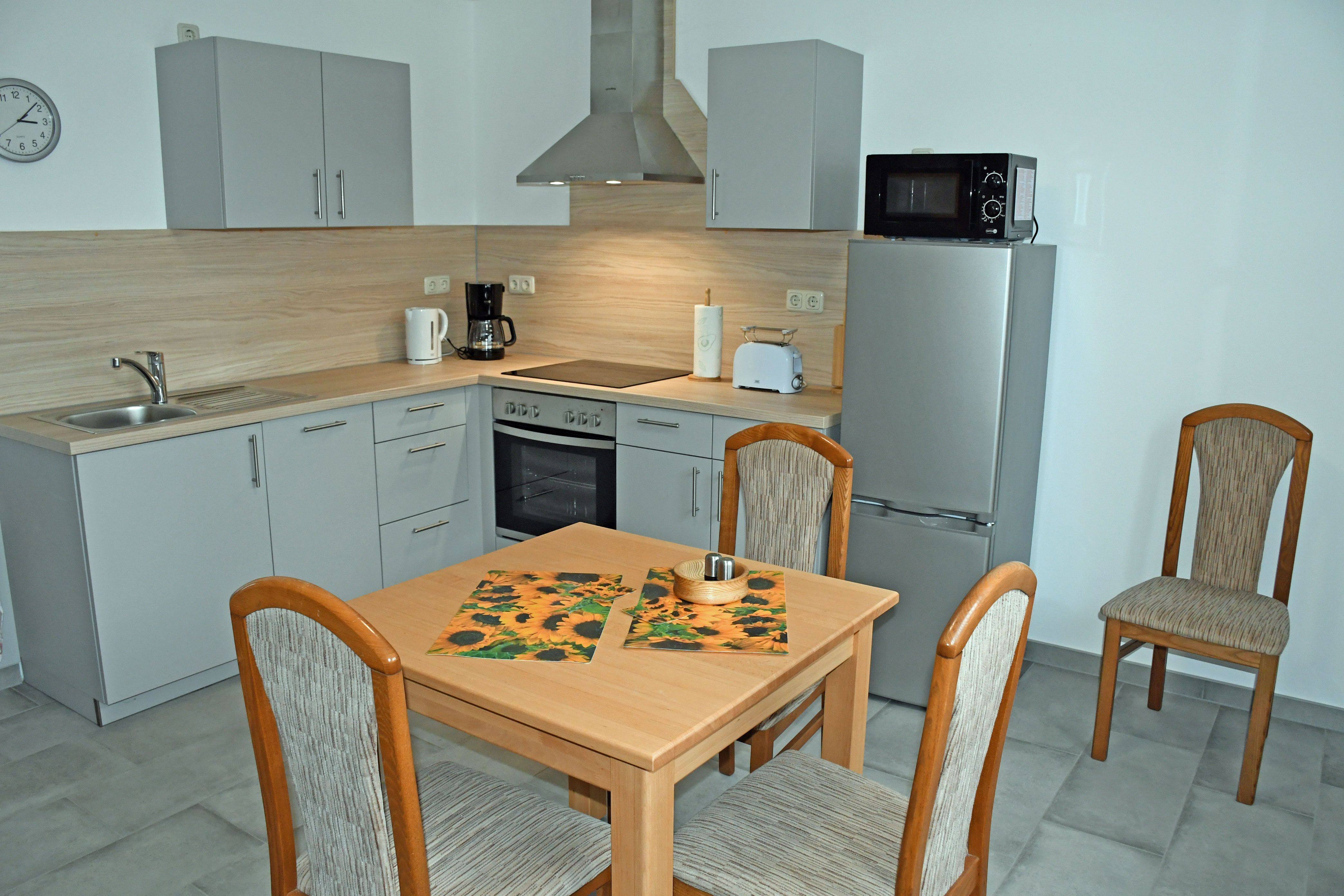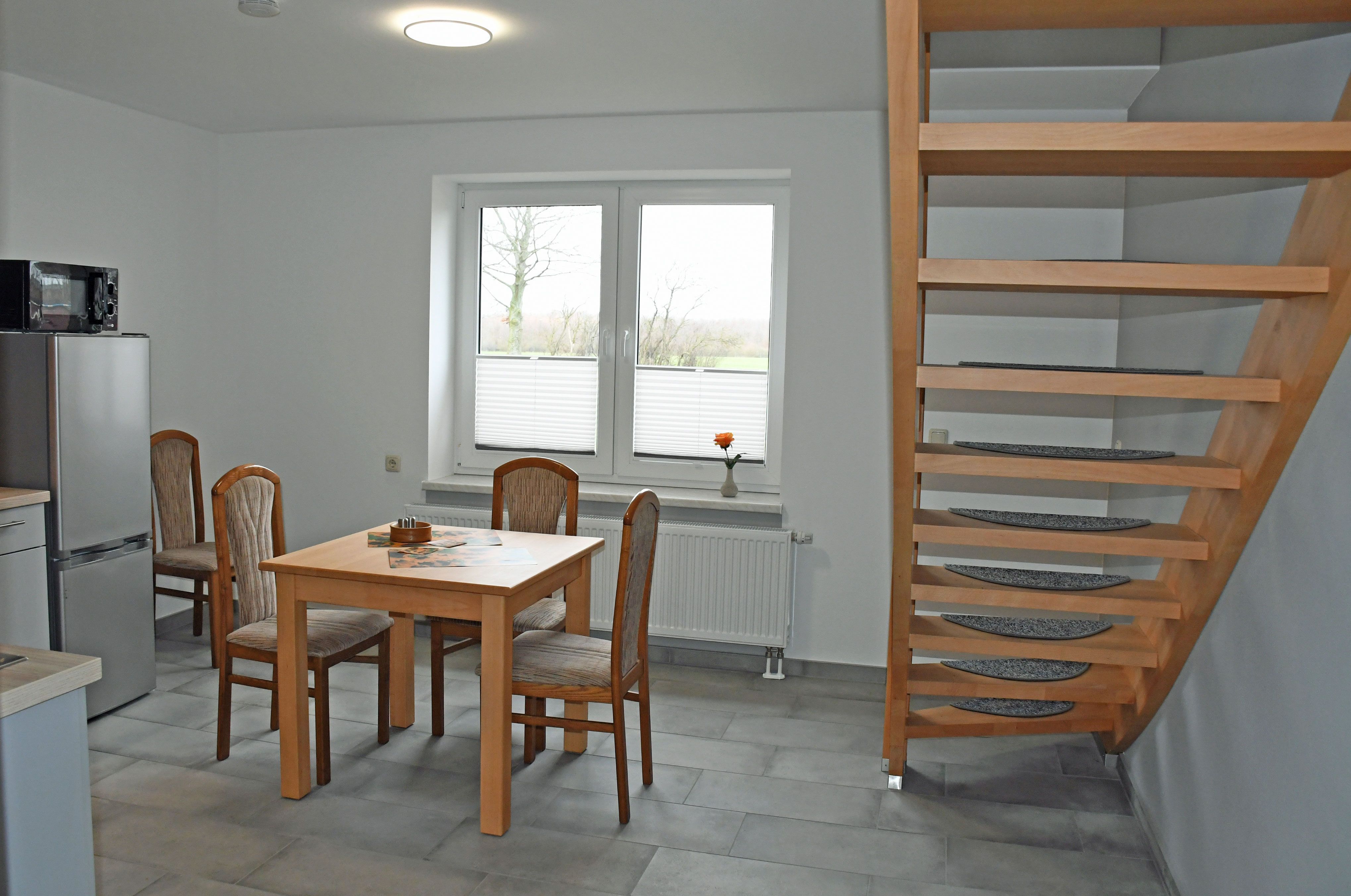 Im Erdgeschoss liegt die Küche. Hier steht auch ein Esstisch mit Stühlen. Die Küchenzeile ist mit einem Herd, Backofen, Wasserkocher, Kaffeemaschine, Toaster und Kühlschrank mit Gefrierfach komplett ausgestattet. Ebenfalls im EG liegt das Bad, es ist mit Dusche, WC und Waschtisch ausgestattet und verfügt über Tageslicht.