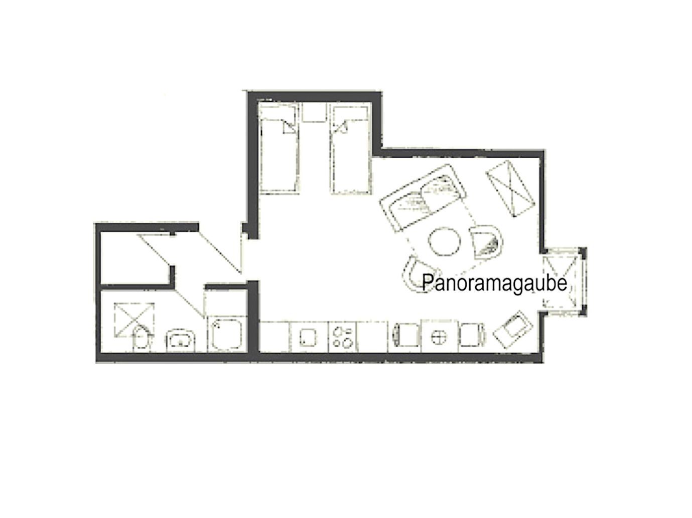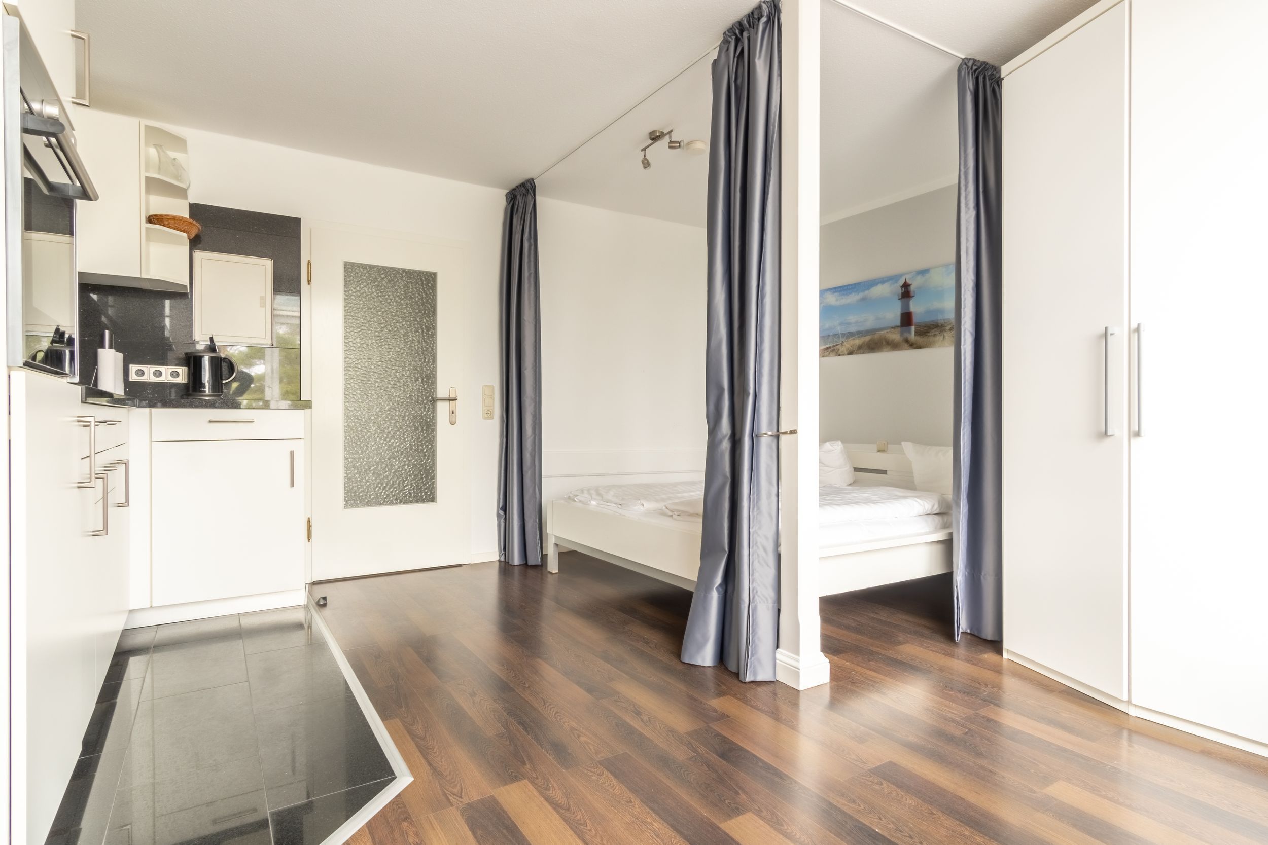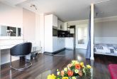 Der lichtdurchflutete Wohn- und Schlafbereich ist offen gestaltet und mit einer praktischen Küchenzeile ausgestattet. Hier finden Sie Ceranherd, Backofen, Kühlschrank, Mikrowelle, Kaffeemaschine, Toaster und Wasserkocher perfekt für kleine Mahlzeiten zwischendurch.