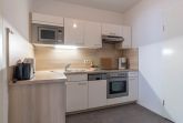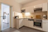 In der Küchenzeile befindet sich ein Ceranherd mit Backofen, eine Dunstabzugshaube, ein Kühlschrank mit Gefrierfach, Geschirrspüler, Elektrogeräte wie Kaffeemaschine, Toaster, Wasserkocher sowie Geschirr, Besteck und Gläser.