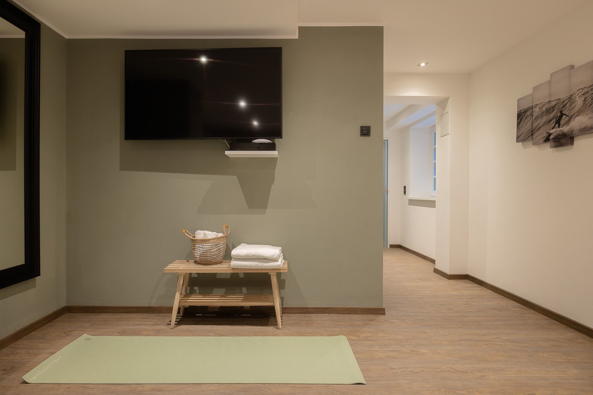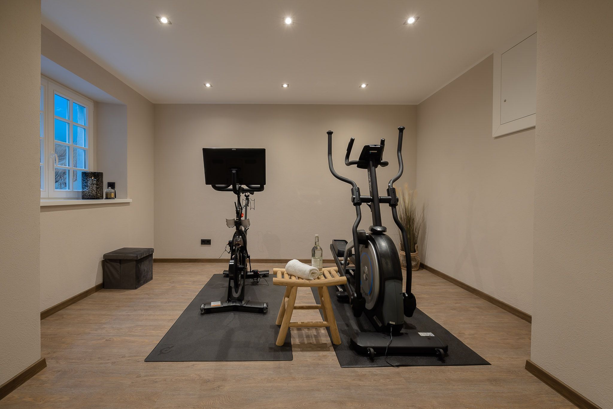 Sie möchten auch in Ihrem Urlaub fit bleiben? Dann nutzen Sie gerne unseren gemeinschaftlichen Fitnessraum mit Peloton®-Bike, Spiegel und Crosstrainer. Sollten Sie Yogamatten vermissen, können Sie diese gerne bei uns dazu buchen. Für eine Runde Entspannung nach dem Sport sorgt unsere Sauna inklusive Liegen.