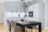 Das geschmackvoll eingerichtete Nichtraucher-Apartment verfügt über Fußbodenheizung, z.T. bodentiefe Fenster, kostenfreies WLAN und eine voll ausgestattete offene Küche mit Geschirrspüler, Kühlschrank mit Gefrierfach, Filterkaffeemaschine, Mixer, Toaster, Wasserkocher, Mikrowelle mit Backofenfunktion und 4-Felder Induktionsherd von BORA sowie über einen behaglichen und großzügigen Wohn-Essbereich. Im Wohnbereich befindet sich ein großer SMART-TV (55 Zoll).