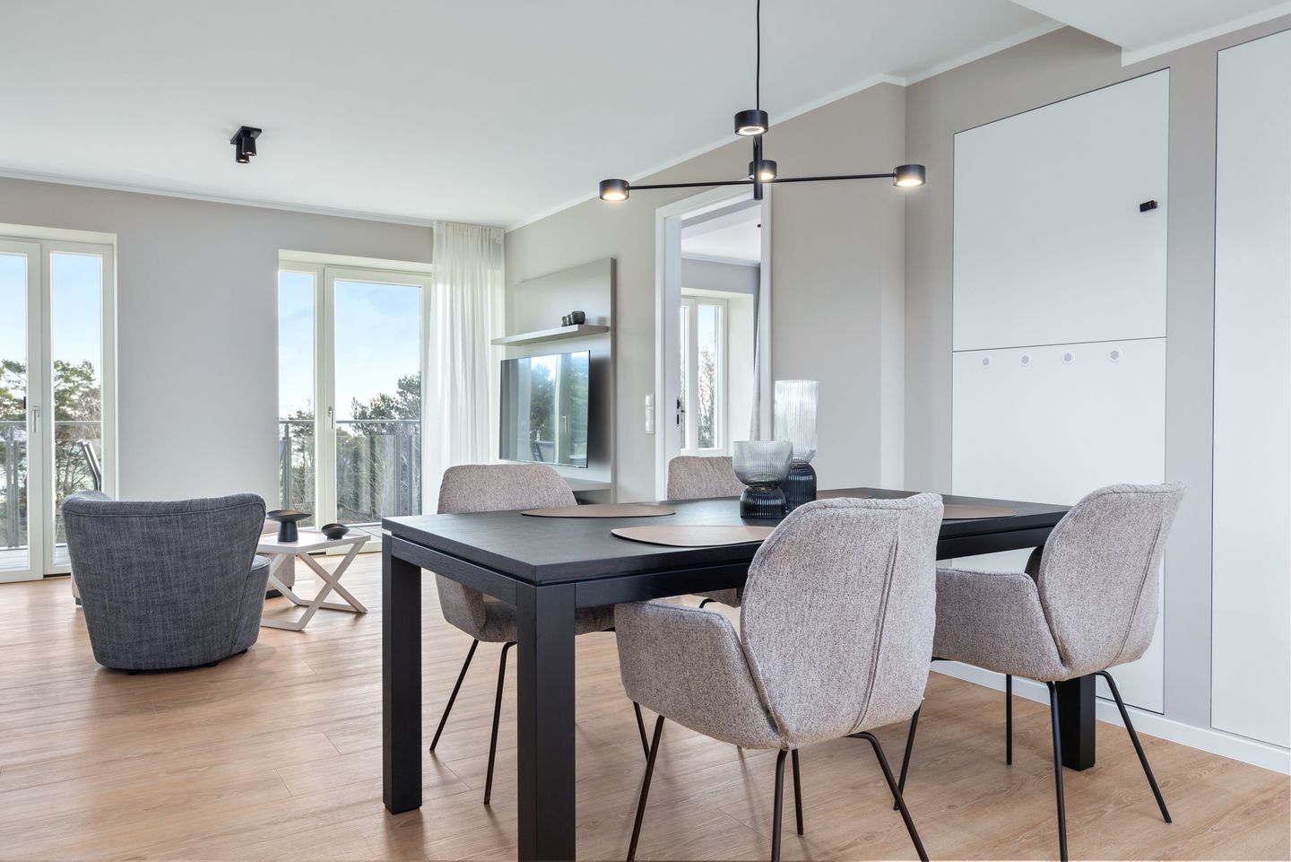 Das lichtdurchflutete Apartment befindet sich in nordöstlicher Lage und befindet sich im vierten Obergeschoss des Hauses Dänholm. Die Ostsee liegt vor der Haustür - in nur 130 Metern erreicht ihr den feinsandigen, kilometerlangen Südstrand. In der Umgebung warten zahlreiche Ausflugsmöglichkeiten auf euren Besuch: Das Dokumentationszentrum Prora, das Prora-Zentrum, das Oldtimer-Museum Rügen, das NVA-Museum Rügen, die Galileo Wissenswelt Rügen, der Kletterwald Binz-Prora und das Naturerbe Zentrum Rügen mit dem Baumwipfel-Pfad sowie das beliebte Karls Erlebnis-Dorf in Zirkow. Fußläufig befinden sich zwei Bäckereien, einige Bistros sowie ein Restaurant, kleine Mode- und Souvenirgeschäfte als auch ein Fahrradverleih. Eine Segelschule befindet sich in ca. 3 km Entfernung. Im nahe gelegenen Dormero Strandhotel (ca. 800 m) könnt ihr Tagestickets erwerben und den Pool, die Sauna und den Fitnessbereich nach Herzenslust genießen.