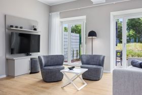 Das lichtdurchflutete Apartment befindet sich in nordöstlicher Lage und verläuft über zwei Wohnebenen, die im Erdgeschoss und im ersten Obergeschoss des Hauses Vilm liegen. Die Ostsee liegt vor der Haustür - in nur 130 Metern erreicht ihr den feinsandigen, kilometerlangen Südstrand. In der Umgebung warten zahlreiche Ausflugsmöglichkeiten auf euren Besuch: Das Dokumentationszentrum Prora, das Prora-Zentrum, das Oldtimer-Museum Rügen, das NVA-Museum Rügen, die Galileo Wissenswelt Rügen, der Kletterwald Binz-Prora und das Naturerbe Zentrum Rügen mit dem Baumwipfel-Pfad sowie das beliebte Karls Erlebnis-Dorf in Zirkow. Fußläufig befinden sich zwei Bäckereien, einige Bistros sowie ein Restaurant, kleine Mode- und Souvenirgeschäfte als auch ein Fahrradverleih. Eine Segelschule befindet sich in ca. 3 km Entfernung. Im nahe gelegenen Dormero Strandhotel (ca. 800 m) könnt ihr Tagestickets erwerben und den Pool, die Sauna und den Fitnessbereich nach Herzenslust genießen.