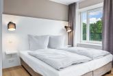 Beide Schlafzimmer beinhalten jeweils ein modernes Boxspring-Doppelbett (1,80 x 2,00 m bzw. 1,60 x 2,00 m) und einen Kleiderschrank. Eines der Schlafzimmer verfügt über einen eigenen SMART-TV (43 Zoll). Das stilvolle Badezimmer verfügt über Fußbodenheizung, Handtuchwärmer, eine ebenerdige Regendusche, WC, Waschtisch und Föhn. Das Apartment verfügt über ein zweites, separates WC.