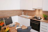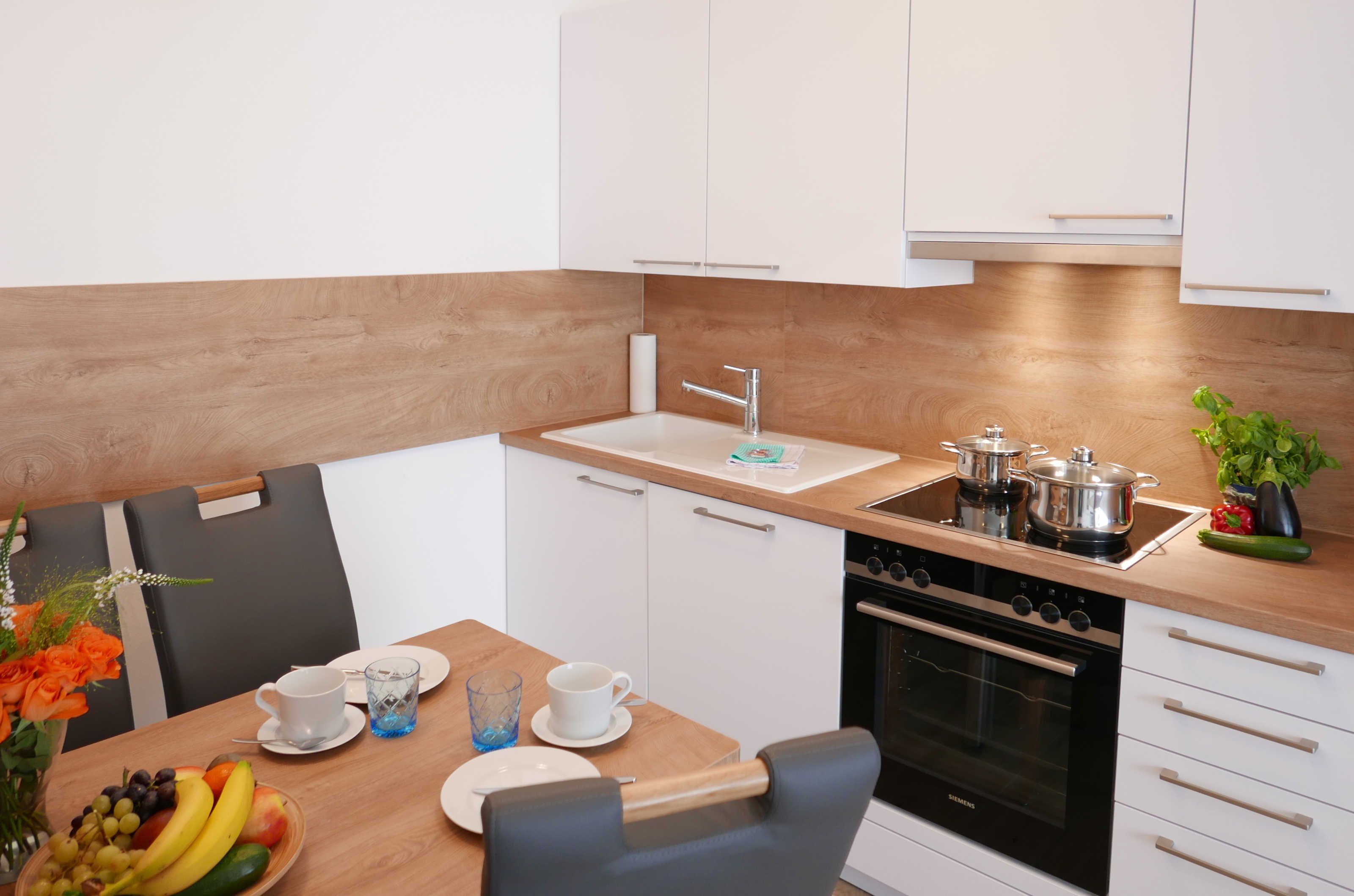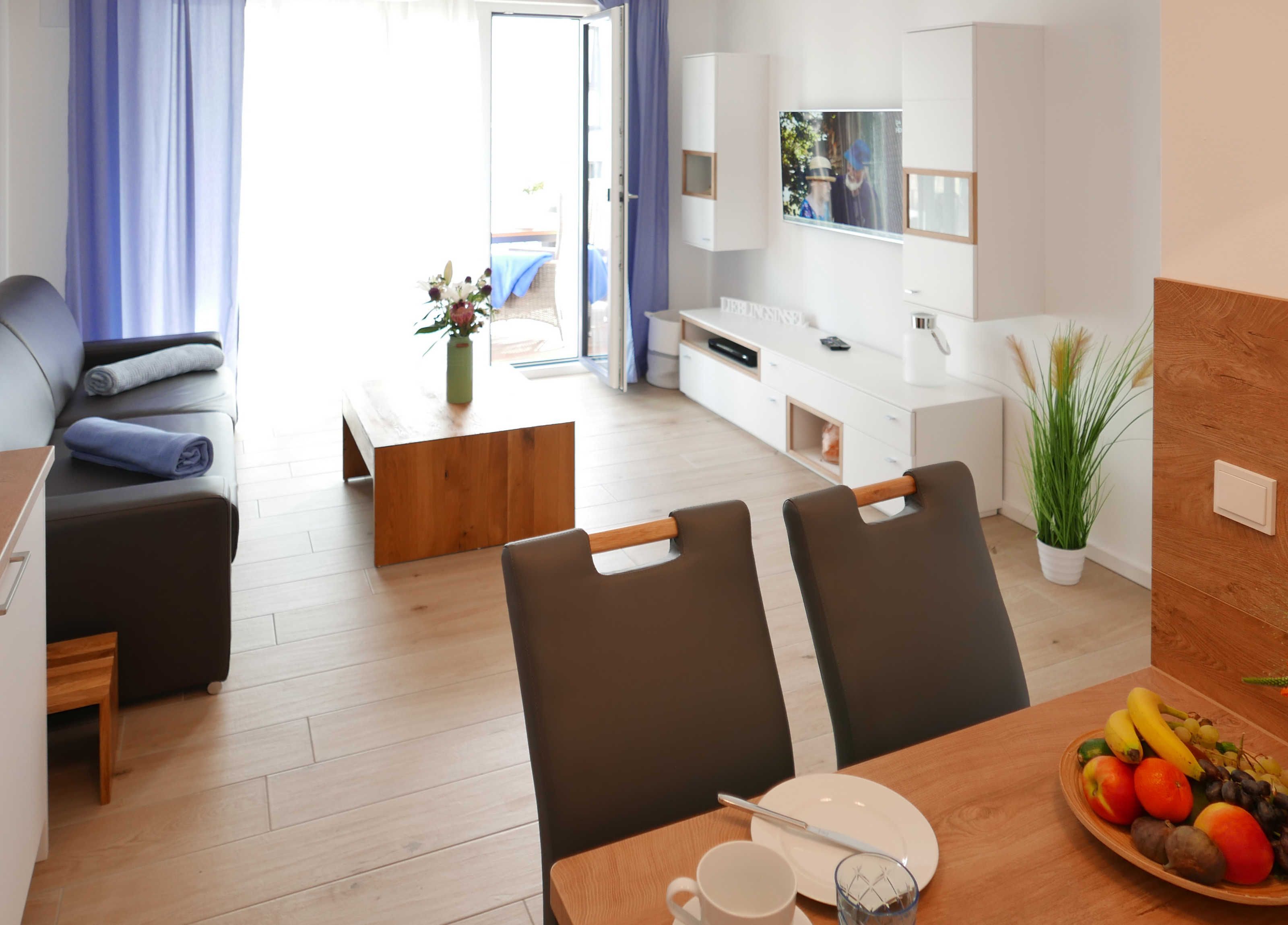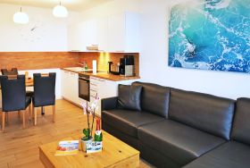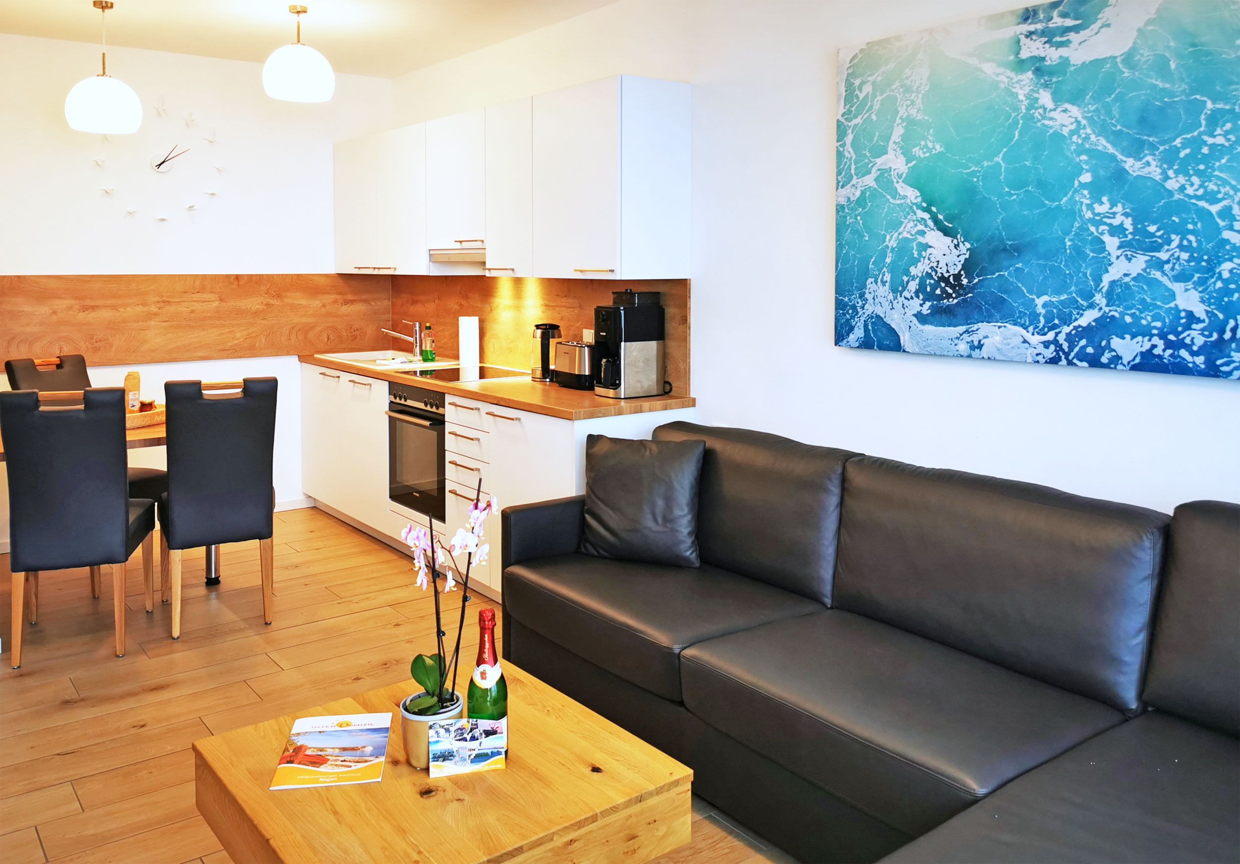 Der helle und offene Wohnbereich ist gemütlich und hochwertig mit Fernseher, Blu-ray Player und Schlafsofa 160 x 200cm eingerichtet. Bücher und Gesellschaftsspiele bieten die Möglichkeit für entspannte Abende. Die integrierte Küchenzeile (verlängert auf 2,8 m) ist gut ausgestattet mit 4-Platten-Ceranherd, Kühlschrank (inkl. Gefrierfach), Backofen, Geschirrspülmaschine, Kaffeemaschine, Toaster und Wasserkocher.