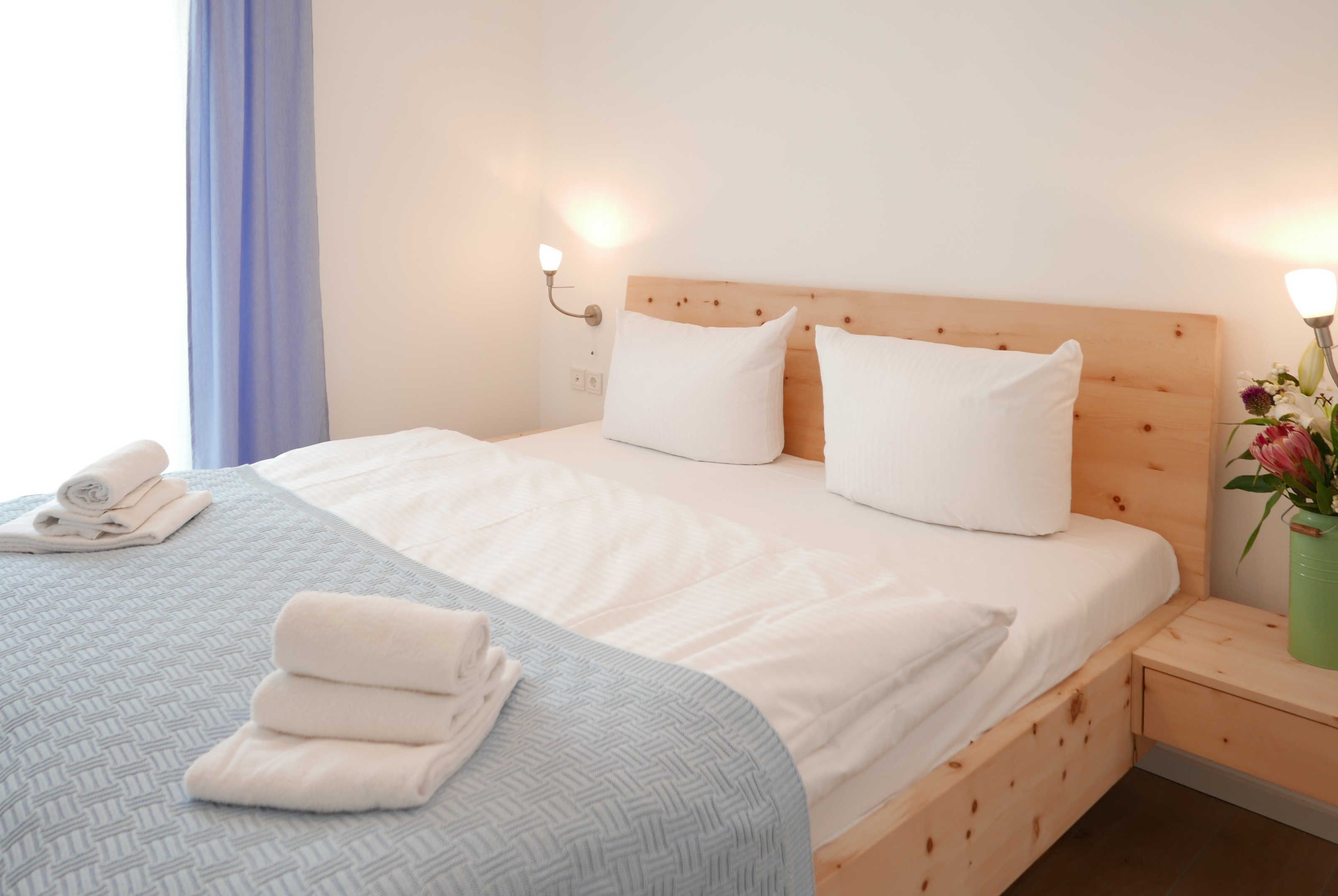 Im Schlafzimmer sorgt ein Doppelbett, Zirbenbett mit Naturlatexmatrazen 180 x 200 cm, für erholsamen Schlaf.