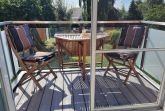 Der Wohn- und Essbereich ist kombiniert eingerichtet und verfügt über eine Sofaecke mit TV-Gerät, WLAN, Radio, einen Esstisch für 4 Personen und den Zugang zum möblierten Balkon.