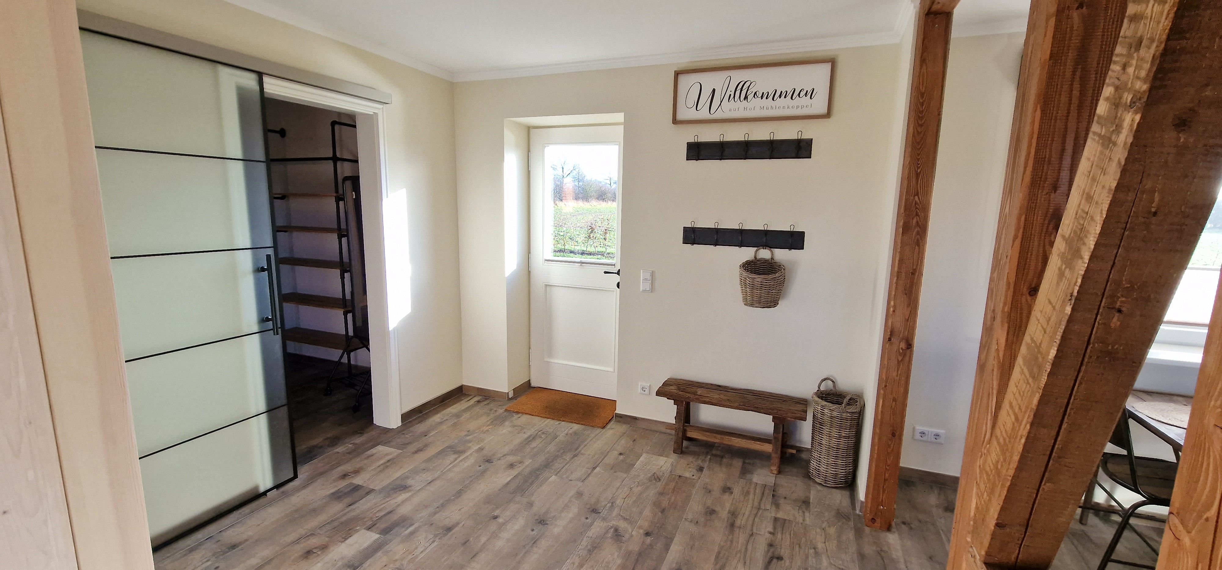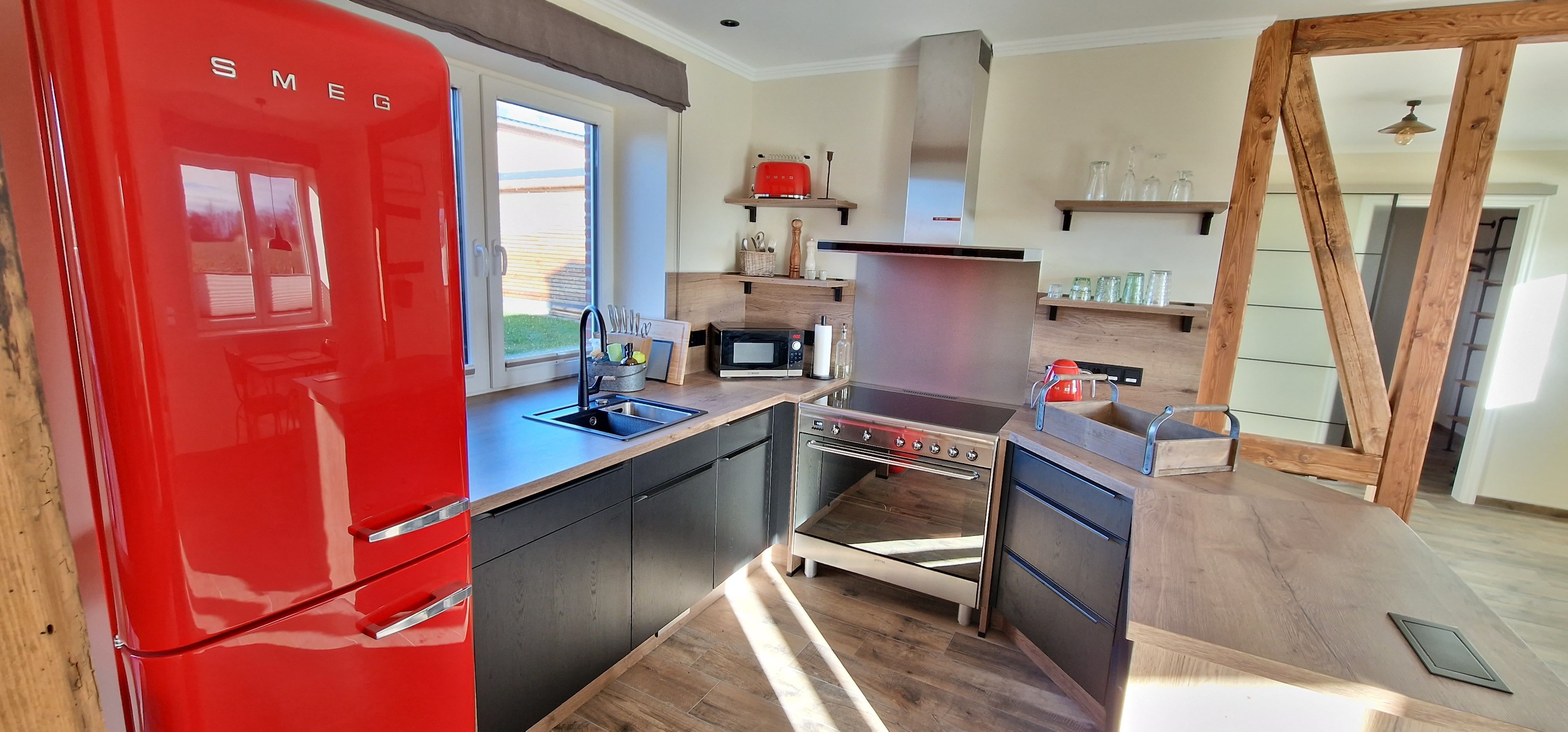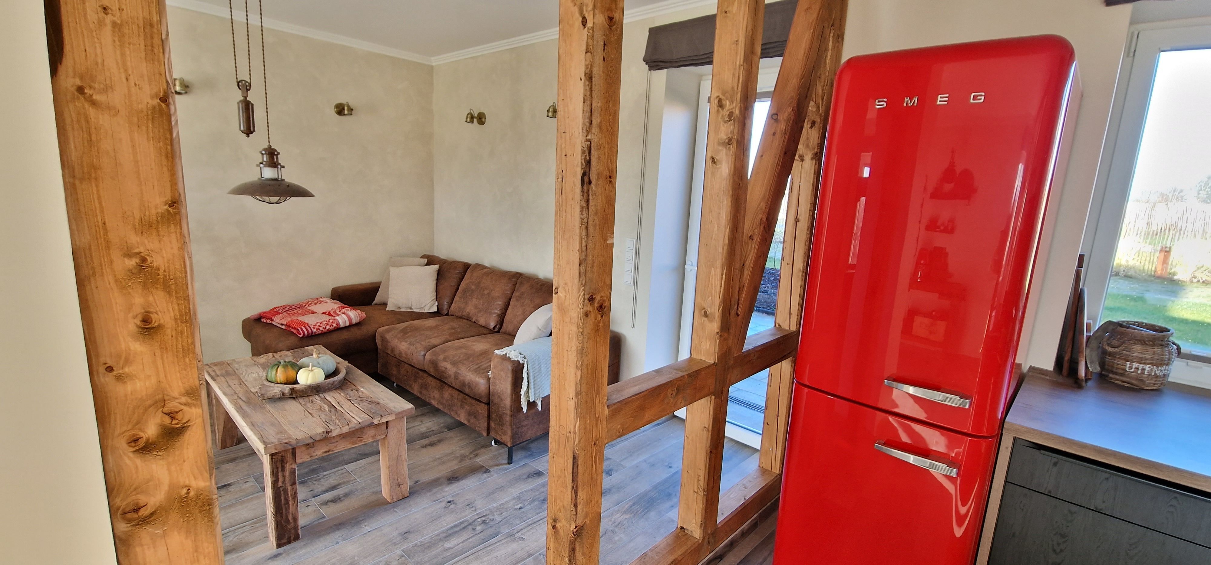 Die Ferienwohnung Klüterkammer im Anbau des ehemaligen Backhauses des Hofes ist in einem charmanten Mix aus Alt und Modern gestaltet und hochwertig ausgestattet. Eine Fußbodenheizung sorgt für angenehme Wärme.
