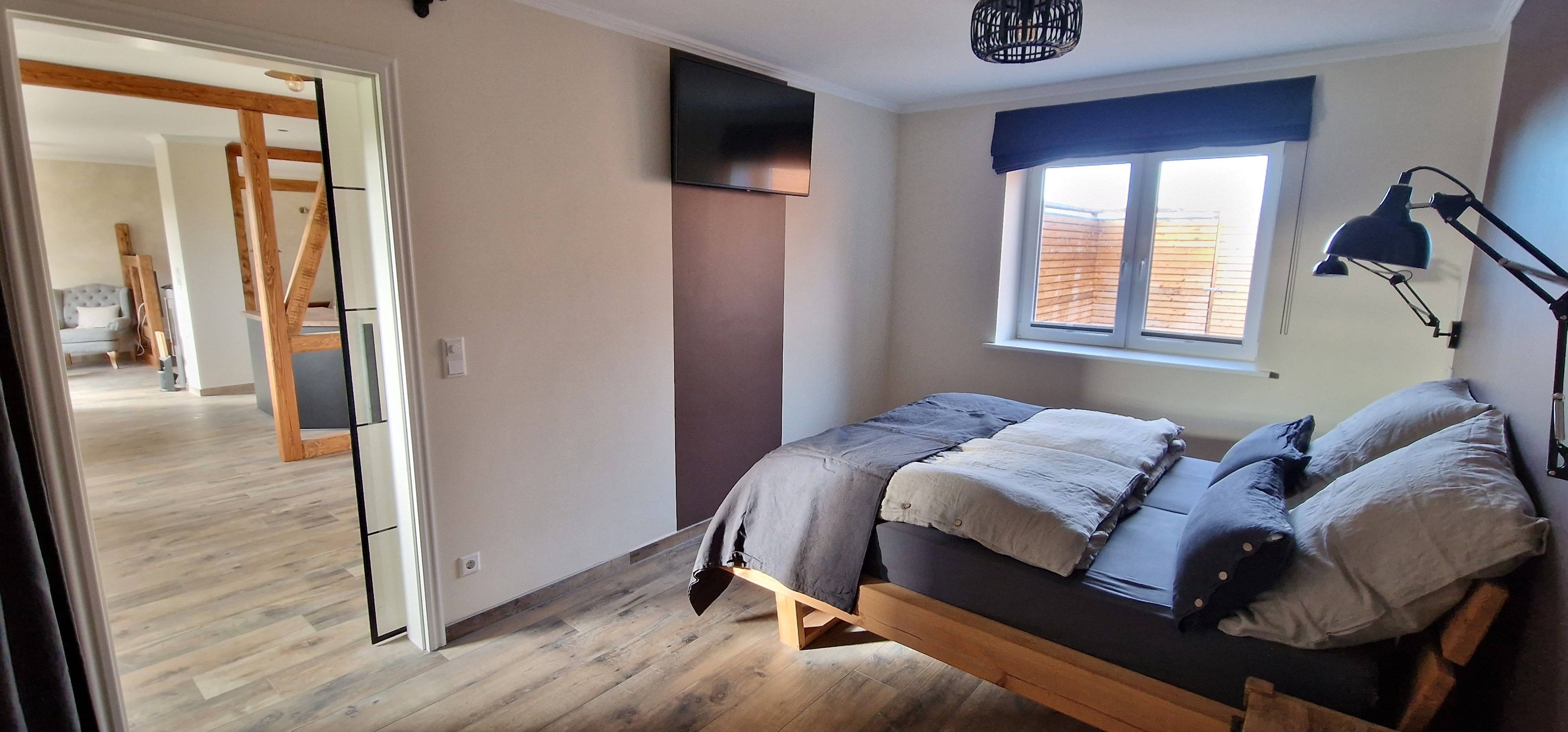 - Schlafzimmer mit Doppelbett (180x200) mit verstellbaren Lattenrosten und TV; Verdunklungsplissees;