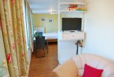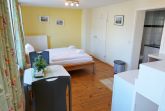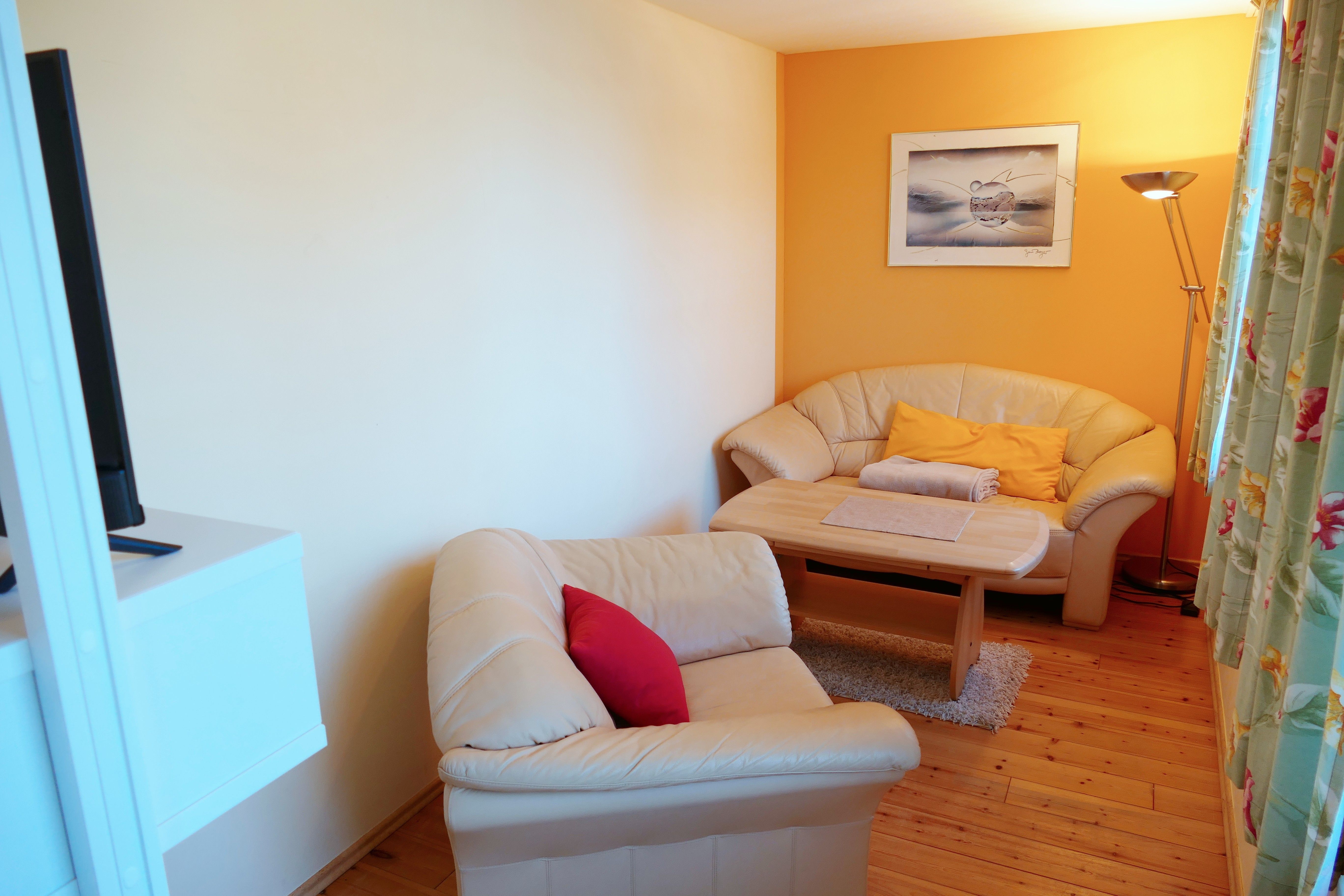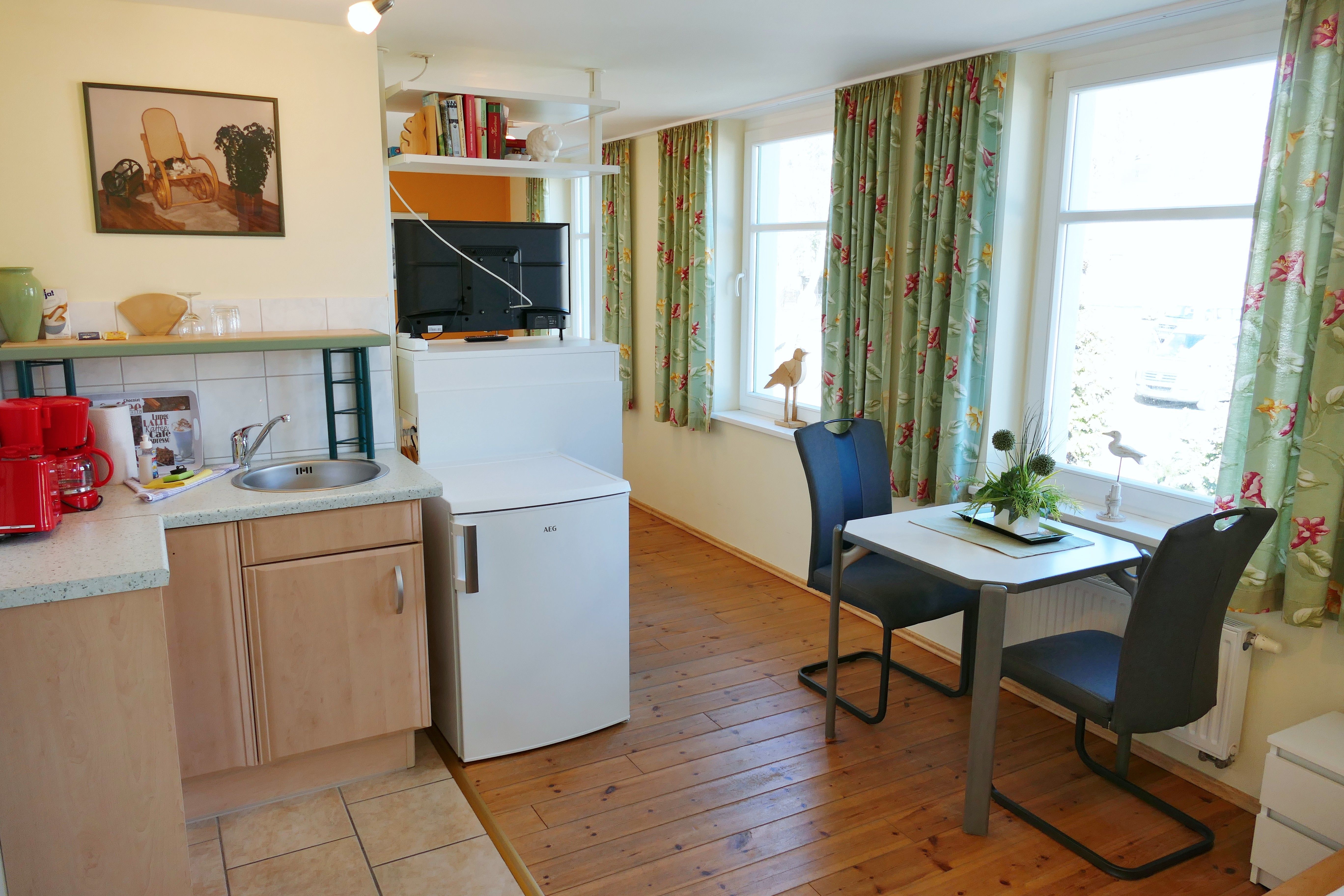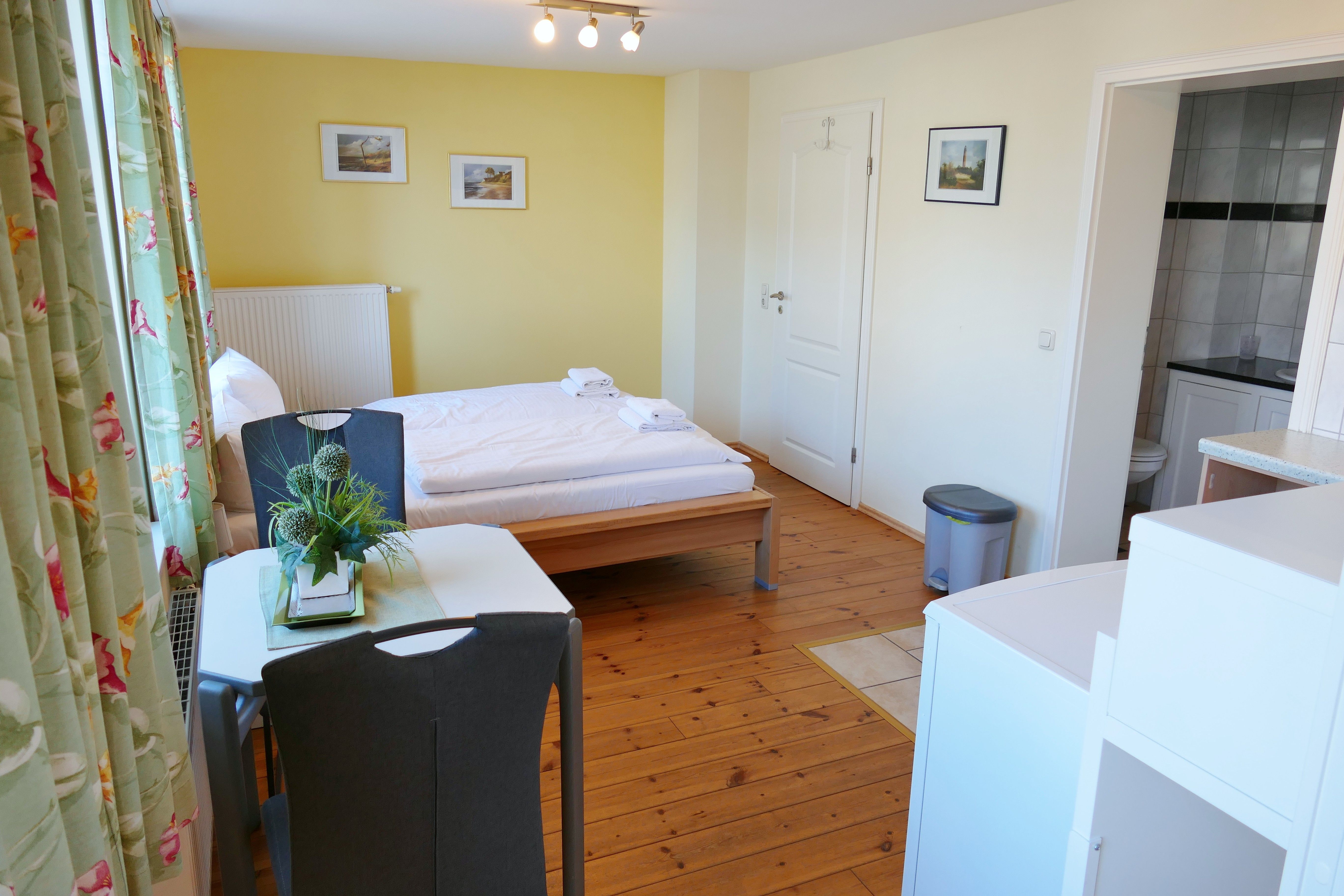 Die 40 qm große Ferienwohnung mit separatem Zugang befindet sich in der ersten Etage. Sie verfügt über einen offenen Wohn- Schlafbereich (mit Doppelbett), der optisch durch die kleine Küchenzeile (Pantry-Küche) getrennt wird.