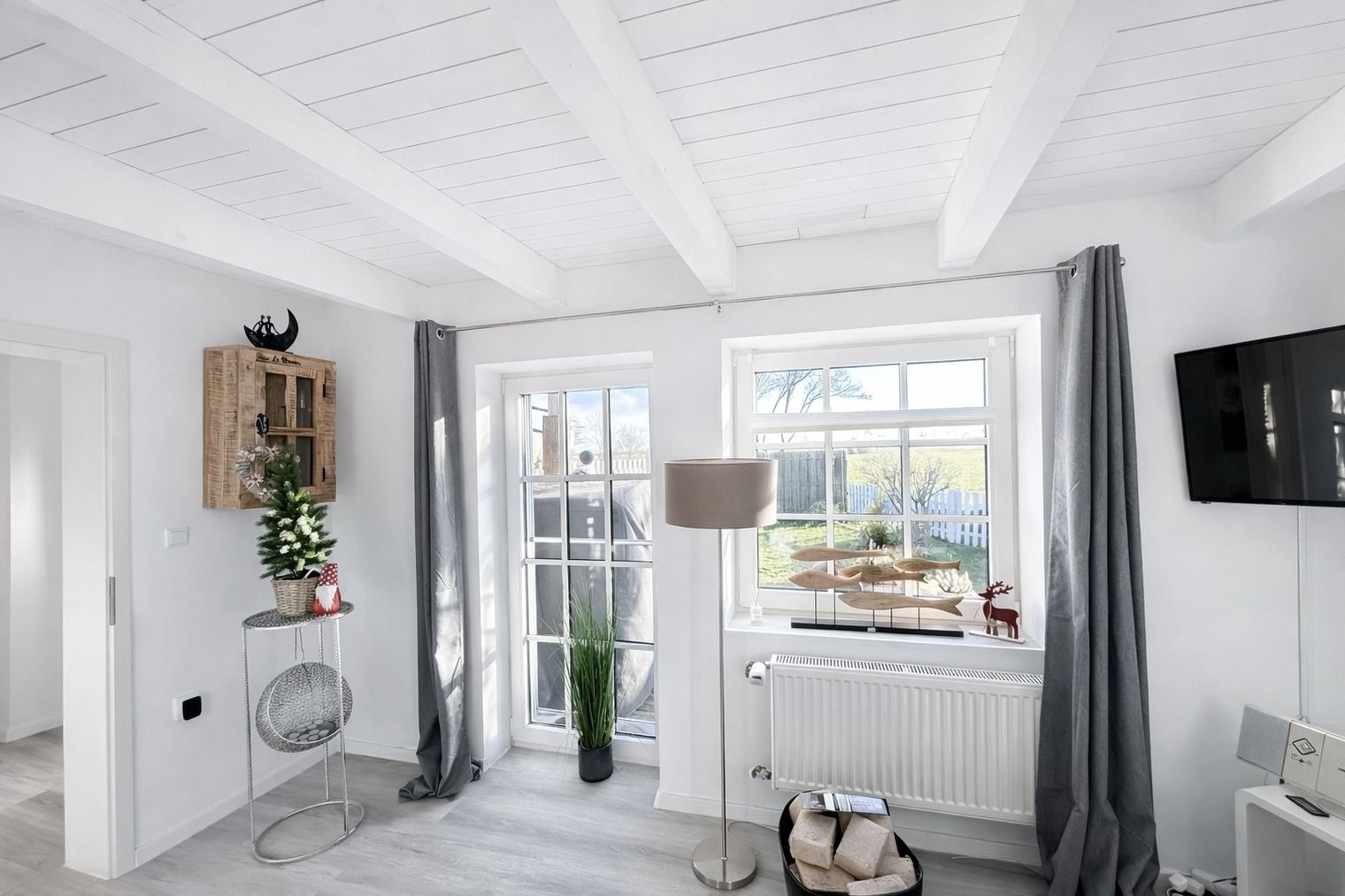 Das freundliche Wohnzimmer lädt mit kleiner Eckcouch, Smart-TV und einem Kaminofen (Holz bitte selbst mitbringen) zu entspannten Abenden ein. Von hier aus gelangen Sie direkt auf die Holzterrasse.
