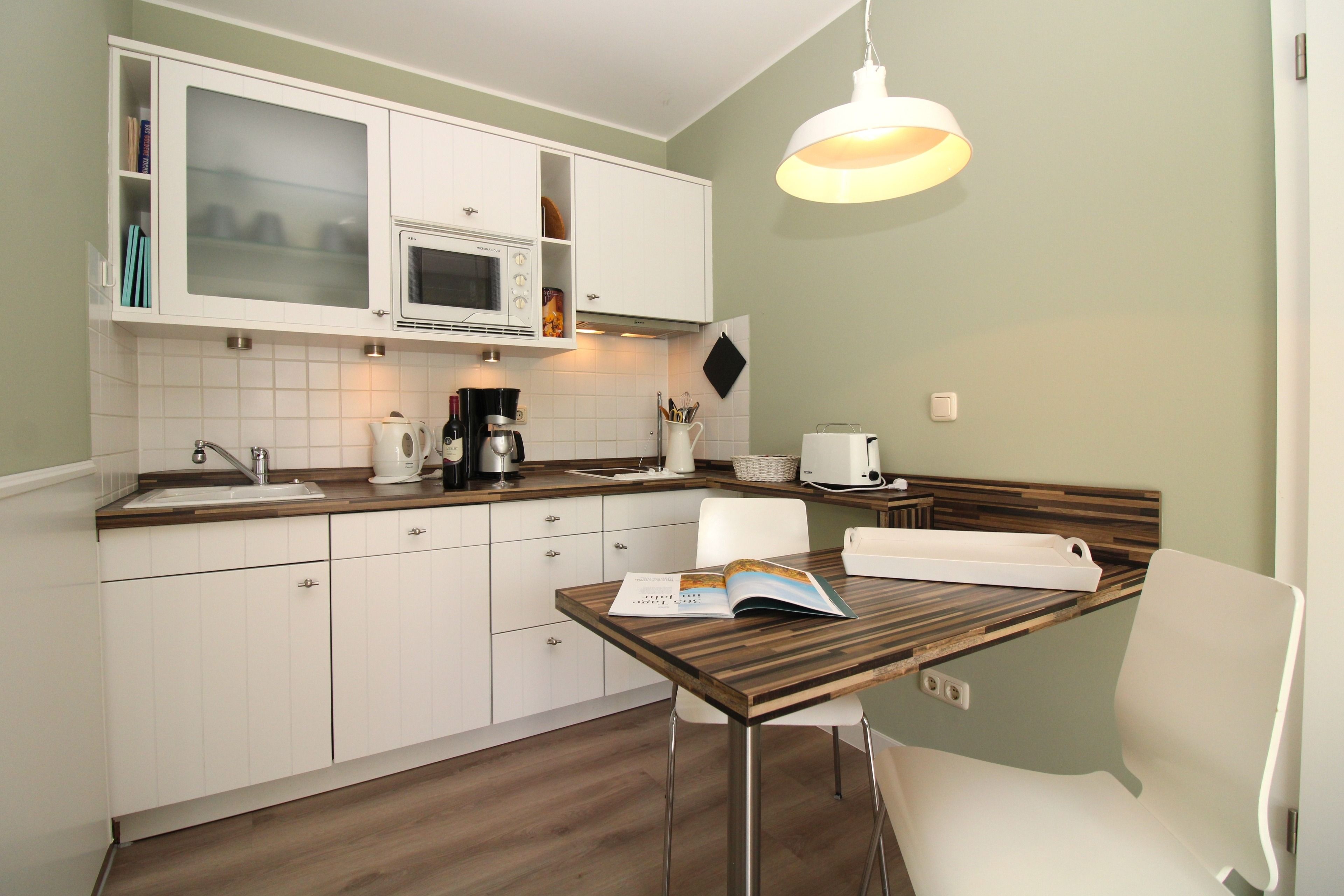 Die offene Küche beinhaltet eine voll ausgestattete Einbauküchenzeile mit 2-Zonen-Ceran-Kochfeld, Dunstabzug, Mikrowelle, Kühlschrank mit Gefrierfach, Geschirrspülmaschine, Kaffeemaschine, Wasserkocher und Toaster. Auf Wunsch stellen wir Ihnen auch gerne einen portablen Backofen zur Verfügung. Die Küche ist mit Geschirr, Gläsern, Besteck und Töpfen komplett ausgestattet. Der Küchenbereich verfügt weiterhin über einen kleinen Tresen mit 2 Stühlen für den kleinen Hunger zwischendurch.