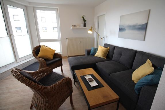 Sie wohnen in einem 3-Zimmer-Appartement für bis zu 4 Personen auf ca. 43 m² Wohnfläche im 1. Obergeschoss, welche über eine Treppe oder mit dem Fahrstuhl erreichbar ist: