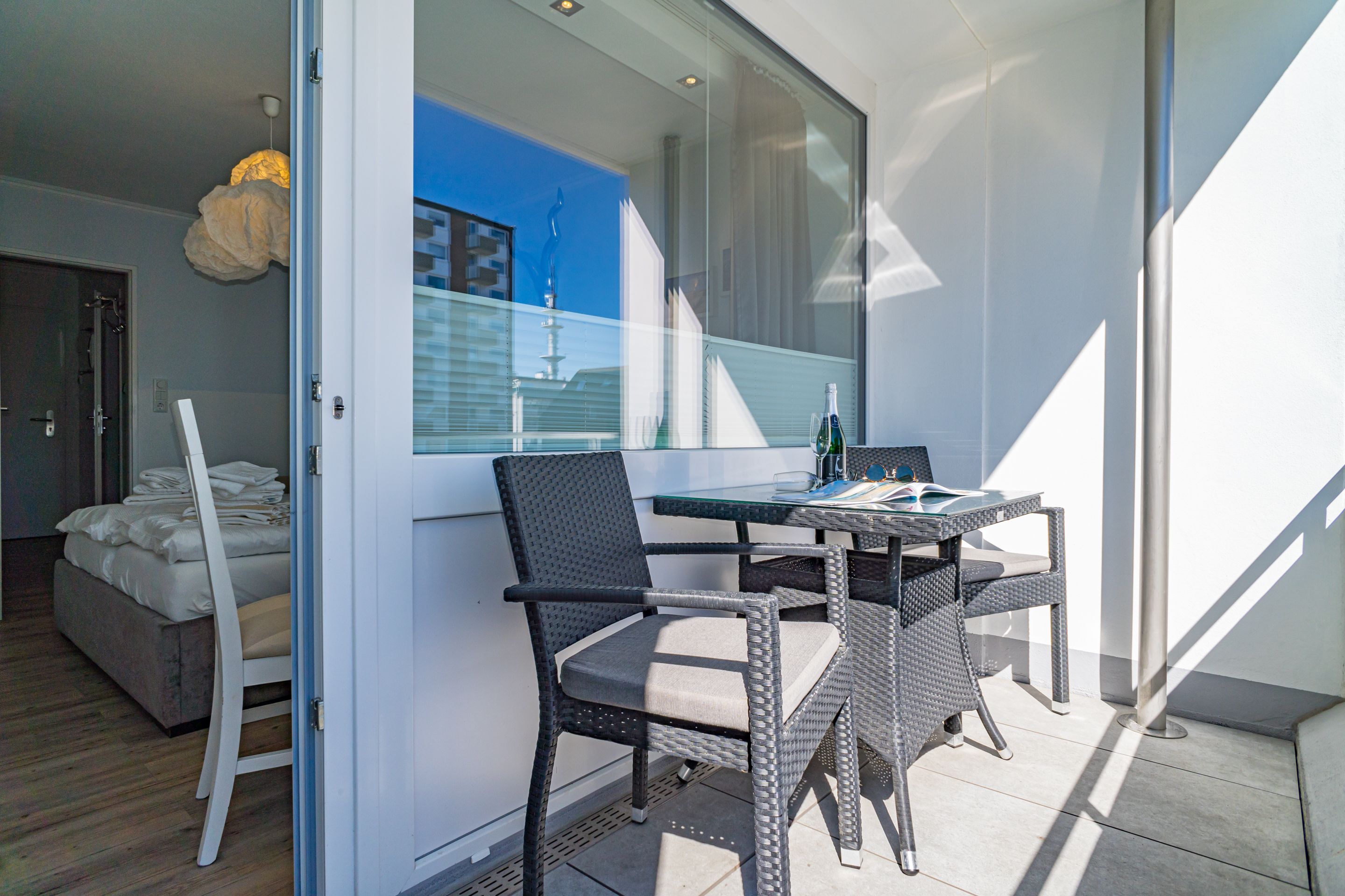 Im Strandhausstil gestaltete und renovierte 1-Zimmer-Nichtraucher-Ferienwohnung, ca. 23 qm in der 1. Etage zur Landseite mit Ostloggia (Morgensonne, mit Balkonmöbeln und Auflagen) für max. 2 Personen.