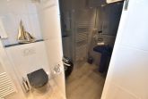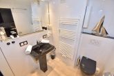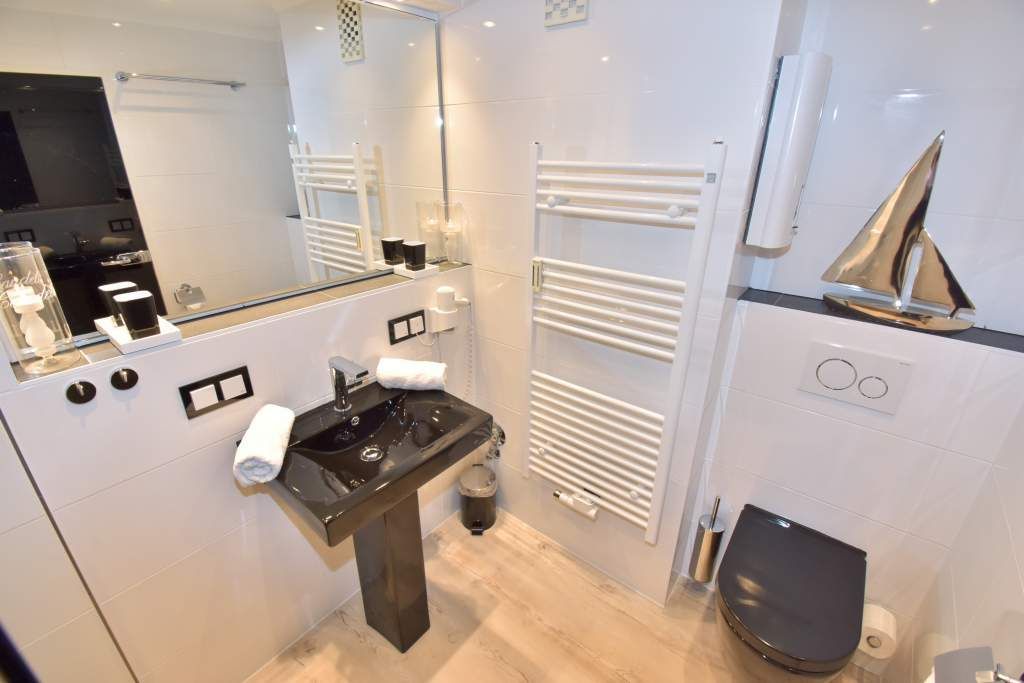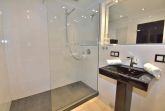Im neuen, modernen Badezimmer befinden sich eine Walk-In-Dusche mit Regendusche und besonders flachem Einstieg, ein WC, ein Waschtisch, ein Handtuchtrockner und ein Fön.