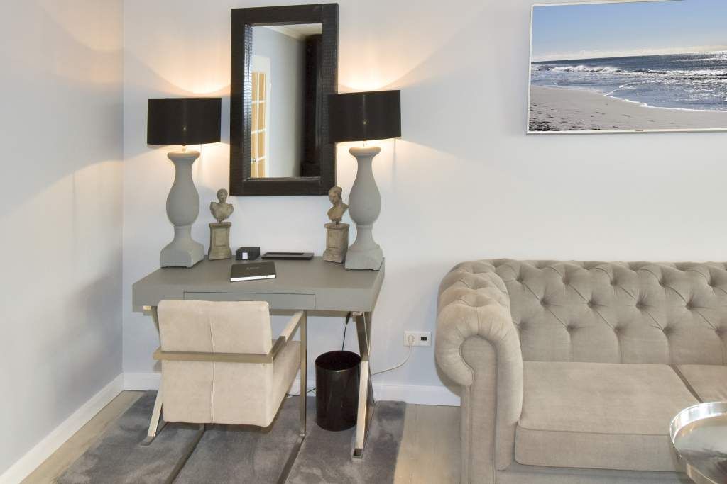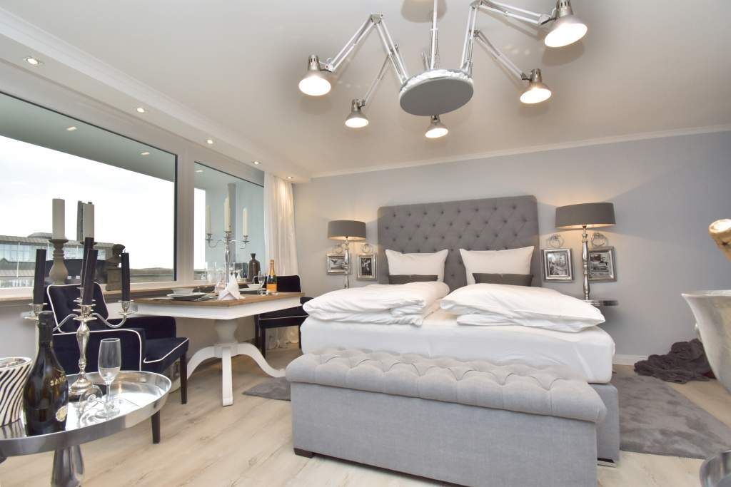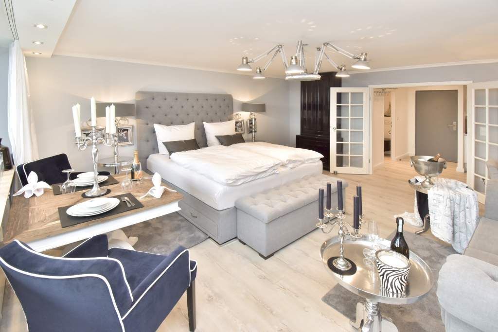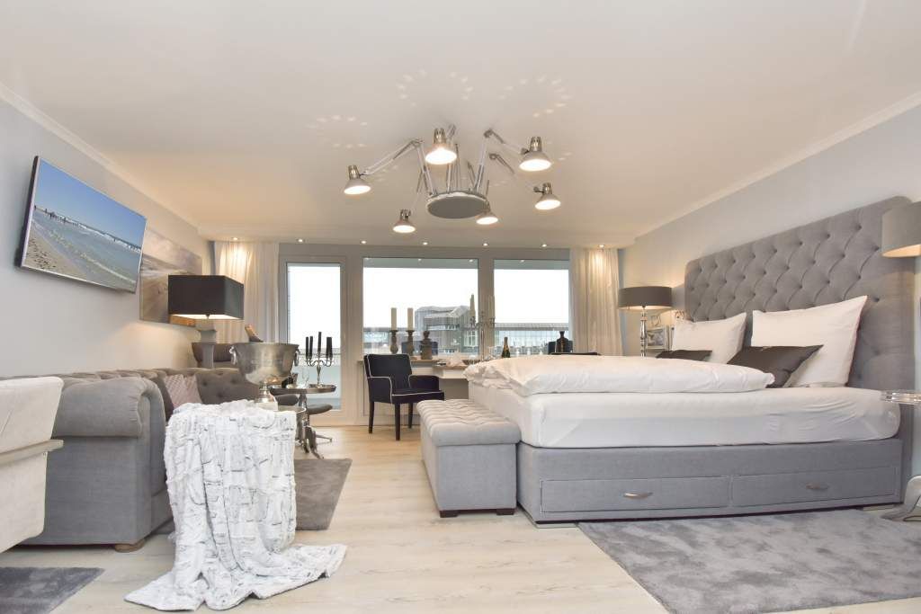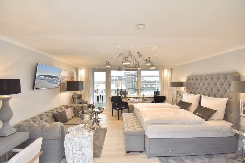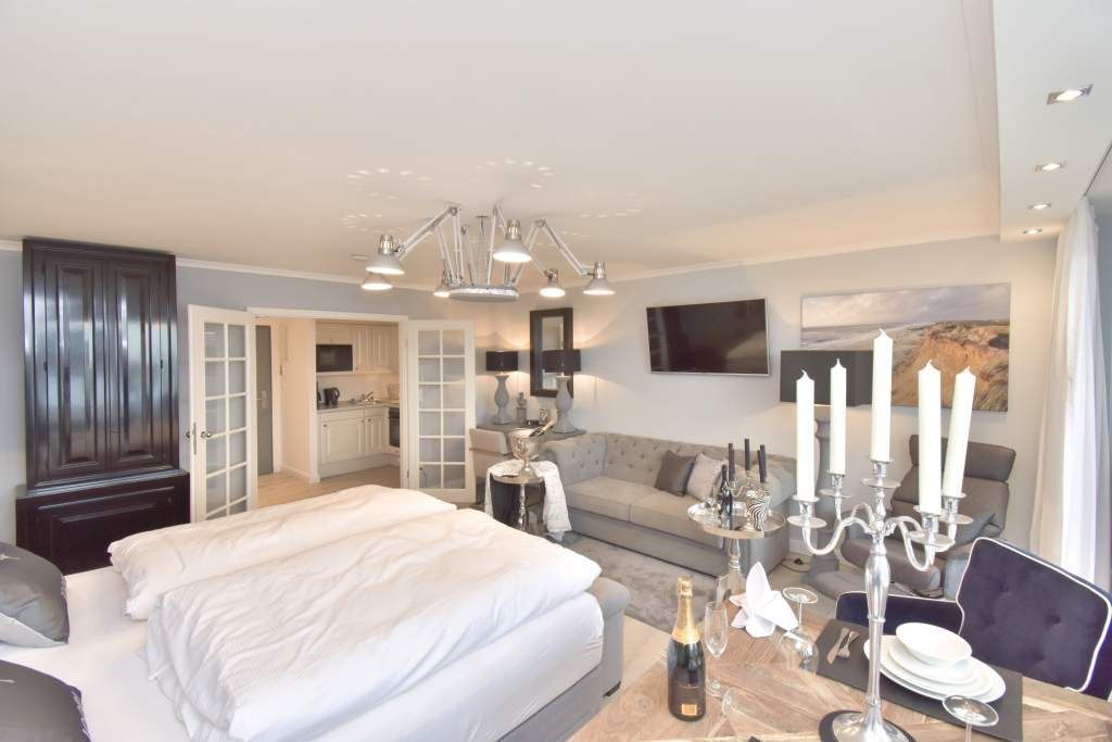Der im exklusiven flämischen Landhausstil eingerichtete Wohn-/Schlafraum besteht aus einem sehr hochwertigem Sofa (2,5-Sitzer), einem neuen luxuriösen Boxspringbett (Liegefläche 1,80 x 2,00 m mit zwei Einzelmatratzen und einem durchgängigem Topper), einem gemütlichen Essplatz, einem Schreibtisch und einem Kabel-Flachbild-TV, Radio/CD sowie abdunkelnden Gardinen (Black out).