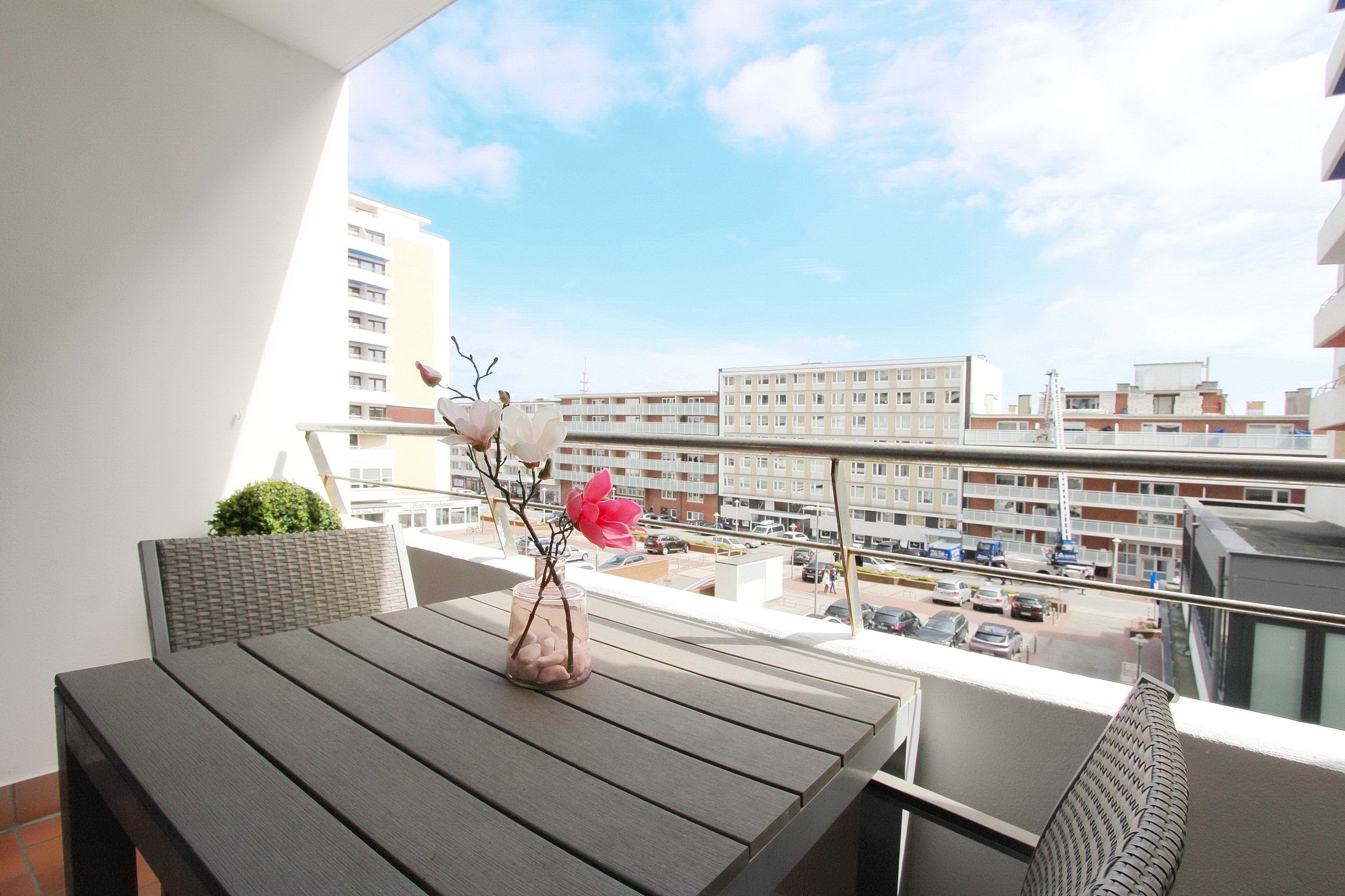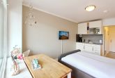 Einzimmerappartement in der 1. Etage im Haus Metropol mit Balkon (ausgestattet mit 2 Stühlen und Tisch) zur Landseite.