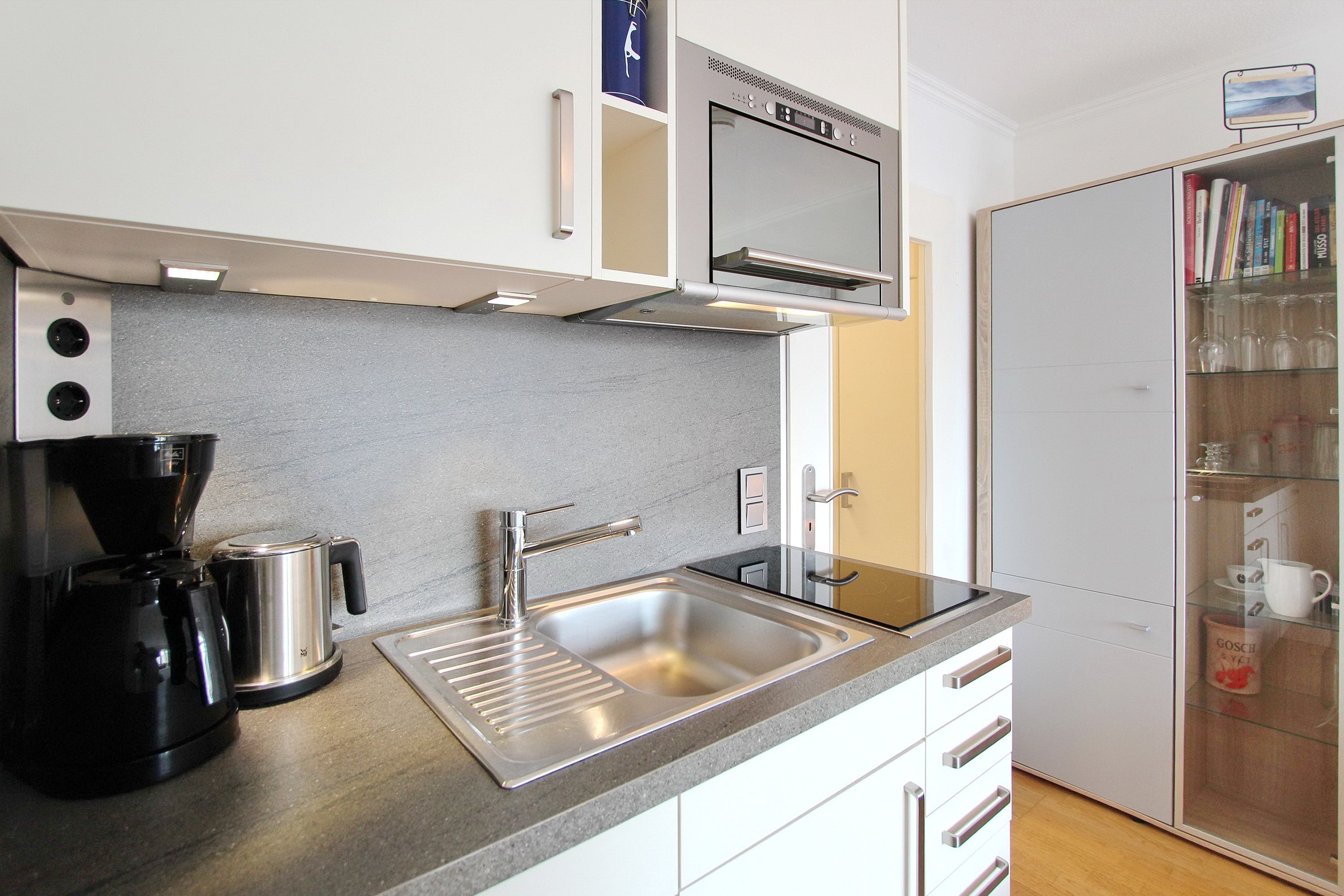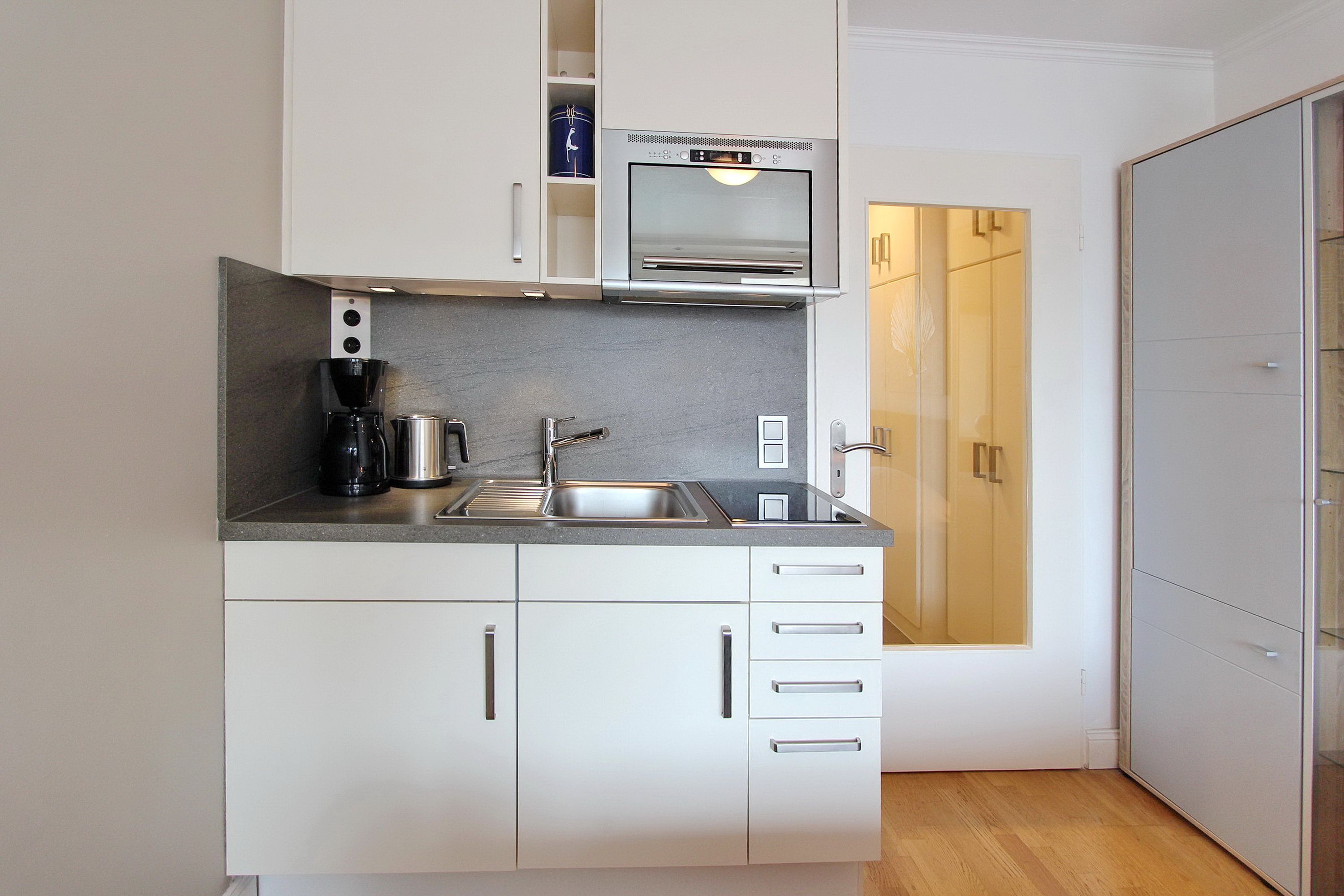 Die mit viel Liebe zum Detail eingerichtete Wohnung verfügt über einen Wohn-Schlafraum mit integrierter Küchenzeile. Um sich selbst zu verpflegen stehen ihnen ein 2 Platten Ceranfeld und eine Mikrowellen Backkombination zur Verfügung.